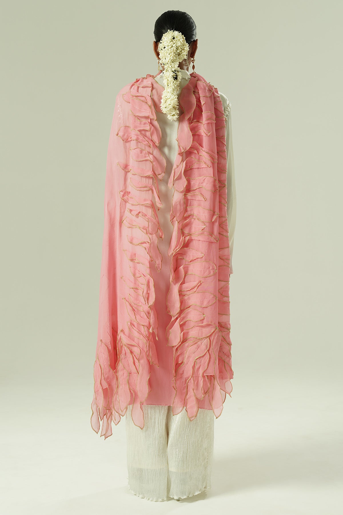 Ivory and pink satin, georgette and organza kurta set featuring beadwork on full sleeves kurta paired with straight pants and leaflet dupatta