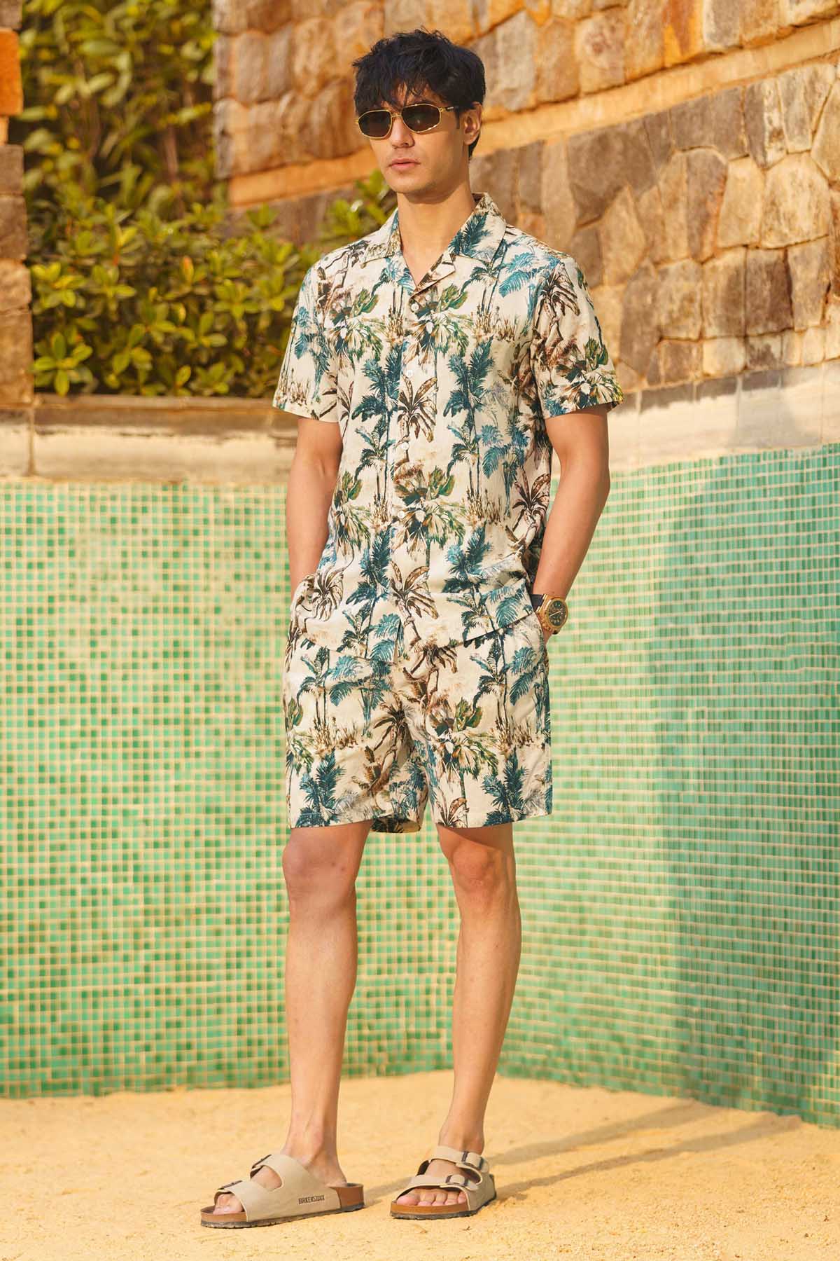 Beige Tropical Printed Shorts, Turn-Up Fold Hem Shorts, Green Bemberg Modal Silk Shorts, Turn-Up Fold Hem Shorts, White Cotton Linen Shorts