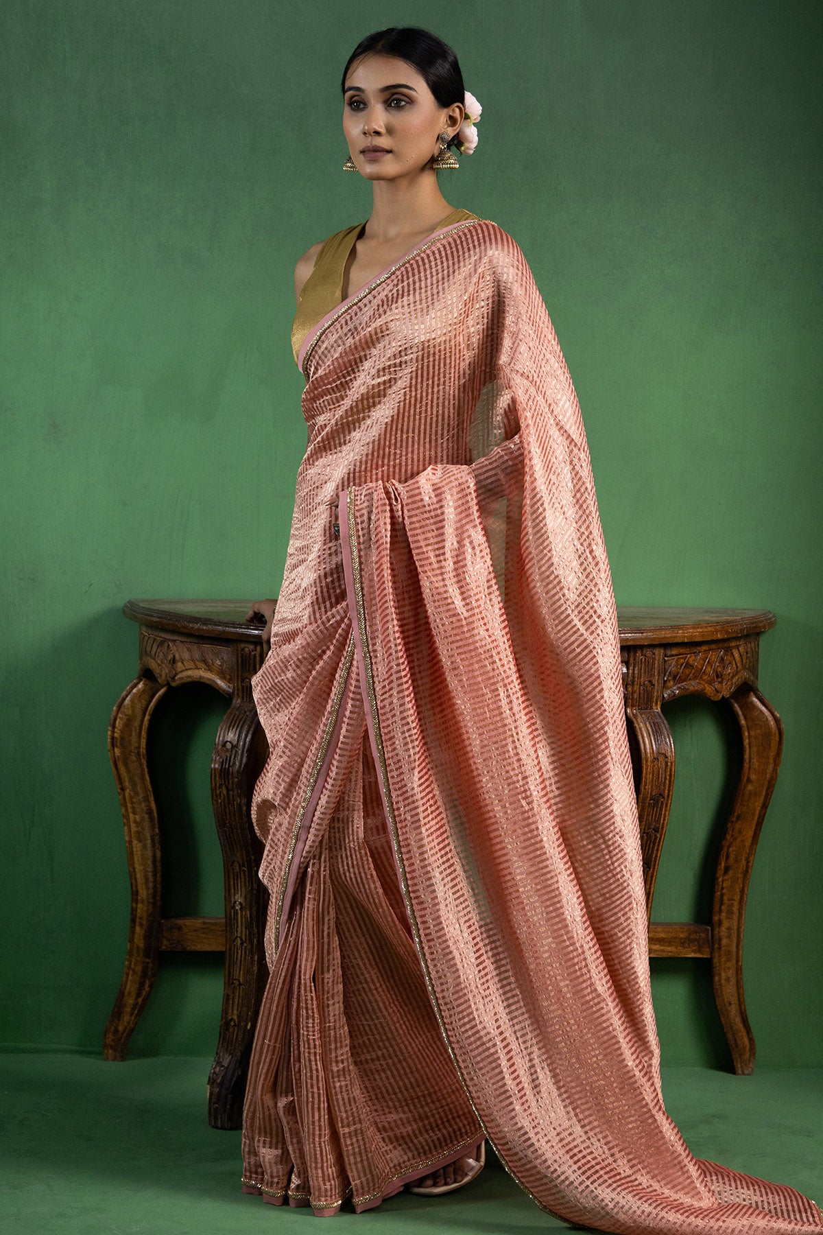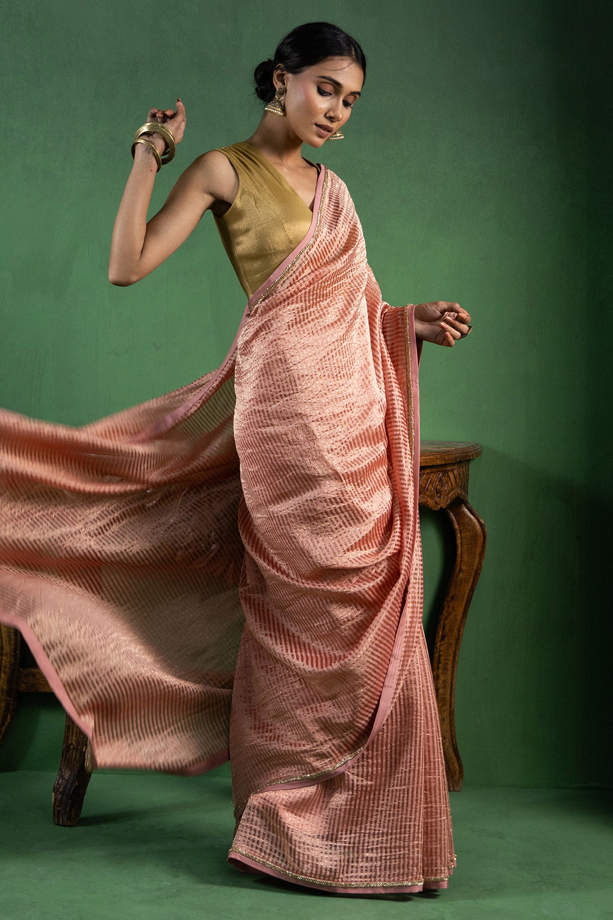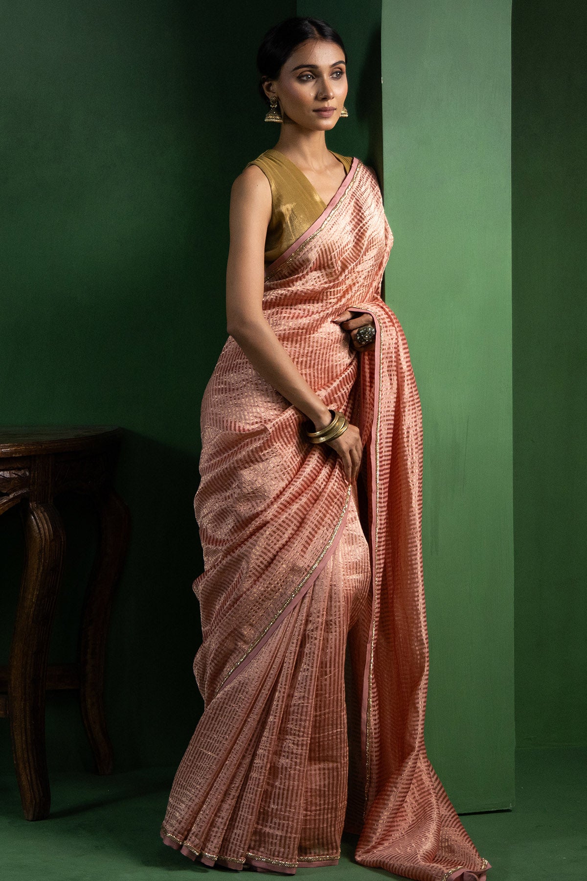 Coral chanderi zari & chanderi jacquard saree featuring adda embroidery border saree with cutdana & woven zari stripes paired with unstitched blouse piece