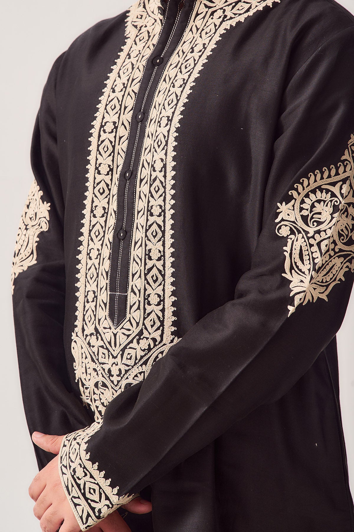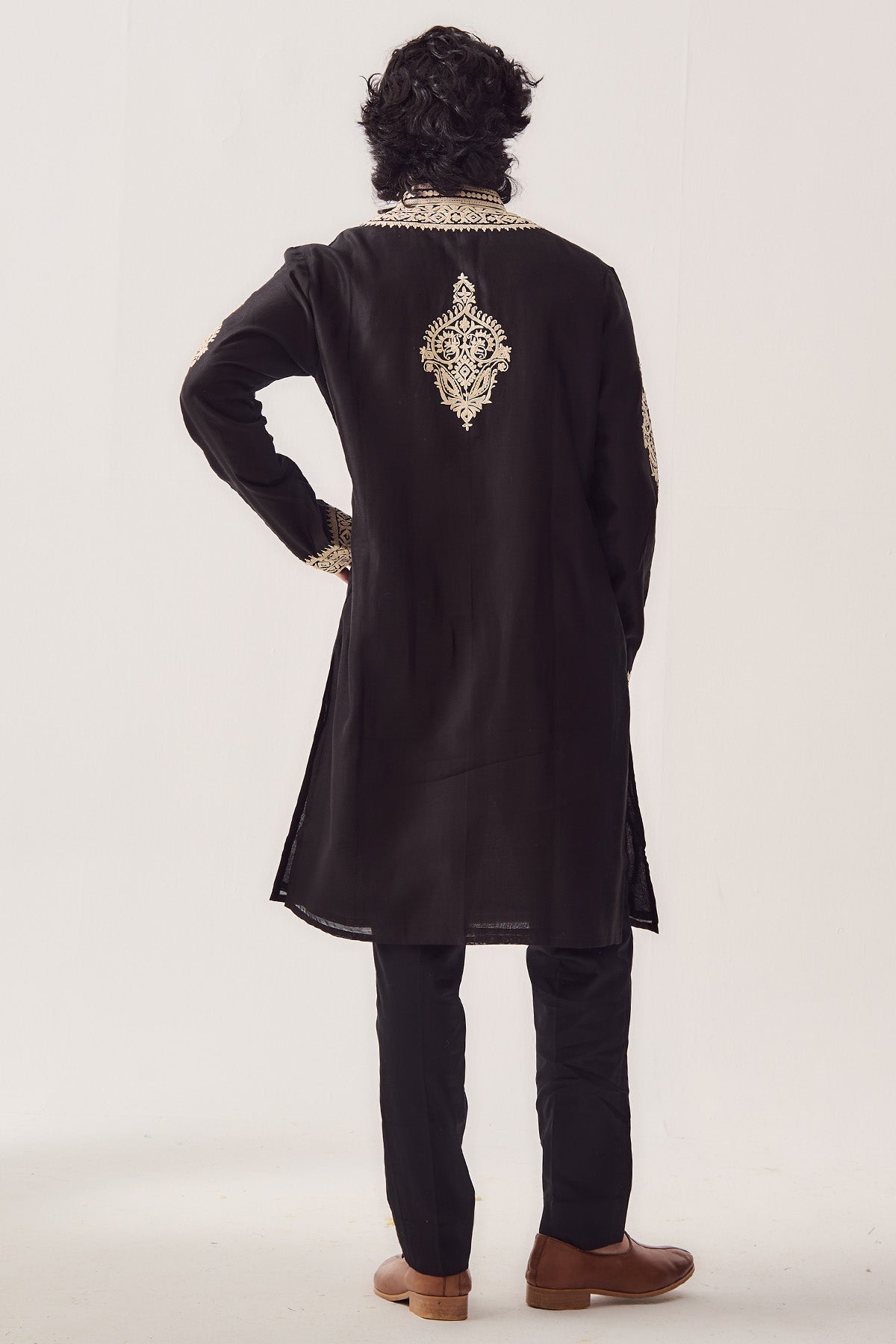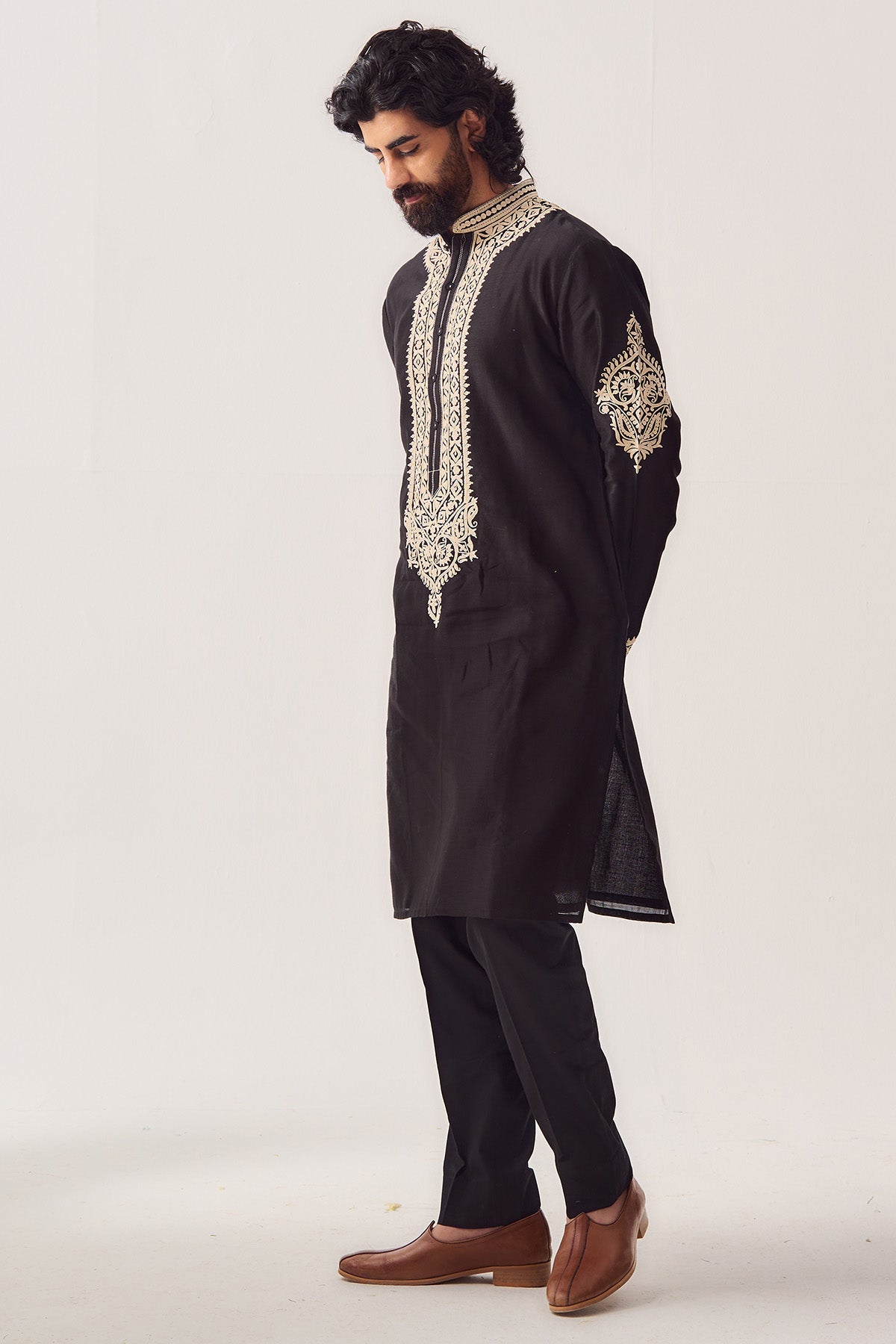 Black chanderi kurta set featuring handloom kurta with full sleeves dori and marodi embroidery paired with matching pyjama pants