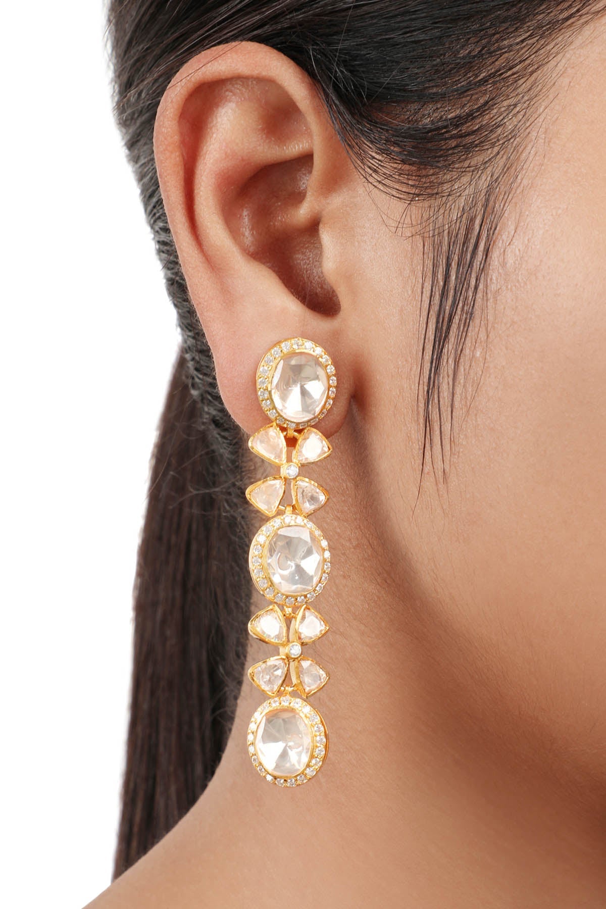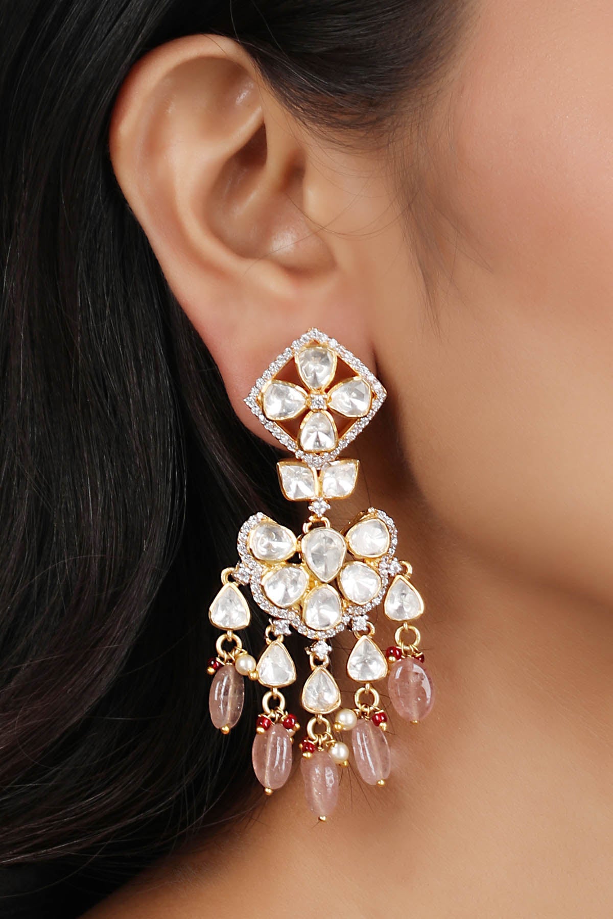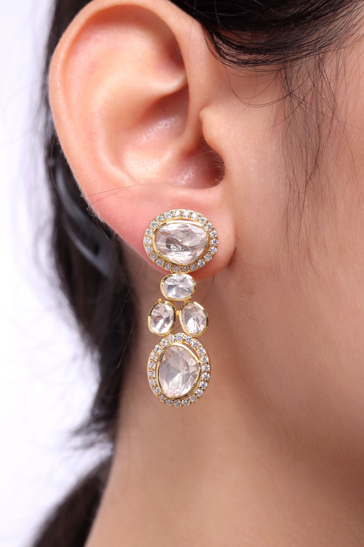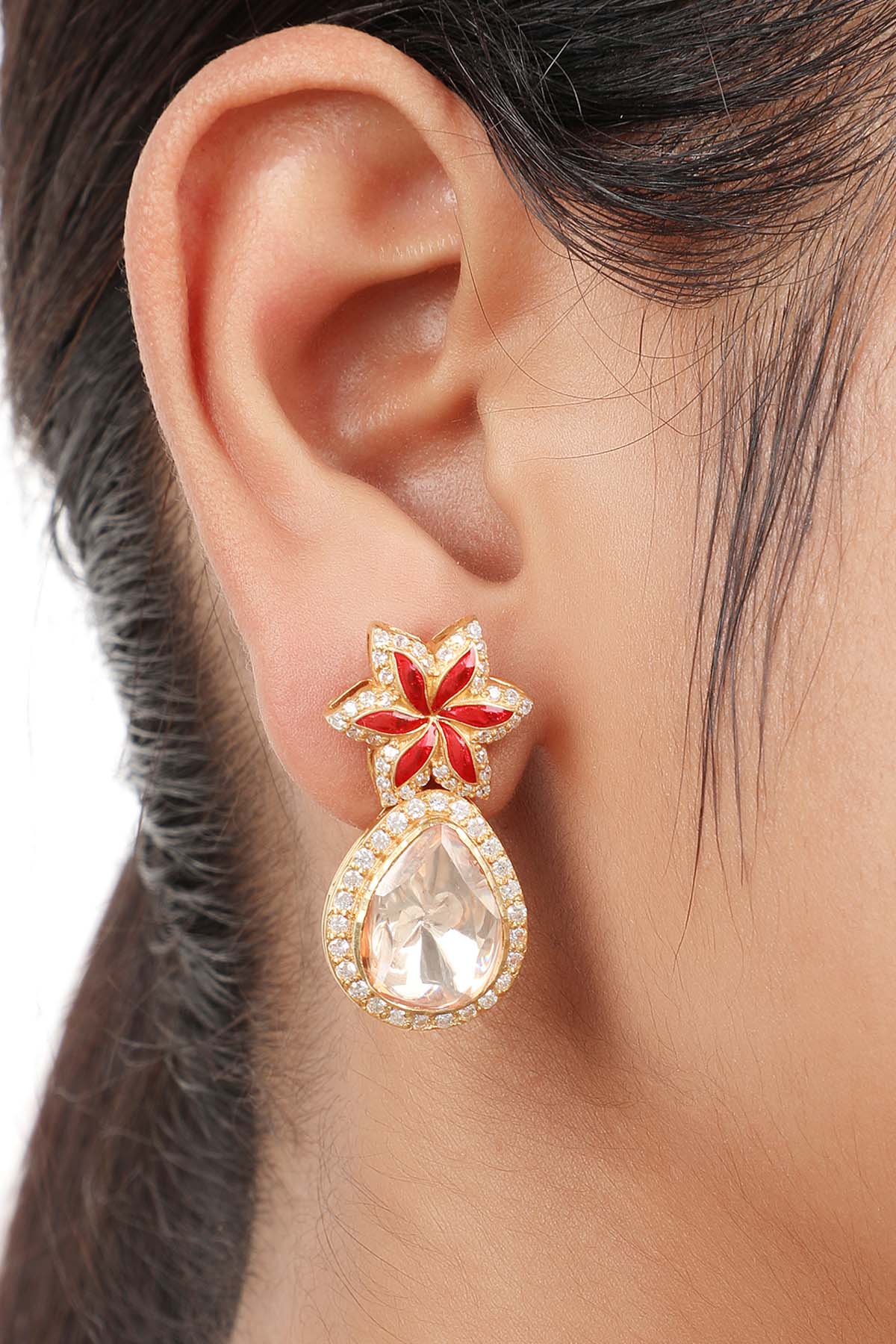 Earrings that "drop" slightly below the earlobe are called drop earrings. Designer Drop earrings are often simple designs with attachments like beads, charms, or gemstones falling from the earring's earlobe. The ornament piece remains fixed. The only movement it makes is off the base and in a tiny circle. Designer drop earrings are versatile and easy to style. You can style them for a formal occasion or festive occasion as per your preference.