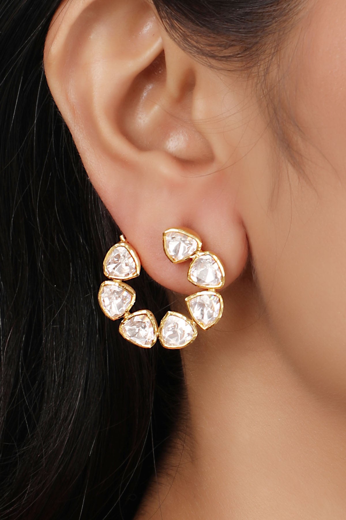 Designer Hoops or Balis are stylish and trendy, looping from the front to the back of the earlobe. All generations adore designer Hoops or Balis earrings as they give the ensemble more volume. Hoops come in a variety of sizes and shapes. Even though they are straightforward, minimalistic designs, there are also ornate patterns and embellishments like Swarovski Pearl Hoops or styles like Two Round Hoops at ScrollnShops. Designer Hoops or Balis look great while paired with Western attire like a midi dress or a T-shirt and bottom. This goes well for cocktail parties, holidays, and college.