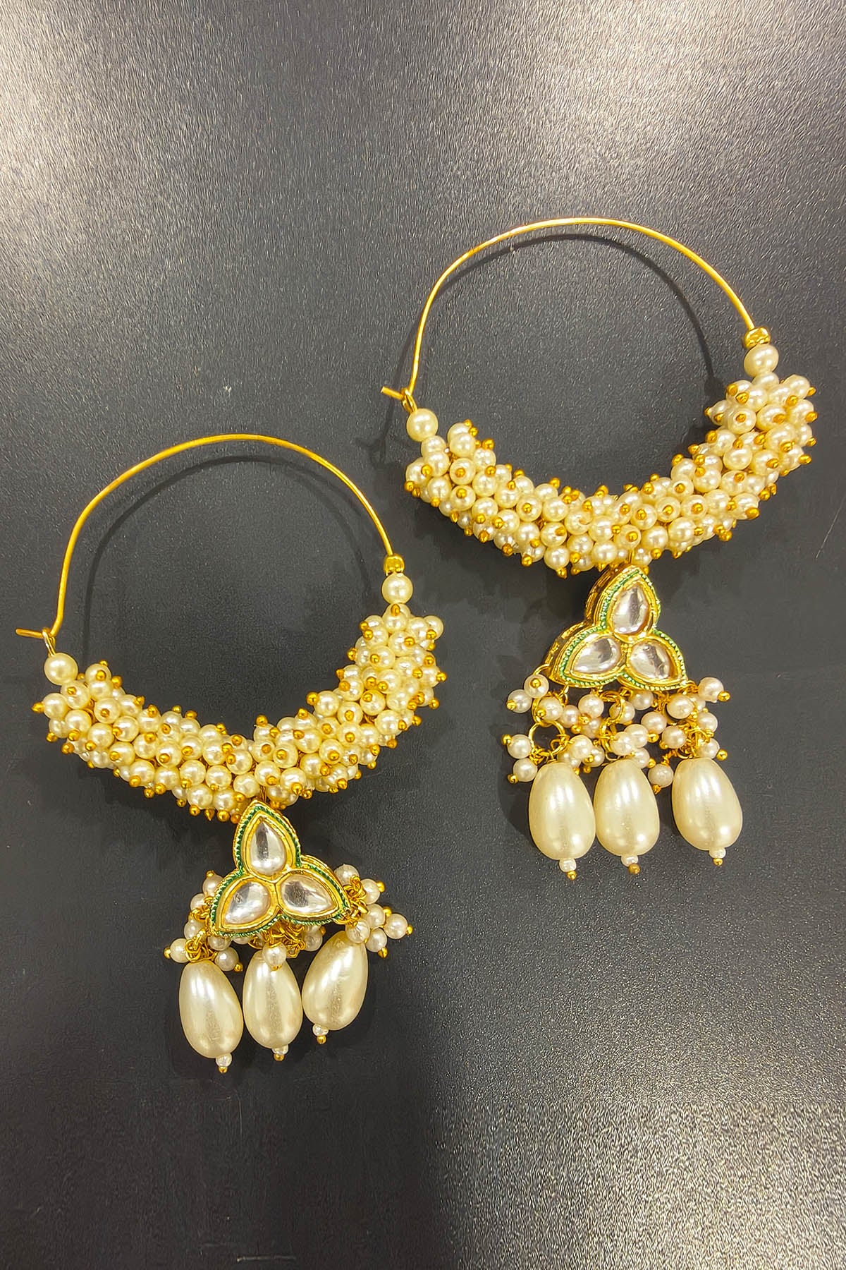 Luxurious gold plated hoop earrings with high quality kundan bead work and pearl tassels
