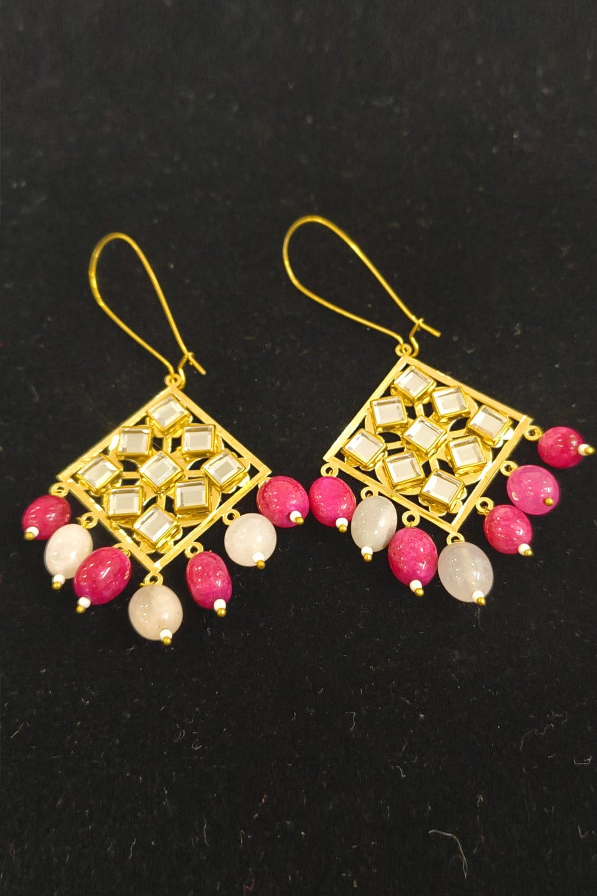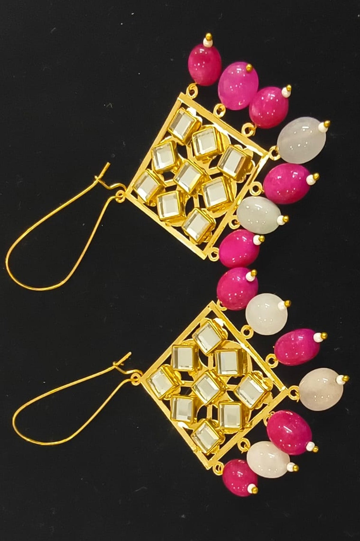Radiant pearl gold plated square shaped earrings with delicate mirror work and embellished with lush ruby pink and light beige beads work