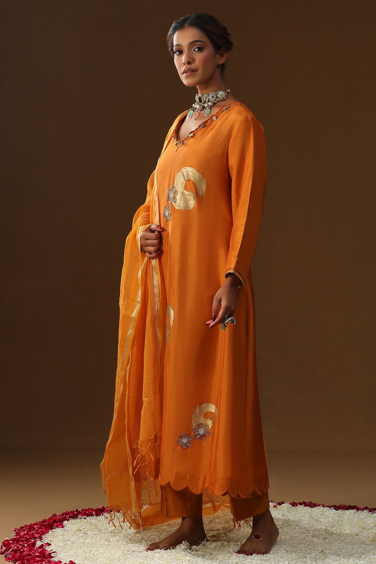 Orange summer silk kurta set featuring V neck kurta with full sleeves, foil painted and silver dana flower paired with pants and matching dupatta