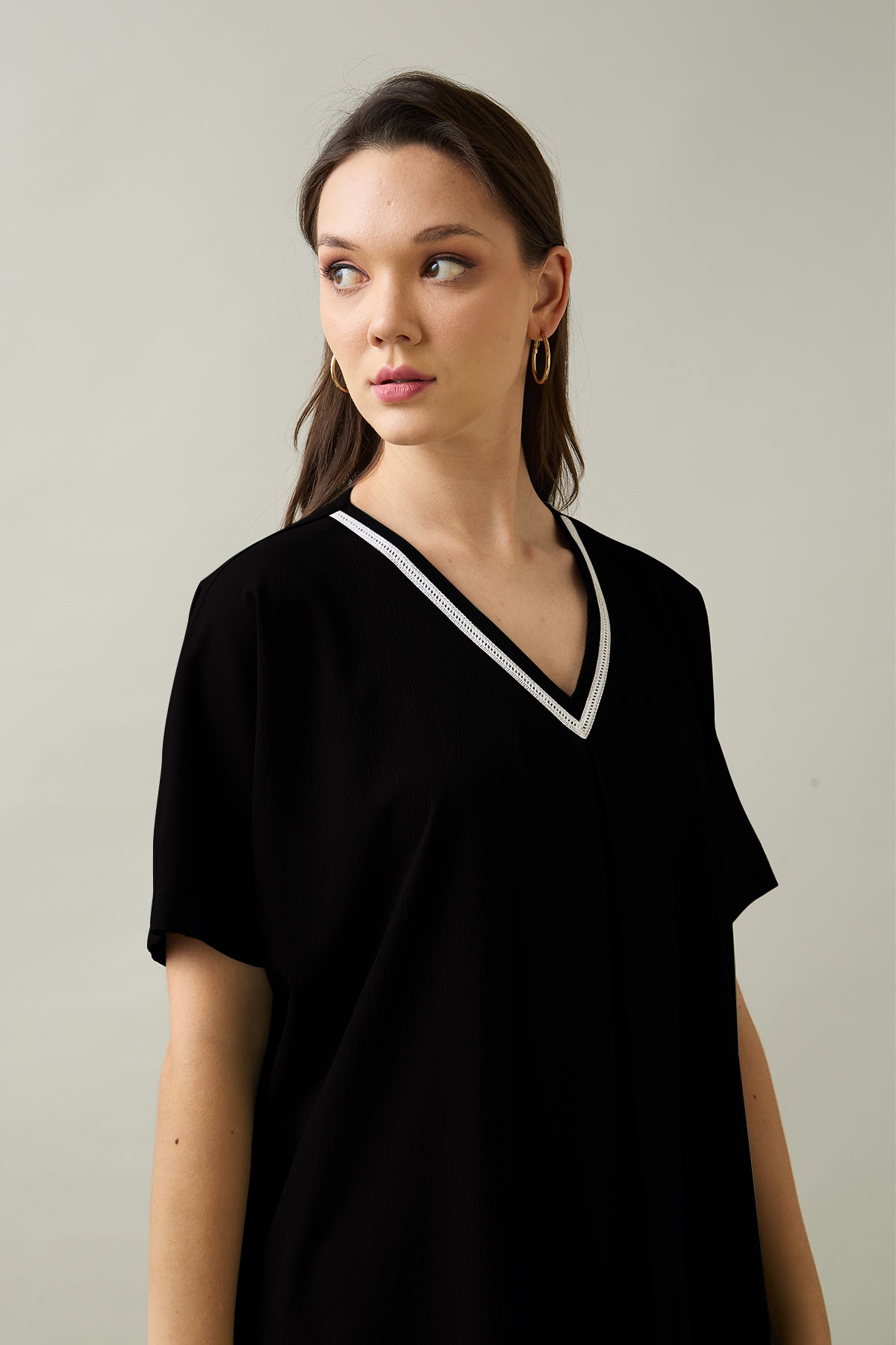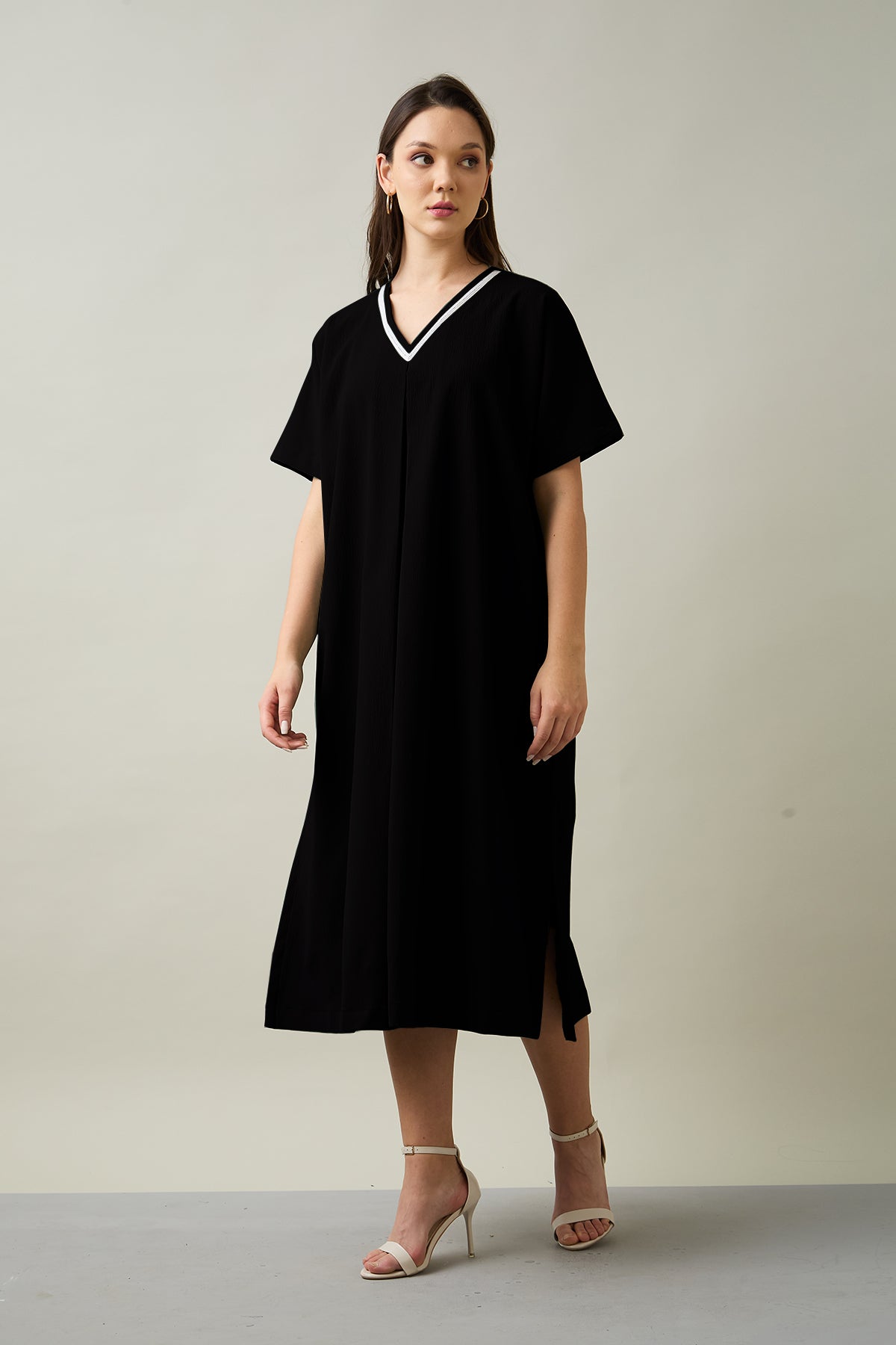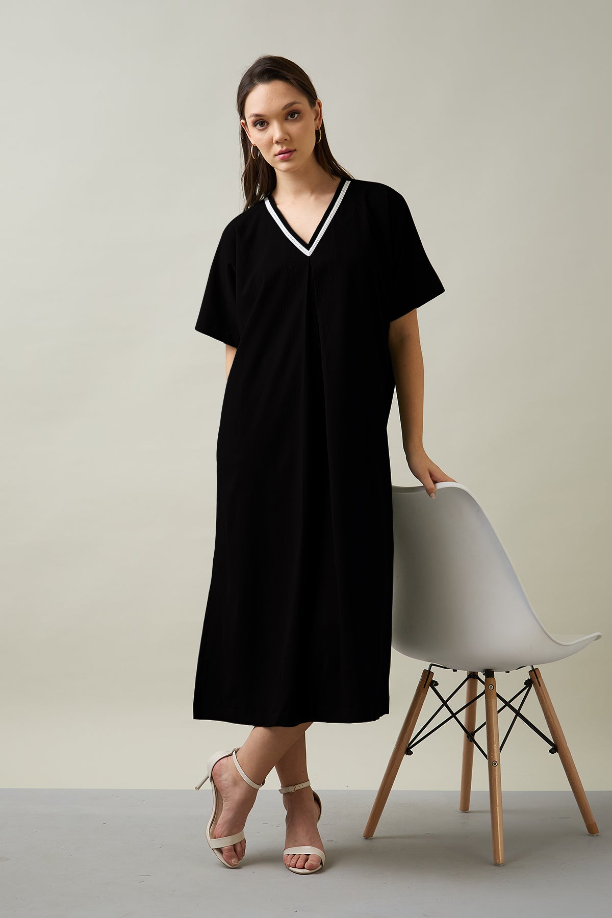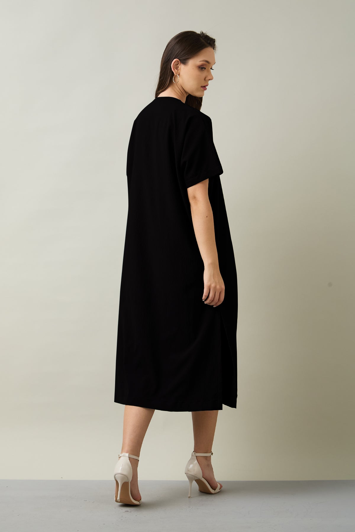 Black midi relaxed fit dress made with imported crushed fabric featuring box pleat, lace embellished on neck, half sleeves and side slit. The length of the dress is 47 inches