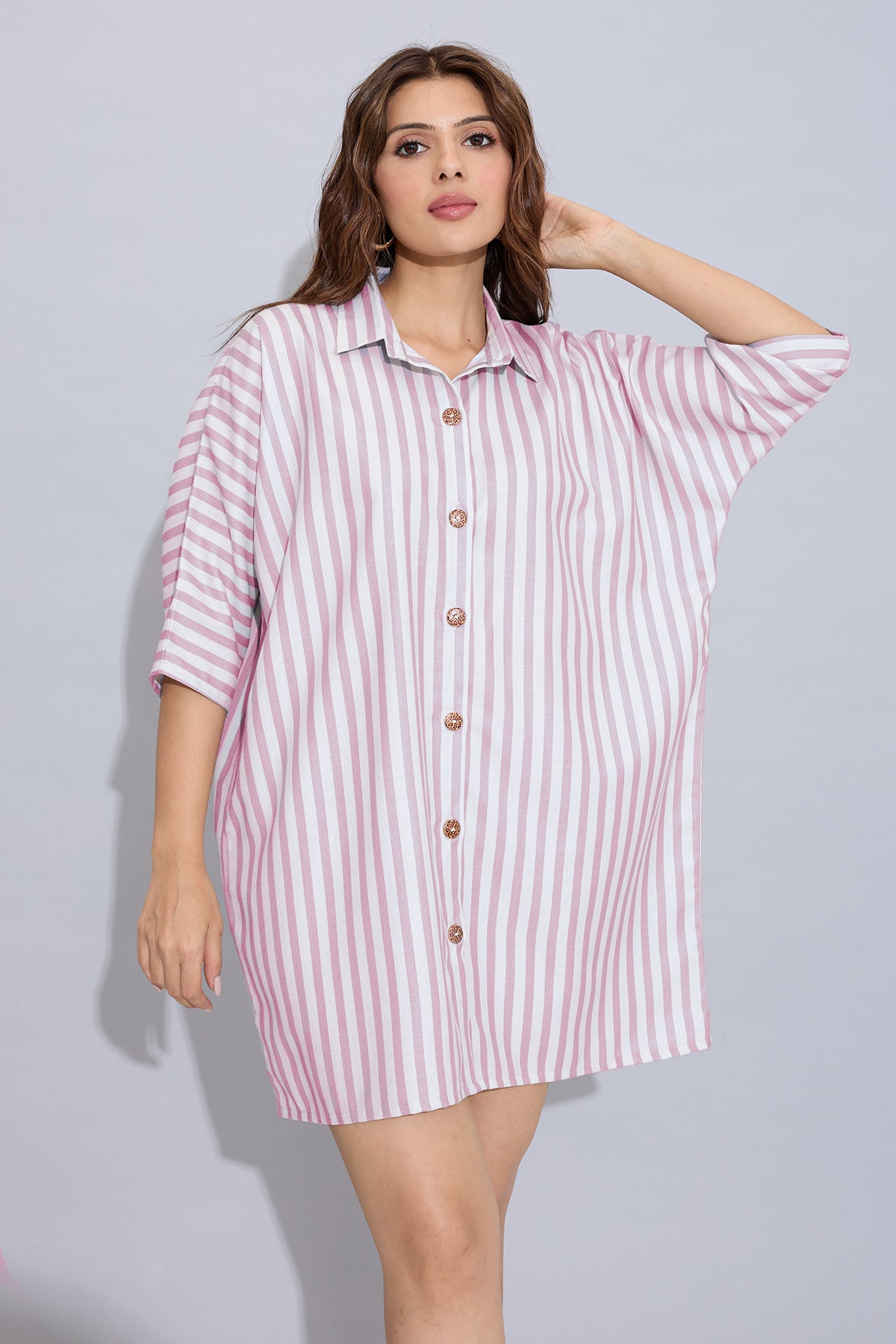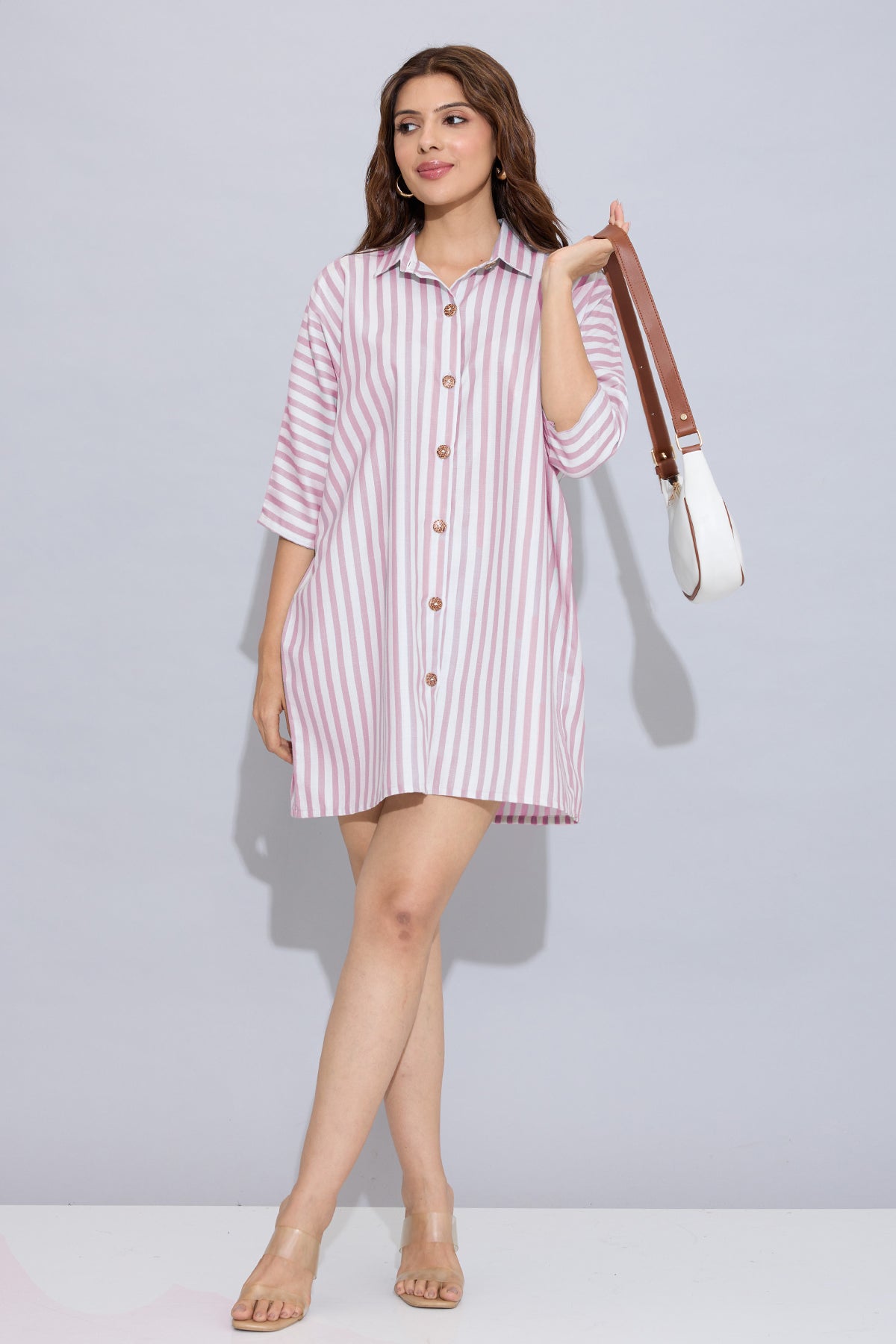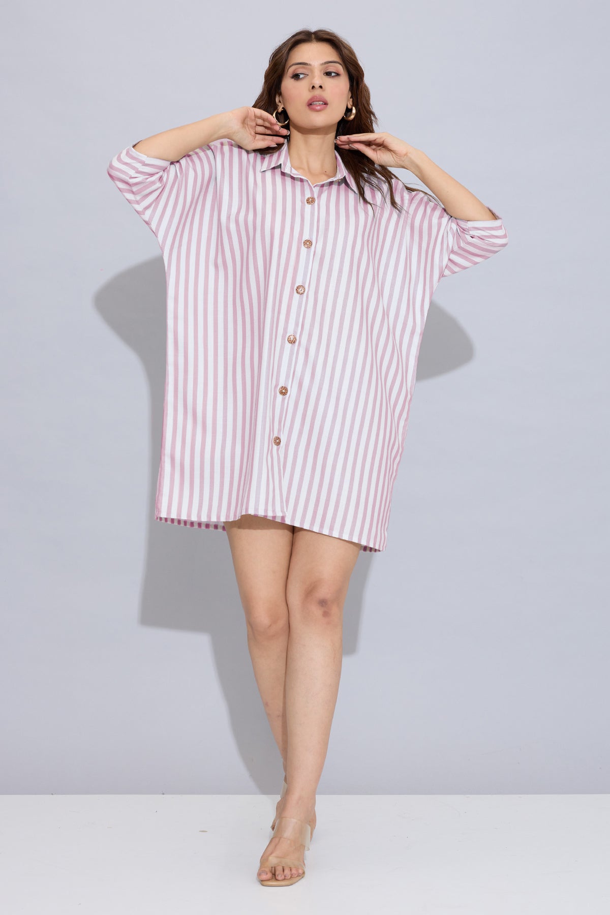 Onion pink cotton oversized shirt dress with stripe pattern, wooden buttons and collar. The length of the dress is 33 inches