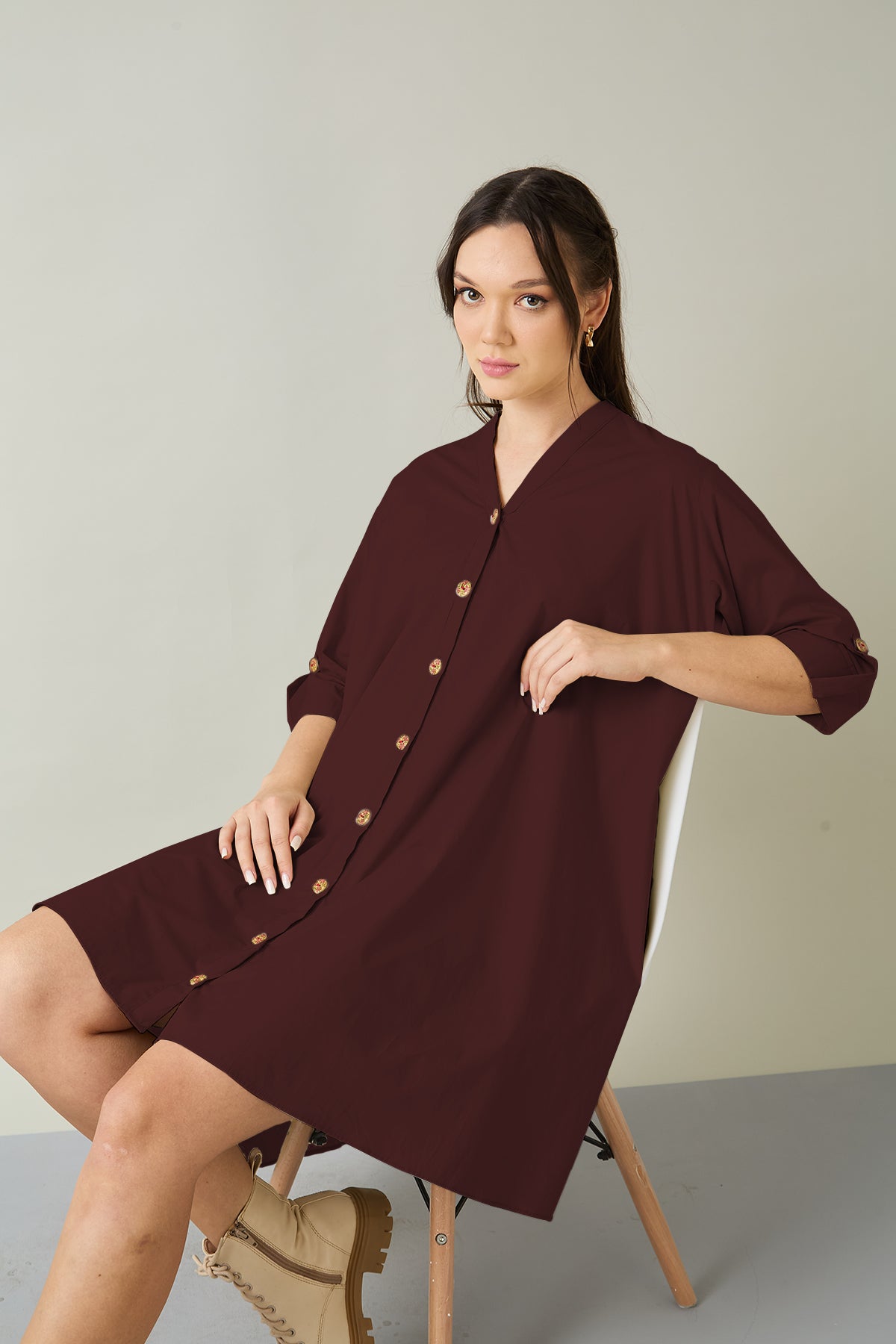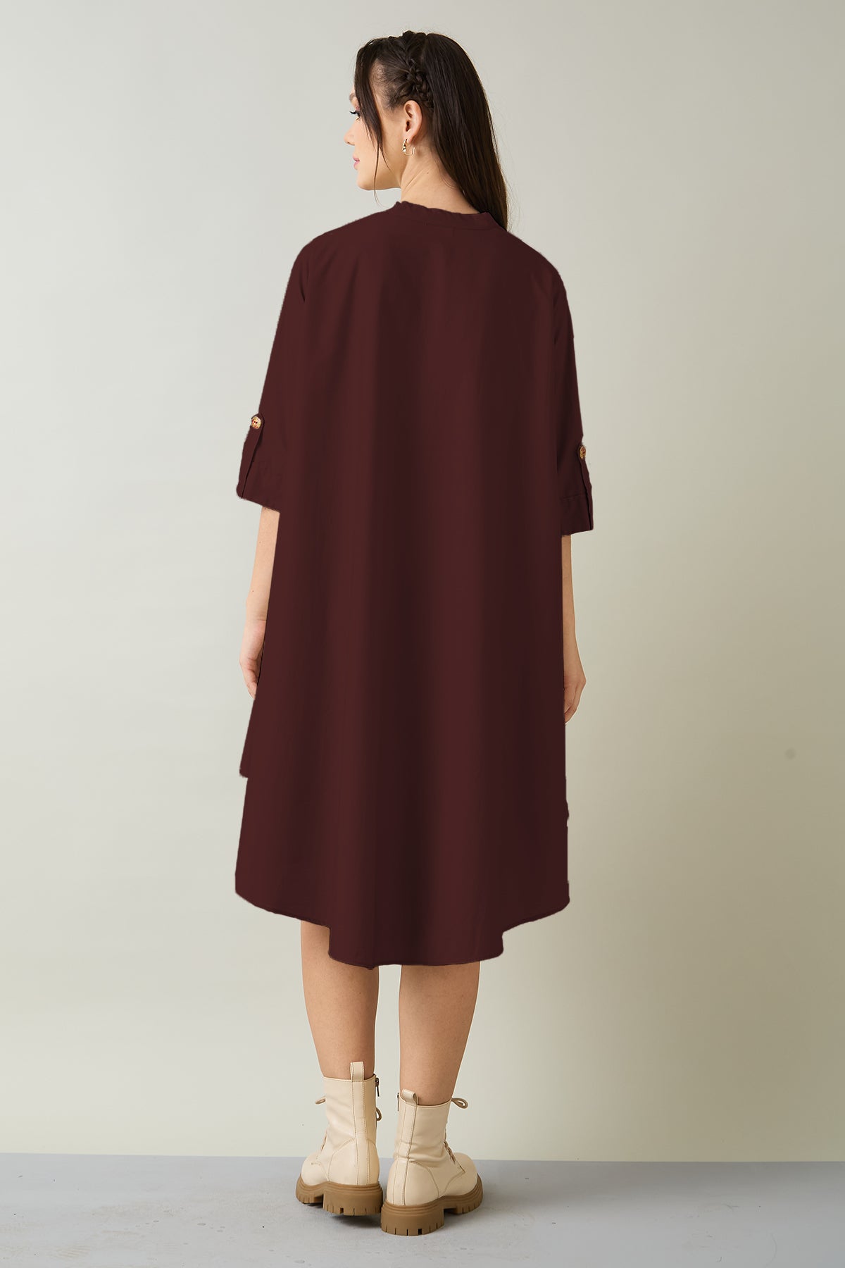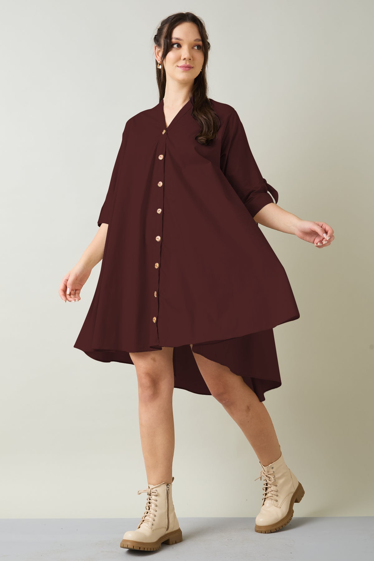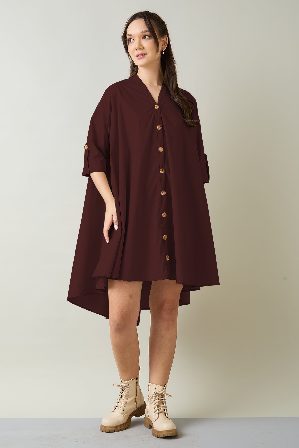 Wine 100% cotton (poplin) relaxed fit oversized dress with high low hem, wooden buttons and v-neck. The front length is 33 inches and back length is 40 inches