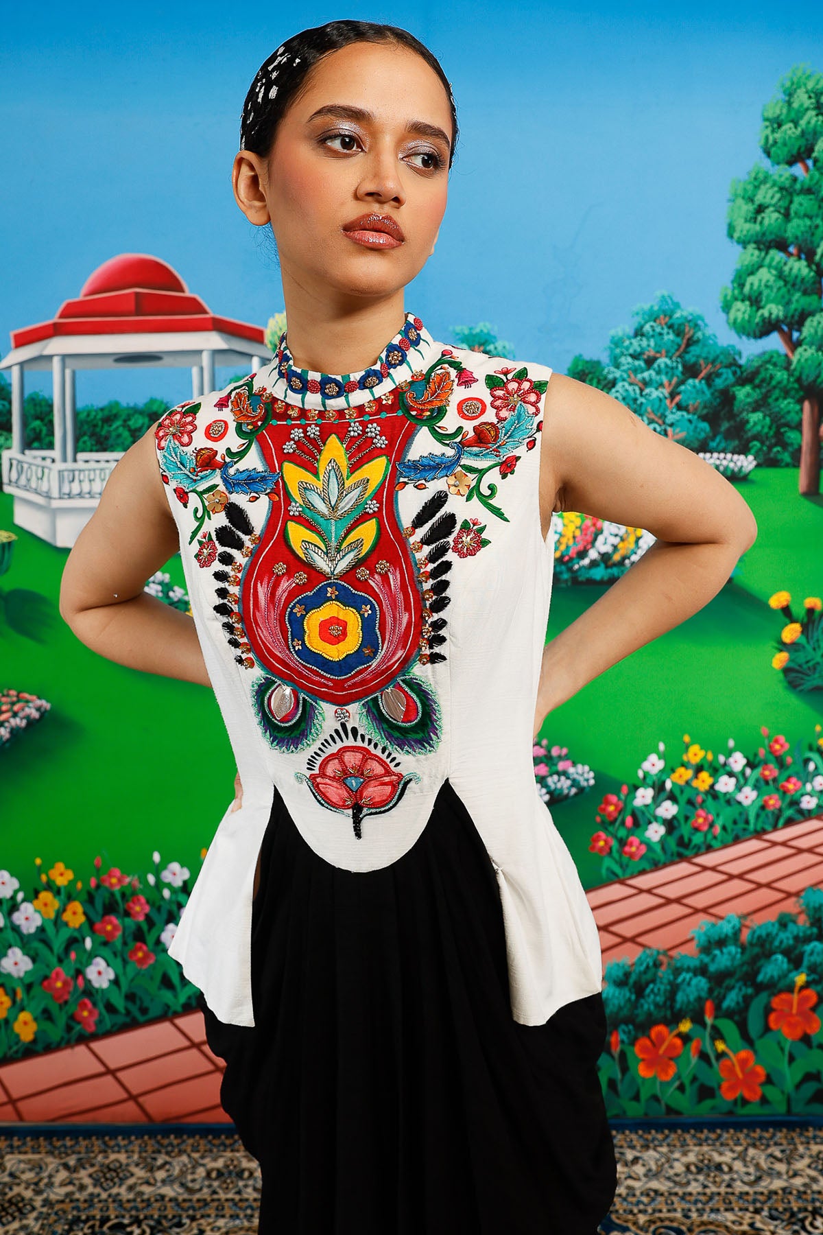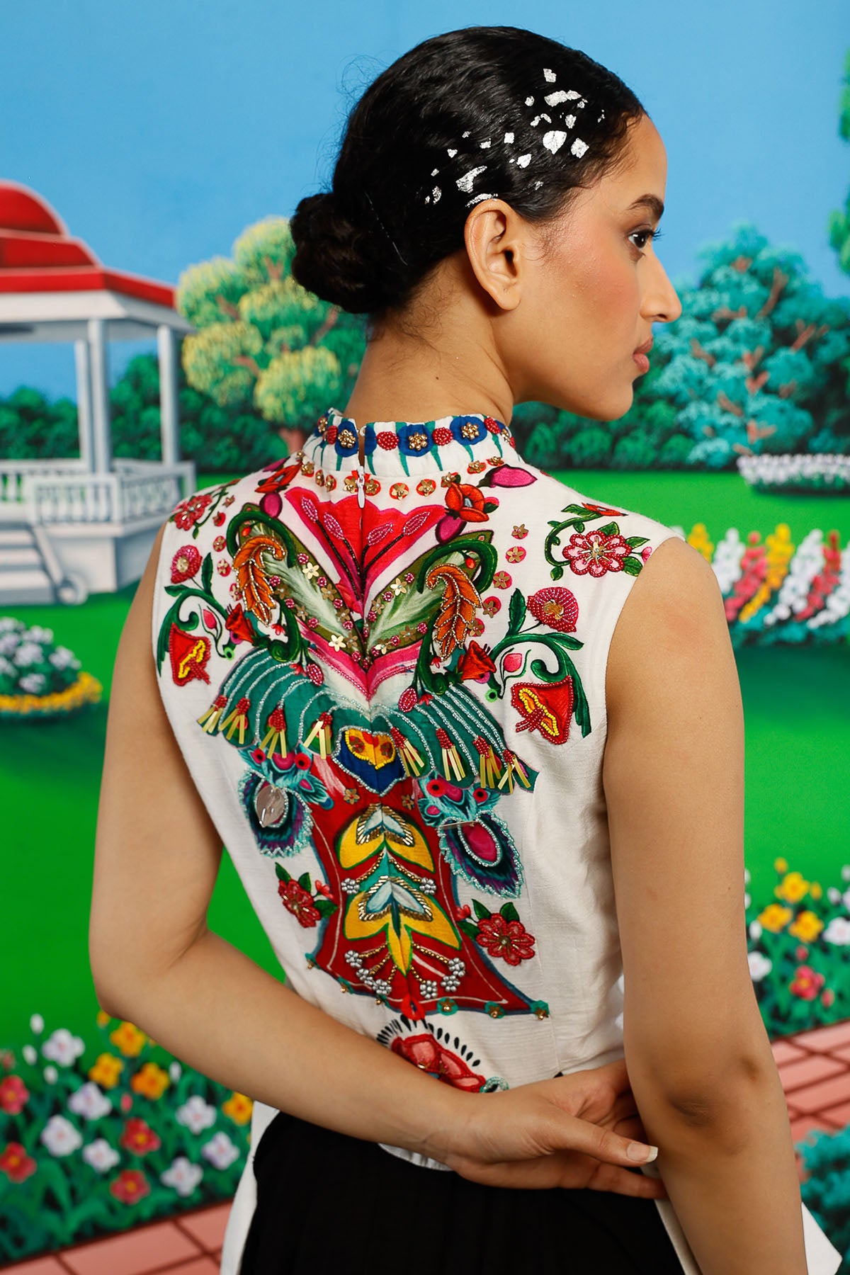 Black and white viscose dupion printed sleeveless maxi dress with aari hand embroidery floral motifs in bold shades pink, green, blue and yellow