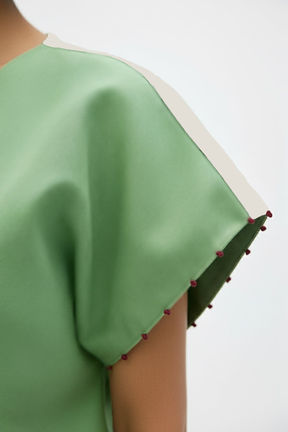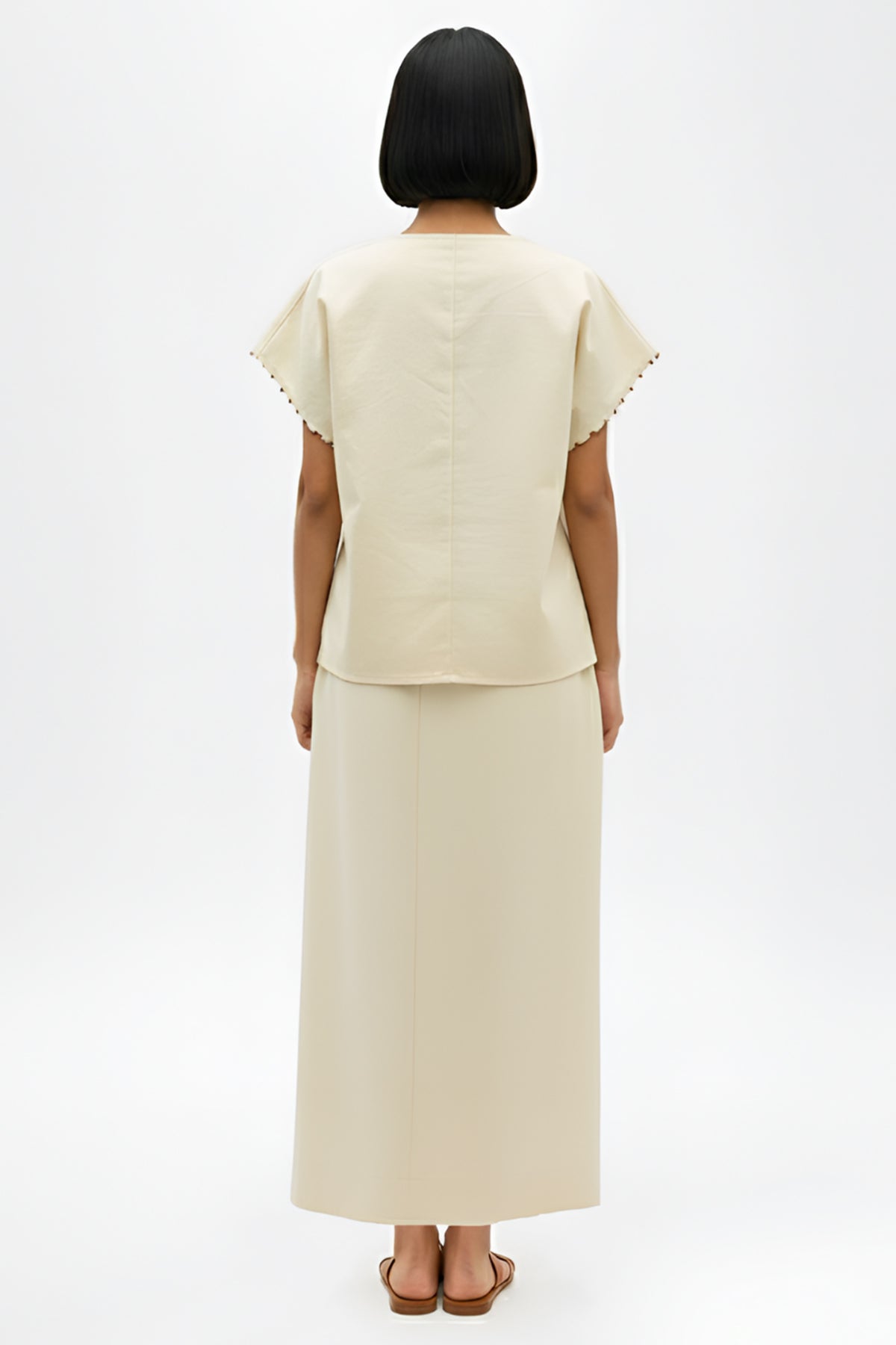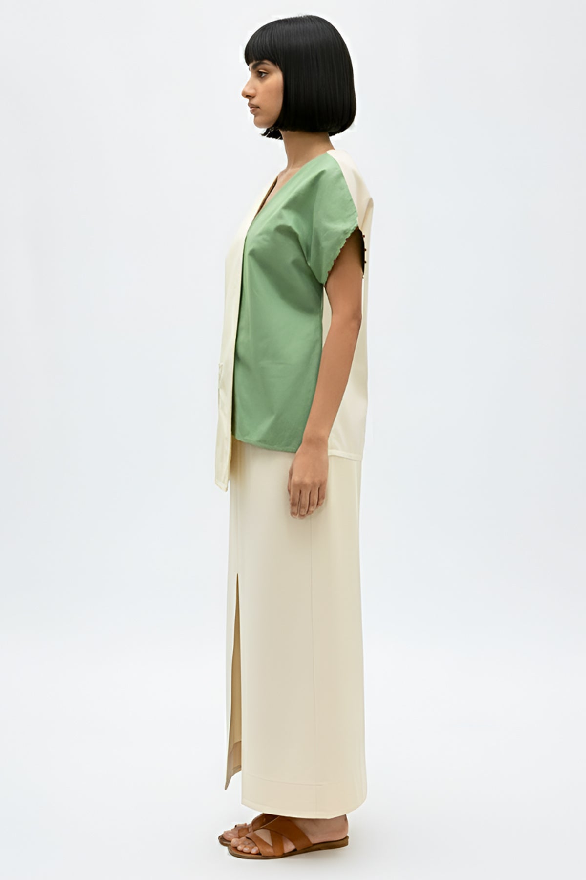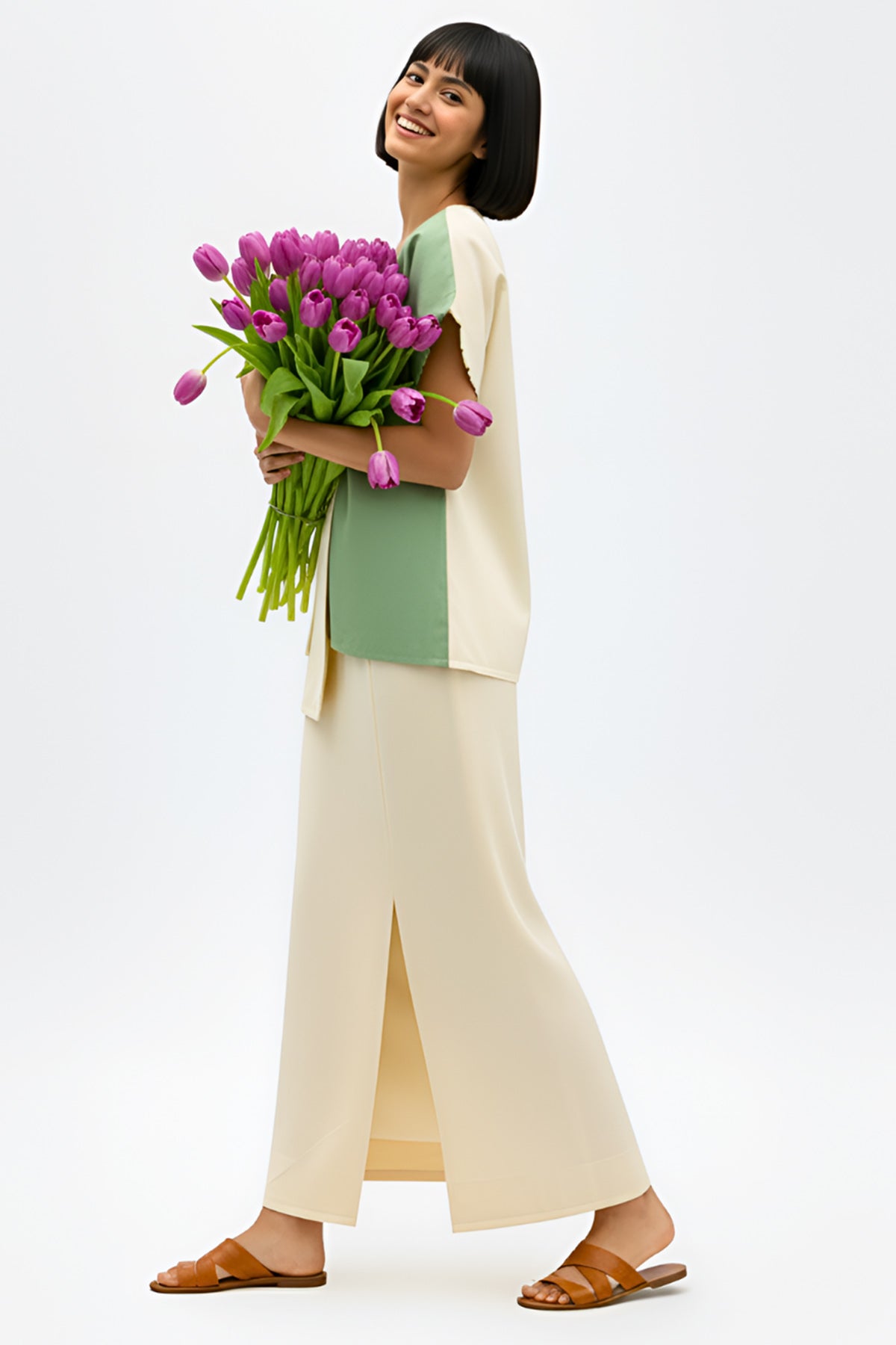 Ivory and asparagus green twill co-ord set featuring machine embroidery top with pocket and half sleeves paired with front slit straight skirt