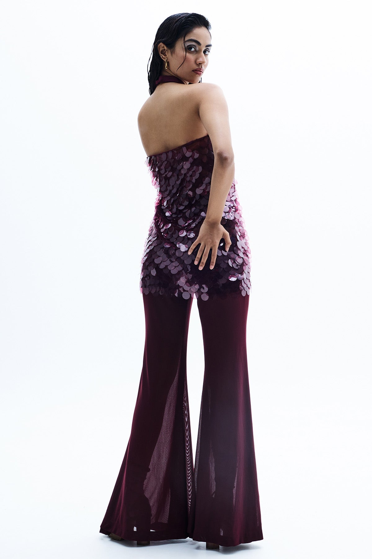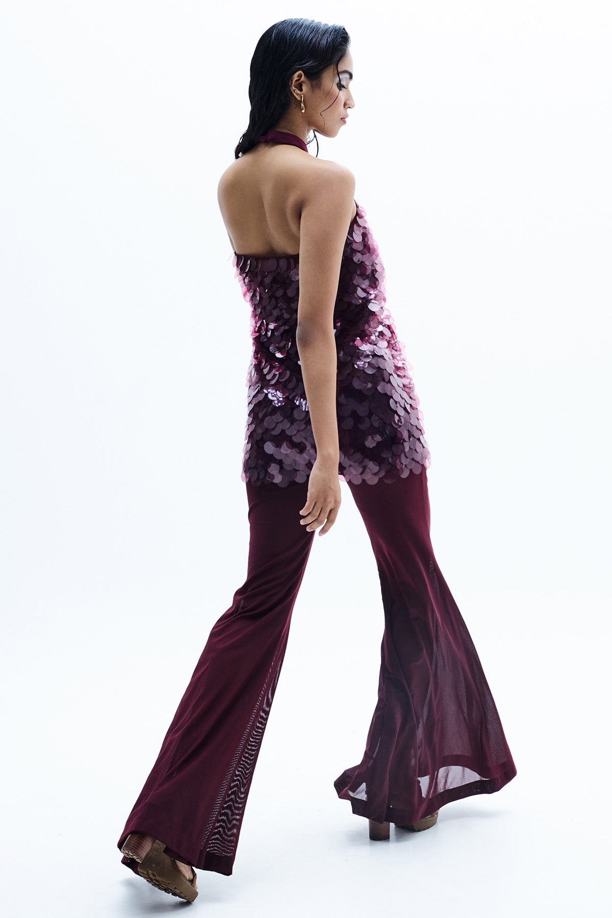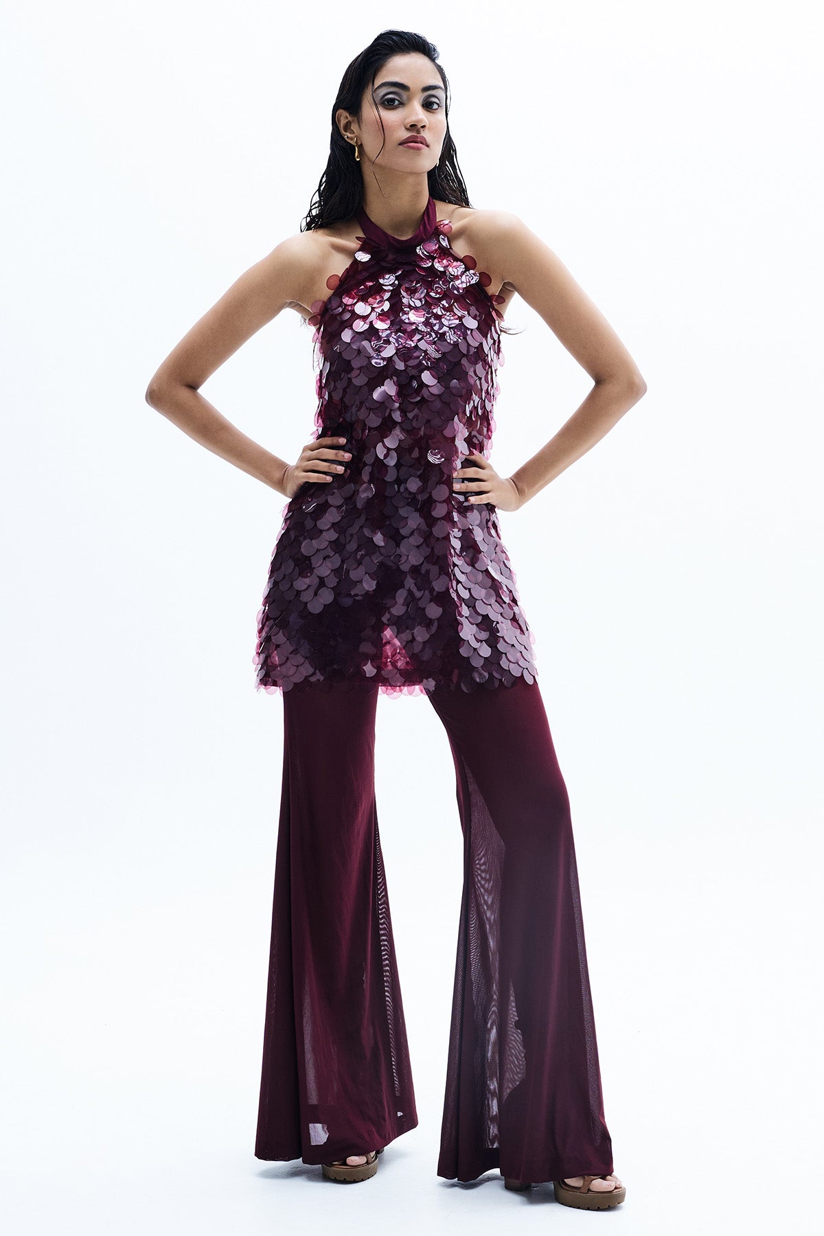 Maroon chiffon and net co-ord set with sleeveless sequins top and matching pants
