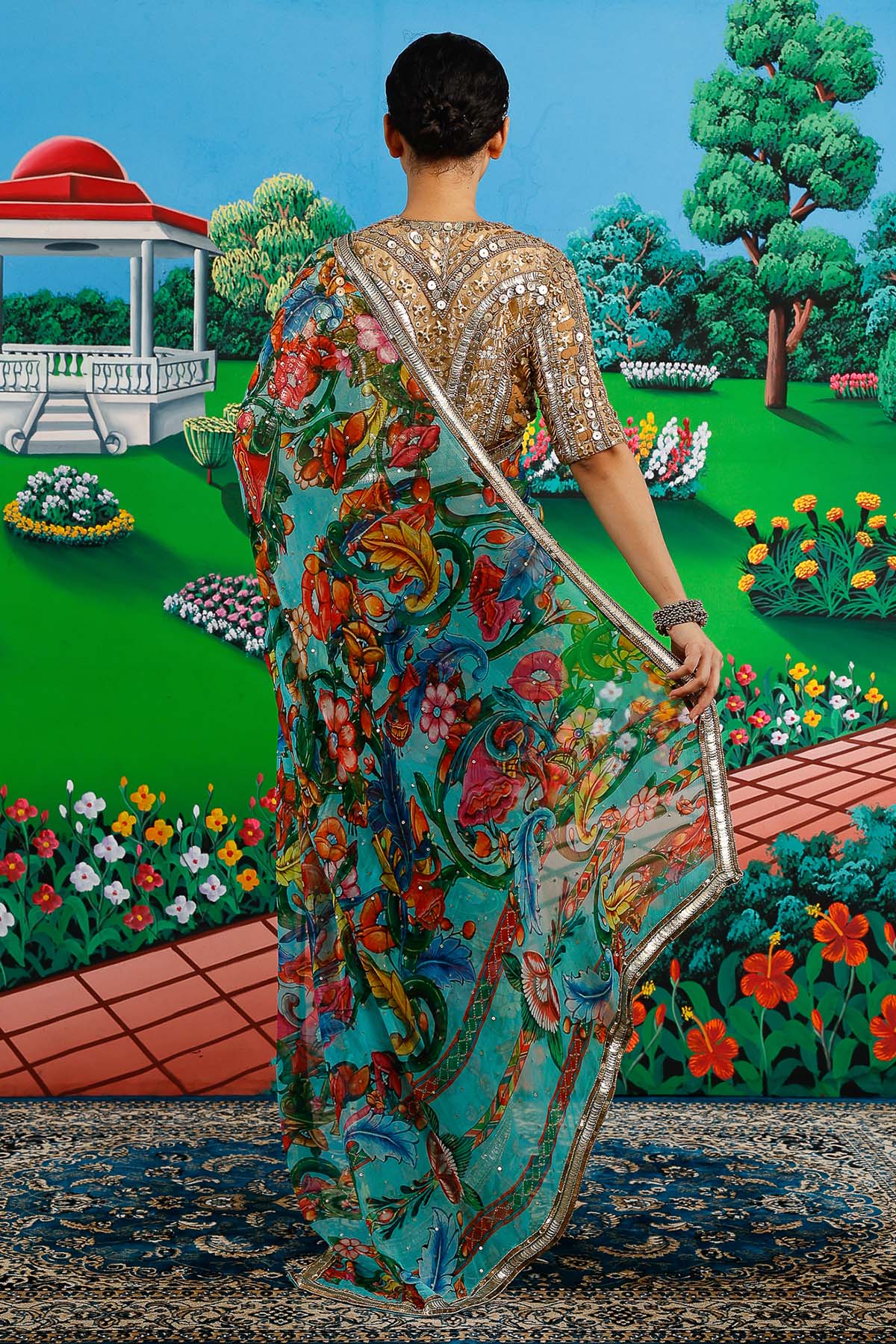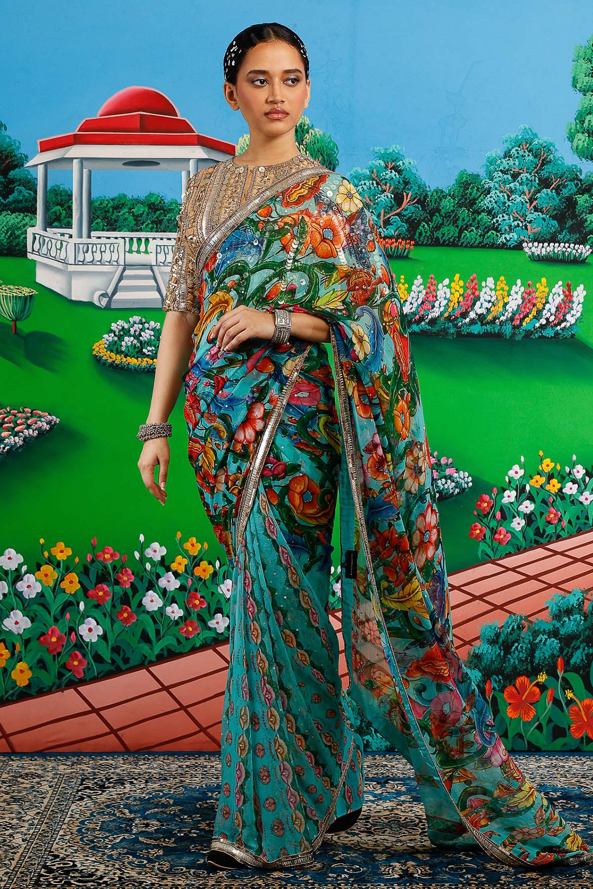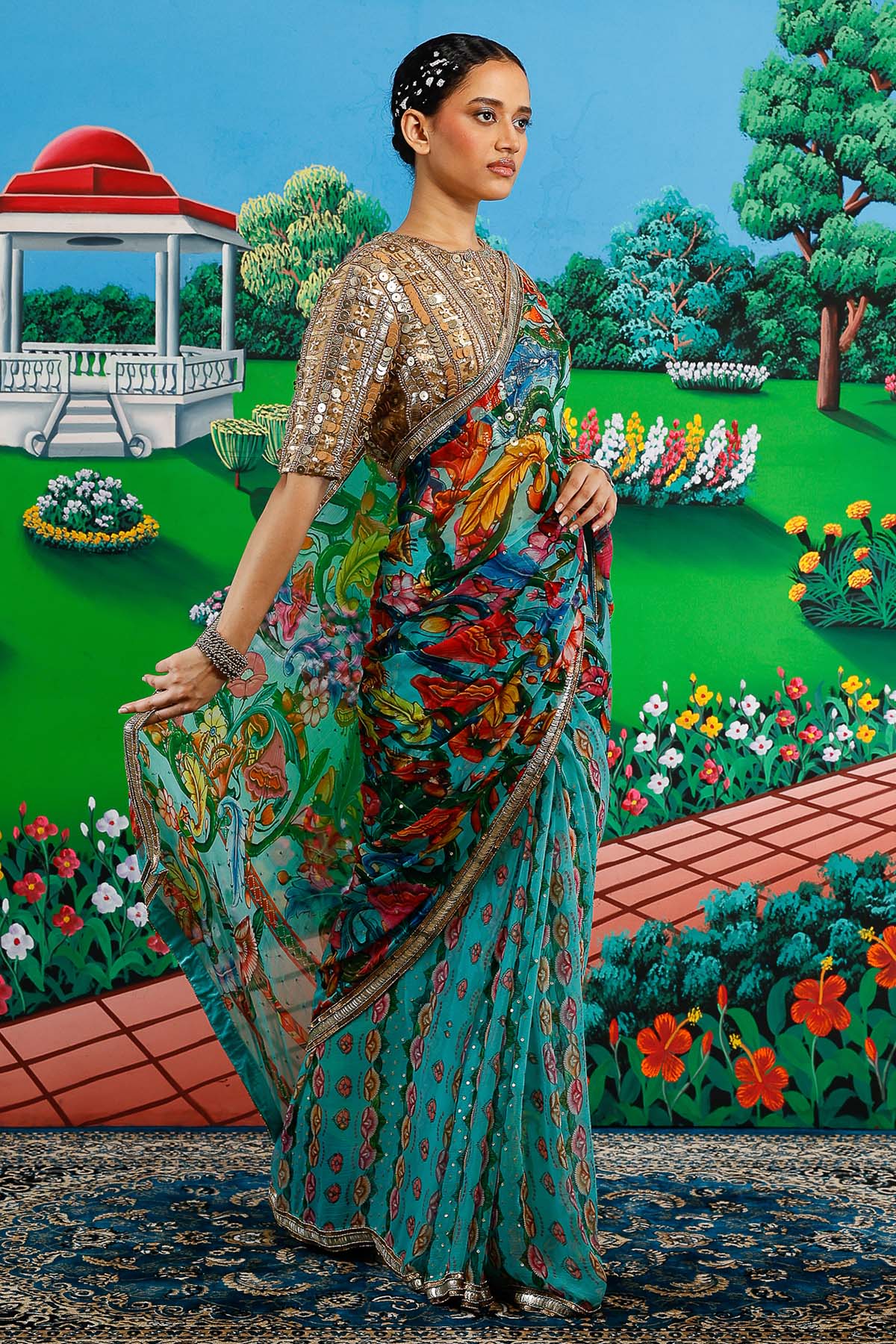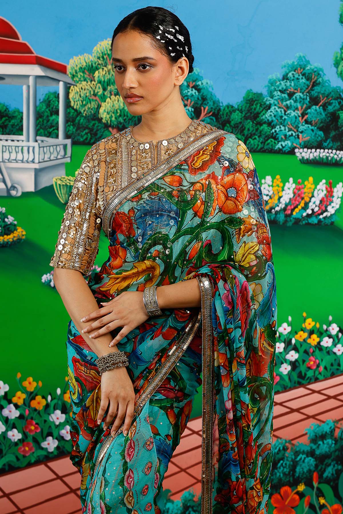 Mint chiffon floral printed saree set with aari hand embroidery saree, gathered and serene backdrop paired with plain blouse piece