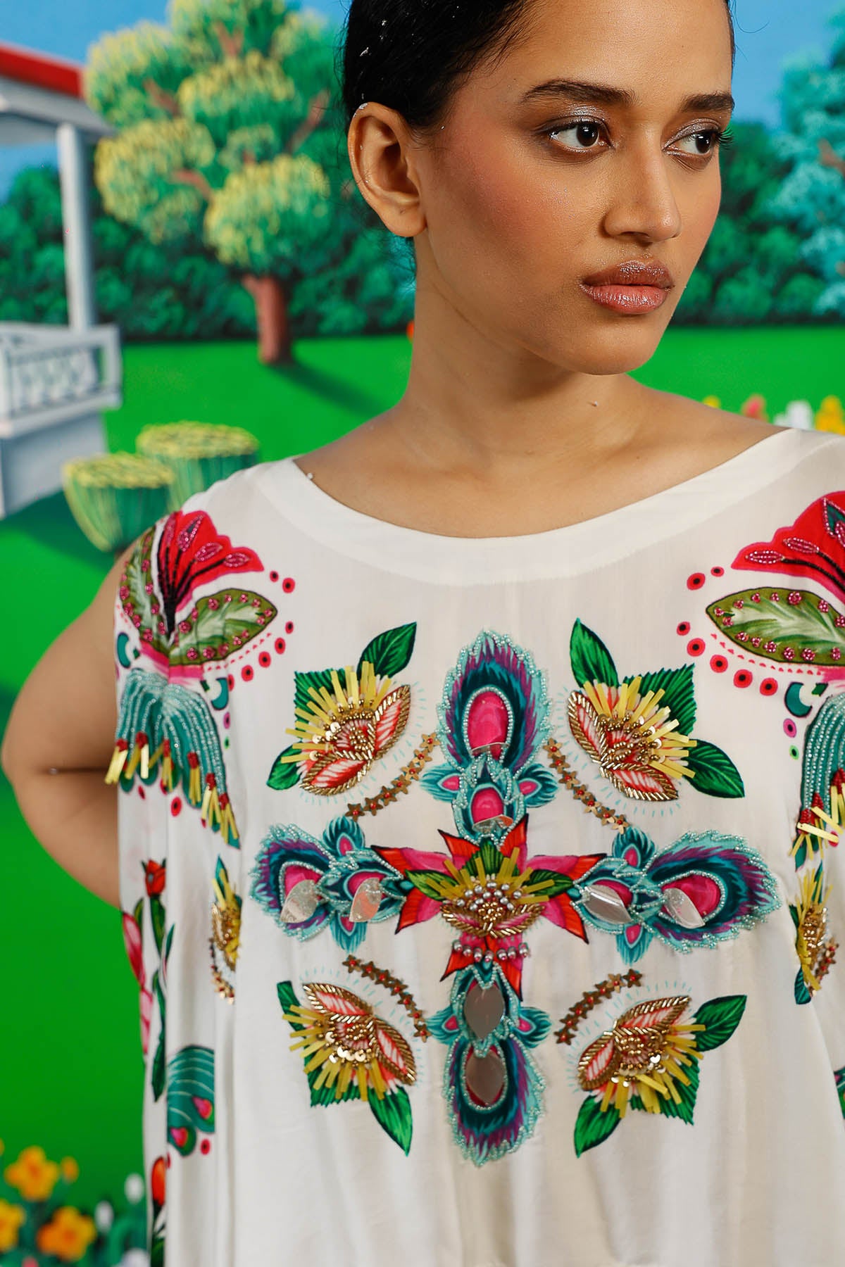 White satin floral printed co-ord set featuring multicolor bold delicate pattern top with aari hand embroidery and sleeveless paired with flowy pleated skirt
