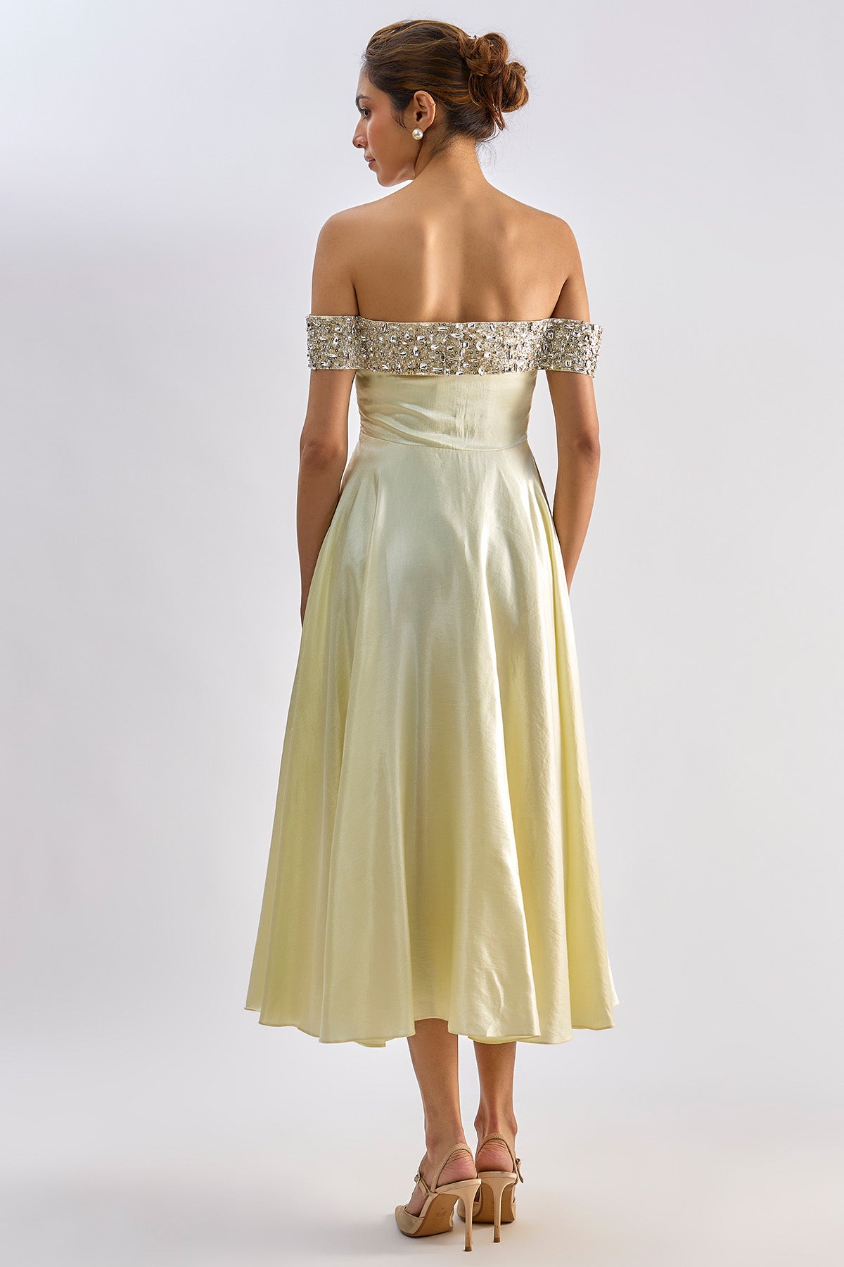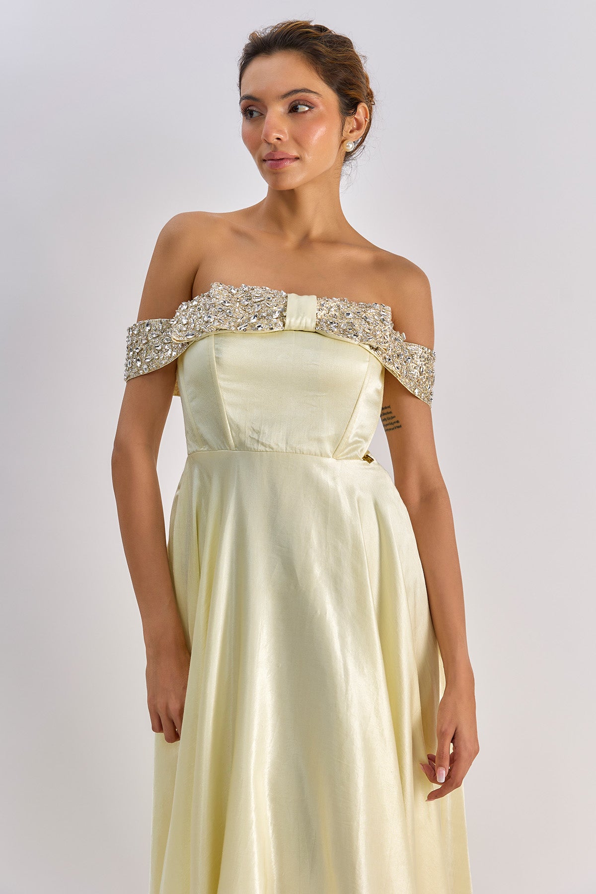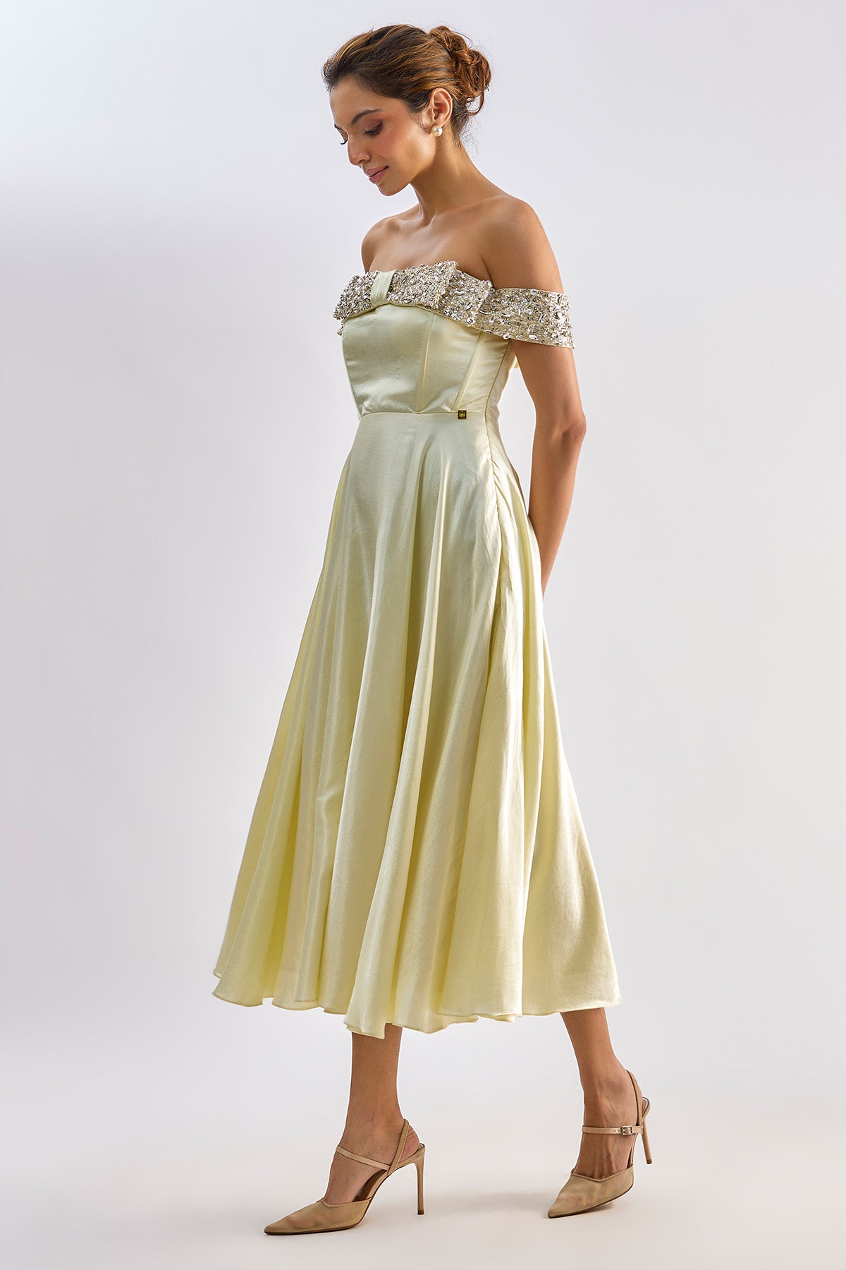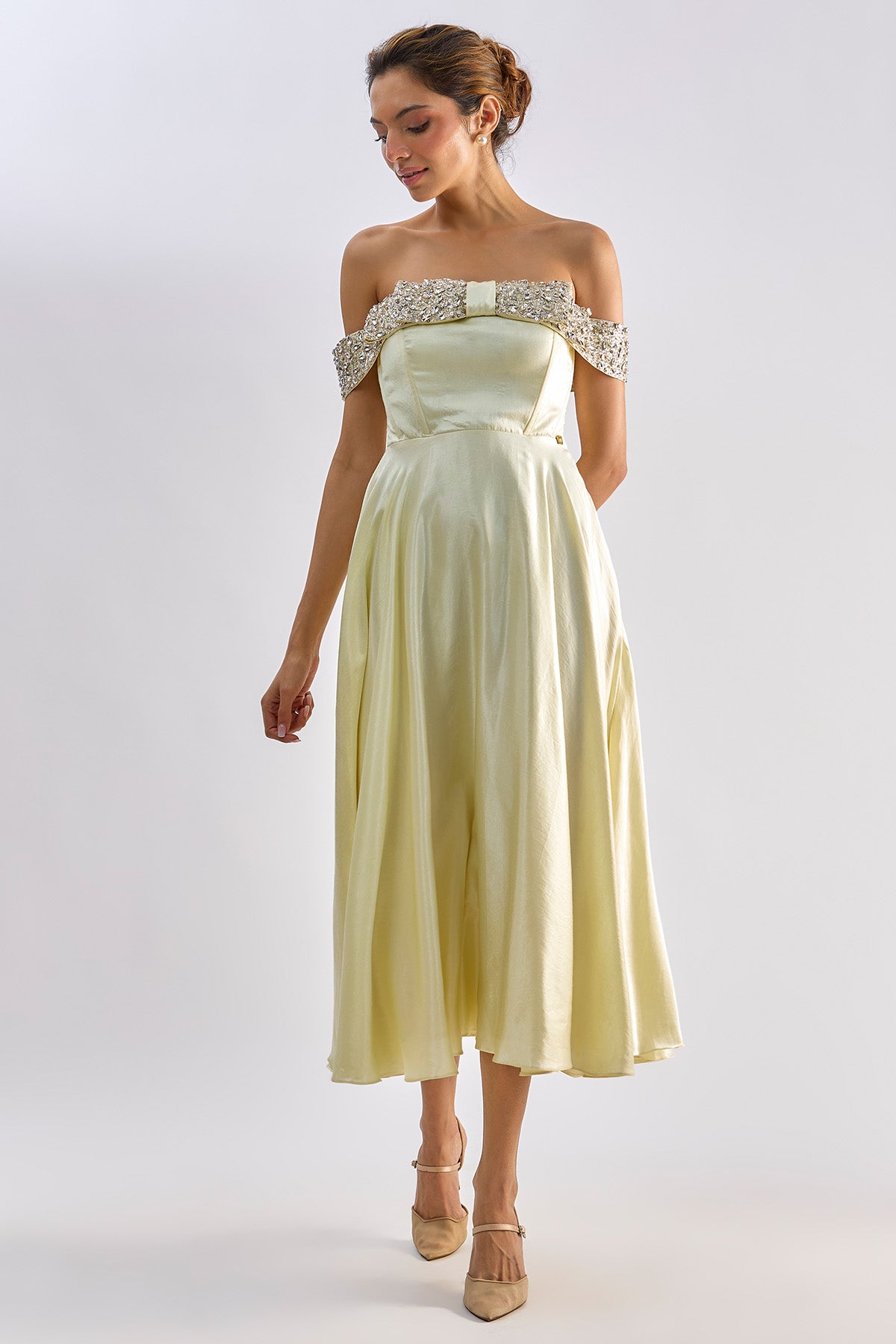 Yellow mashroo flared midi dress with swarvoski detailing and embellished bow. This dress has shantoon lining
