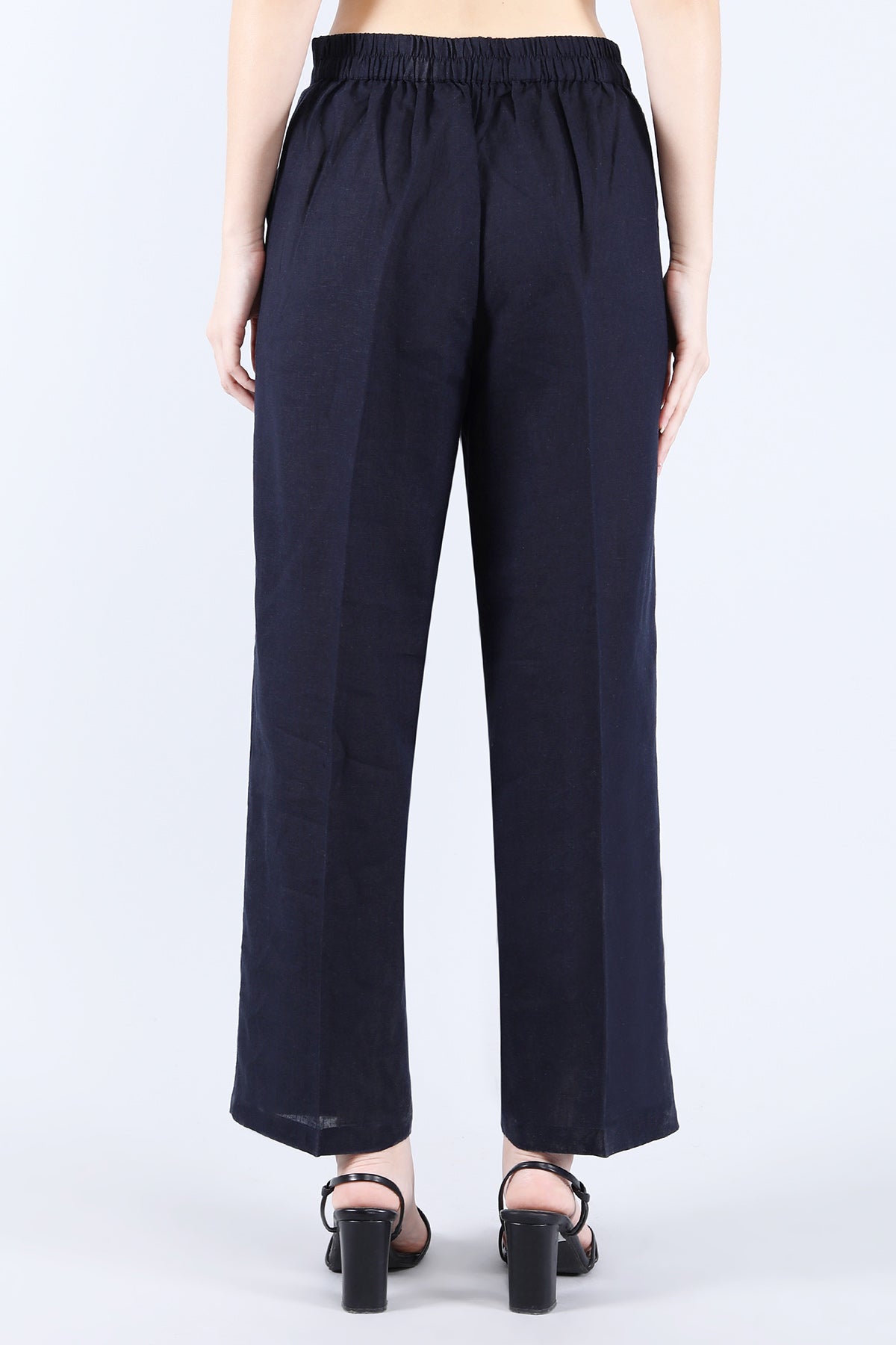 Navy blue 100% pure linen co-ord set with patch embroidered tunic featuring buttons, collar, 3/4th half sleeves paired with matching pants