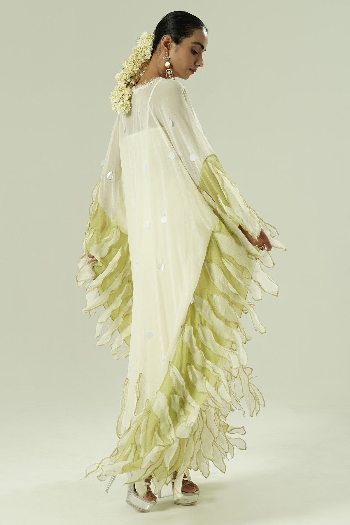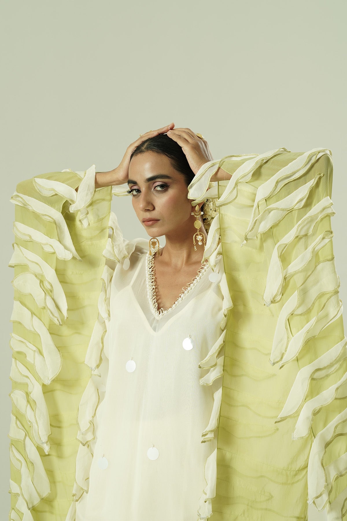 Ivory olive organza and crepe kurta set featuring panelled kurta with leaflet details and beadwork around neck paired with straight pants