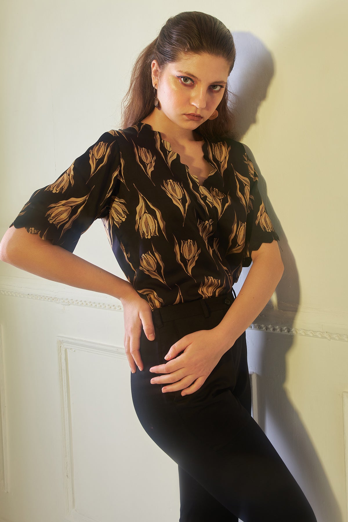 Black and golden modal satin digital printed scalloped shirt with half sleeves and buttons