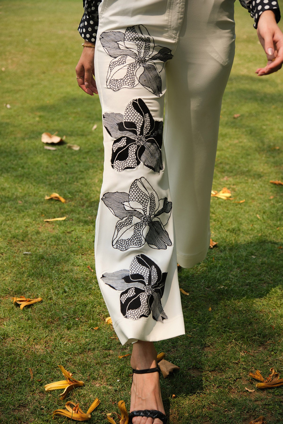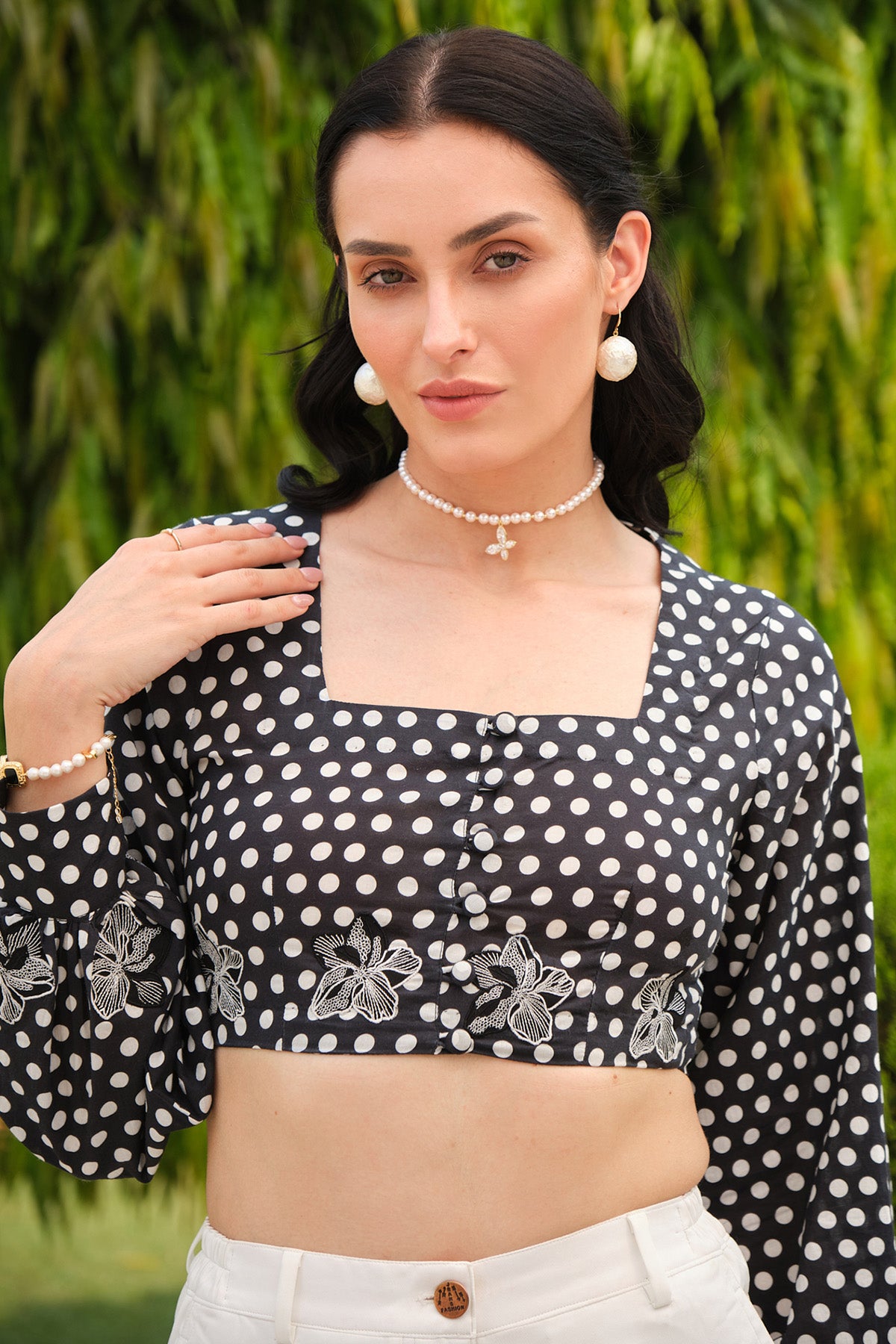 Black white banana crepe and rayon fusion set featuring digitally printed crop top with bishop sleeves paired with embroidery bootcut pants