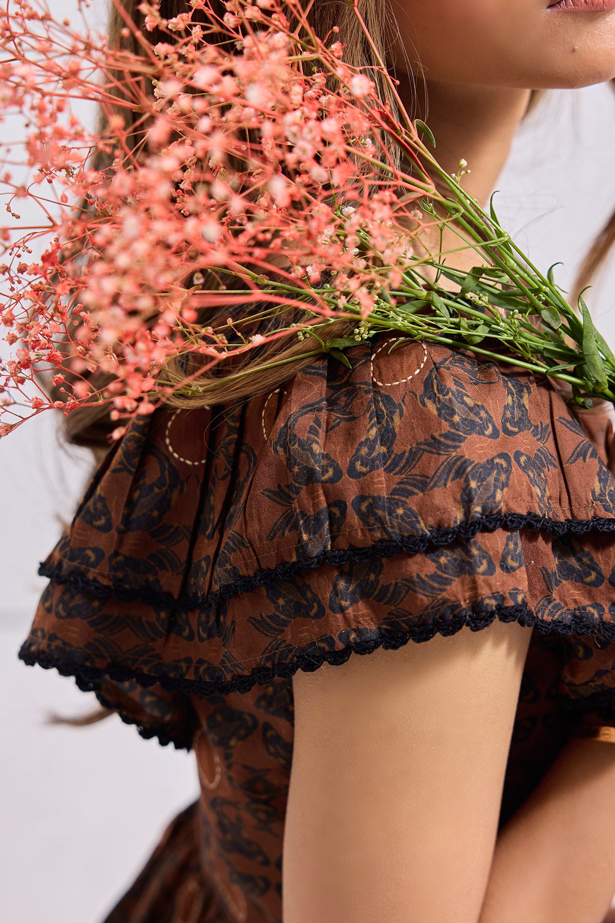 Brown cotton digital printed midi dress with with hand embroidery, ruffled neck and crochet details with comfortable fit