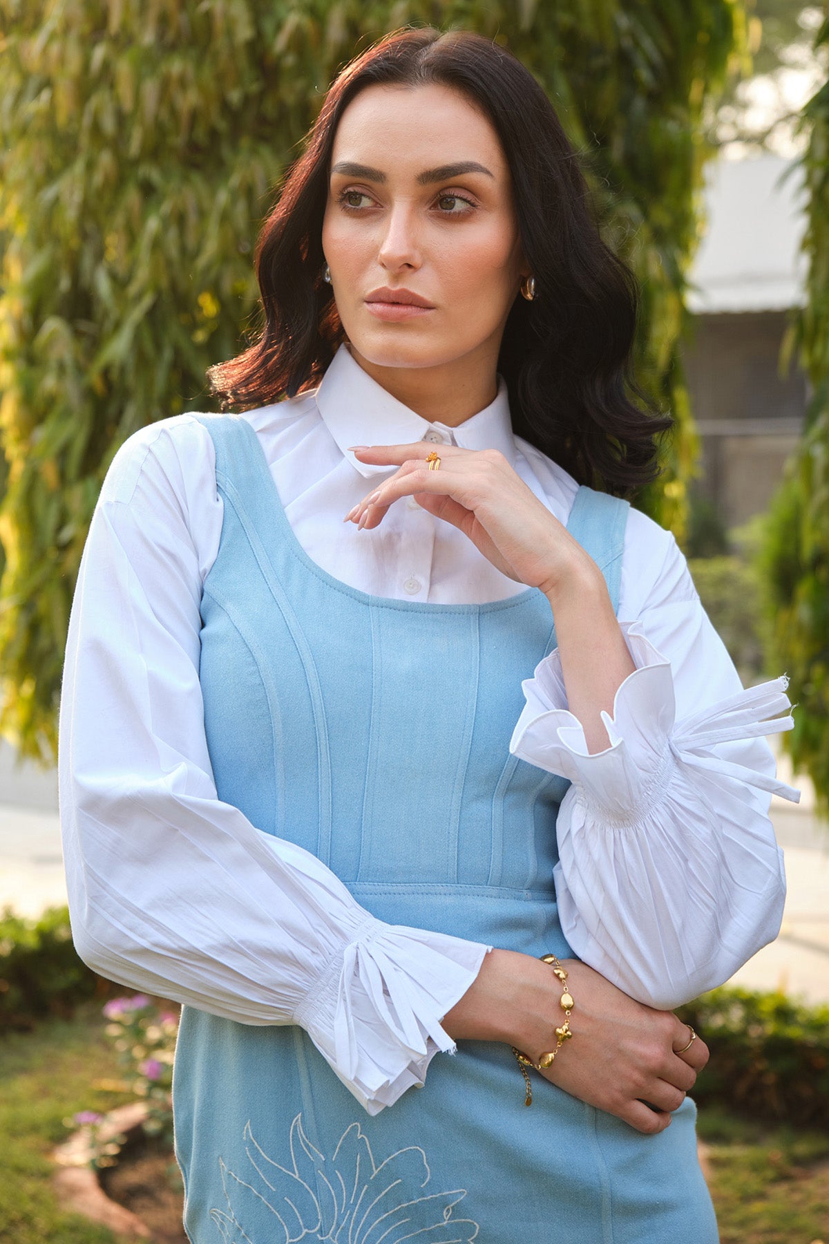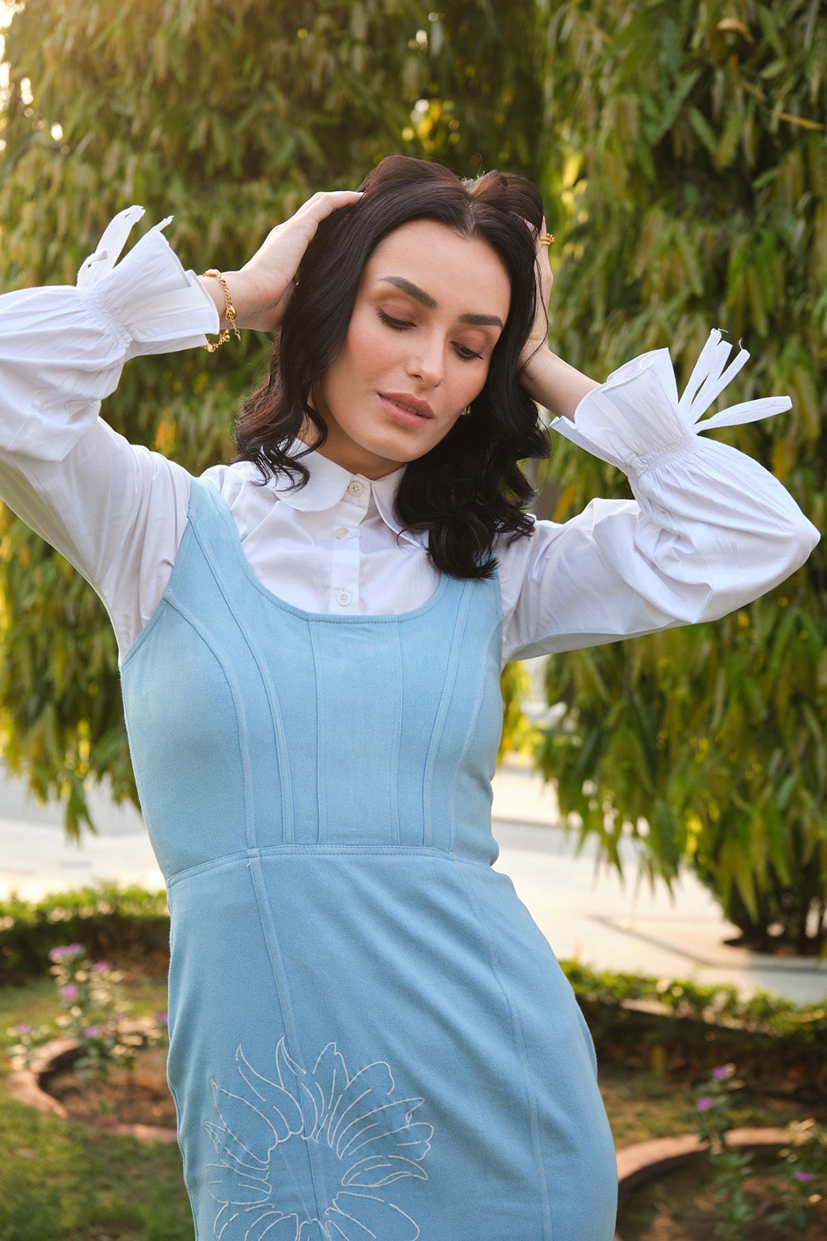 Denim blue white denim, lycra and cotton poplin midi dress featuring embroidery flower on the front and side slit paired with straight cut shirt and tie details