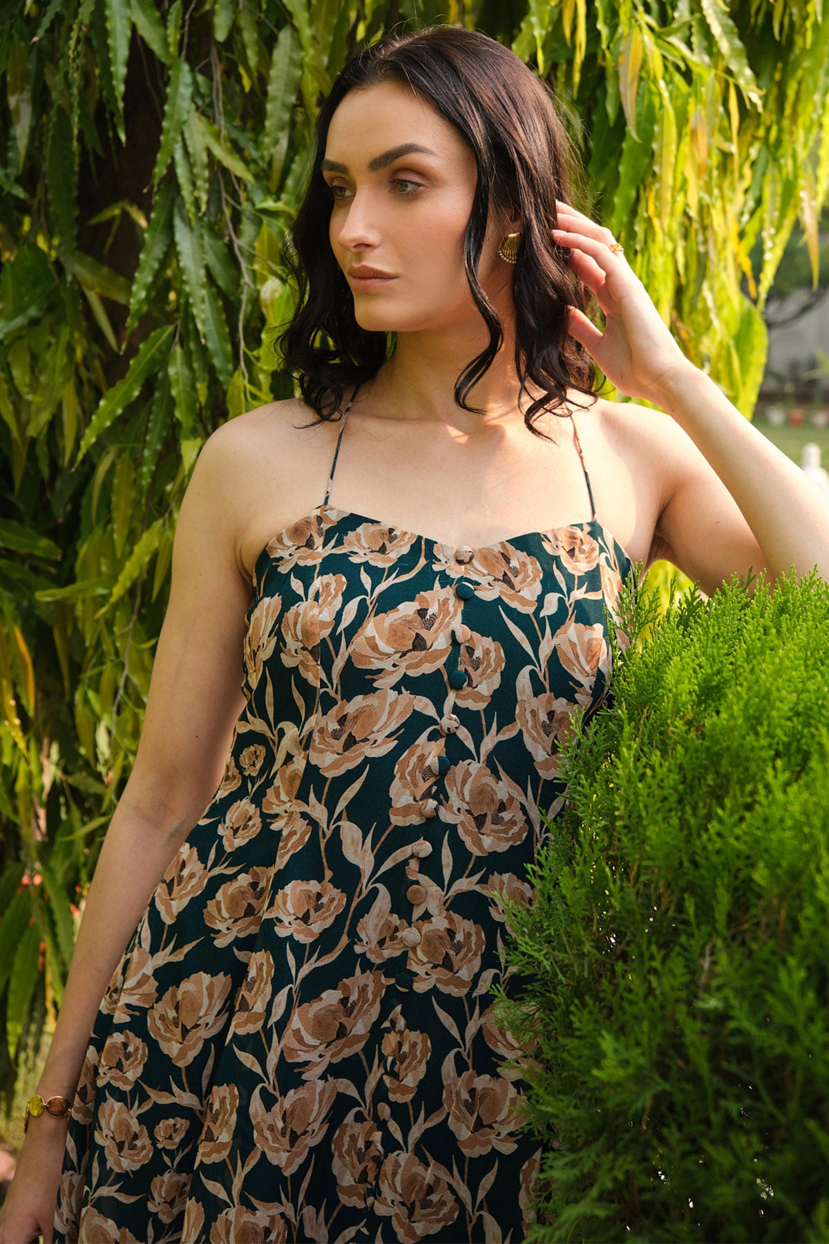 Green and black georgette floral digital printed halter neck dress with criss cross straps at the back and buttons on the front