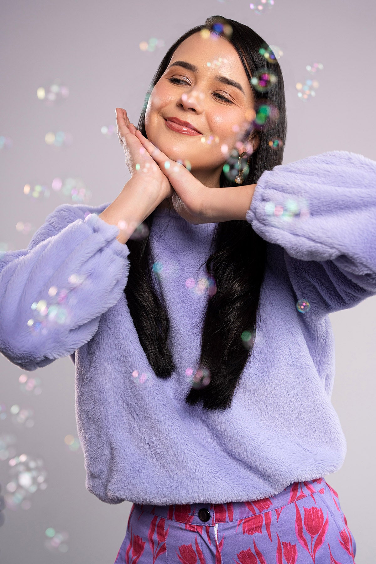 Lavender cotton, satin and fur fusion set featuring teddy top with full sleeves paired with printed pants and comfortable fit