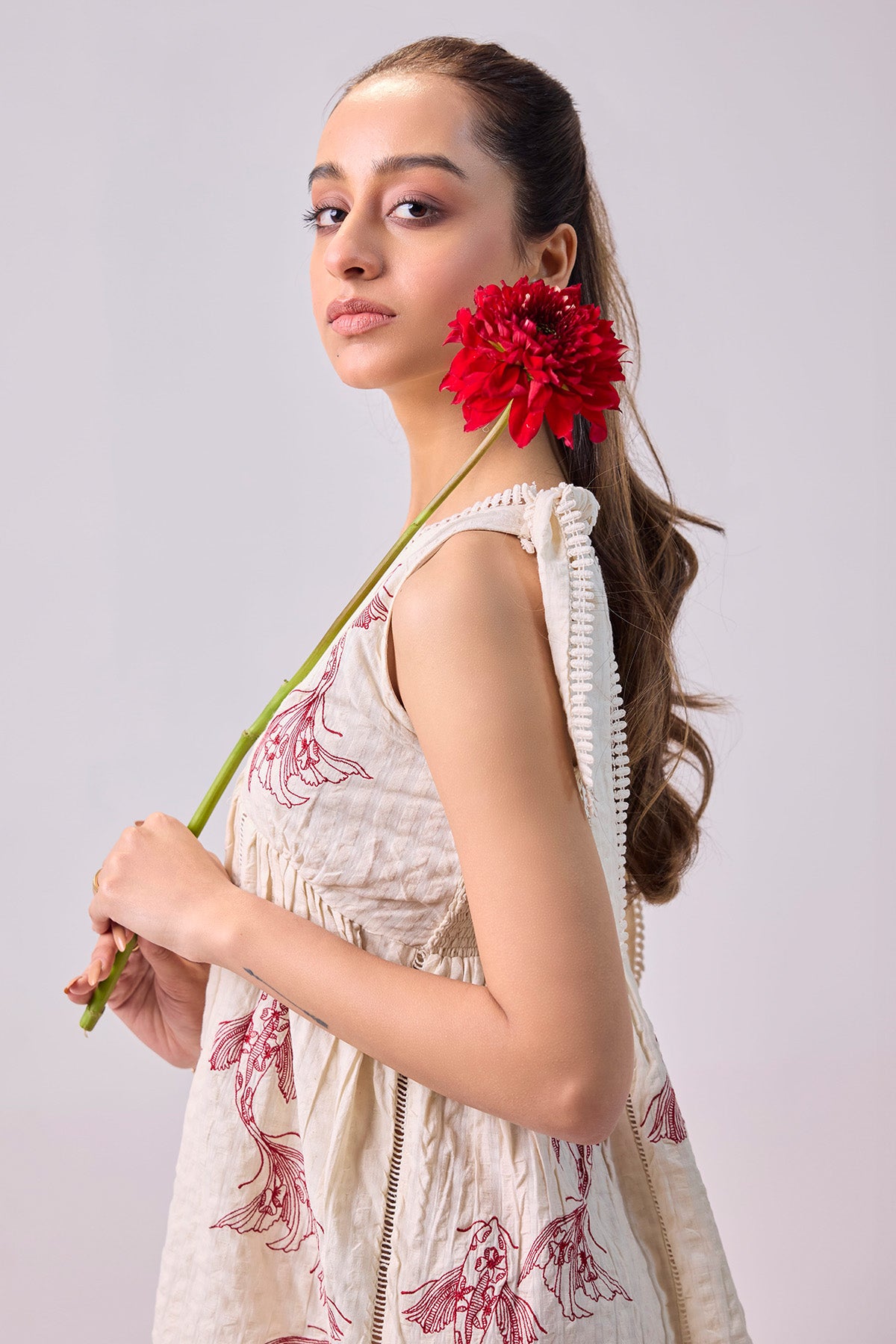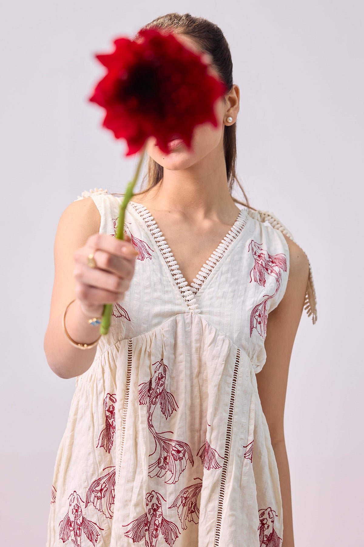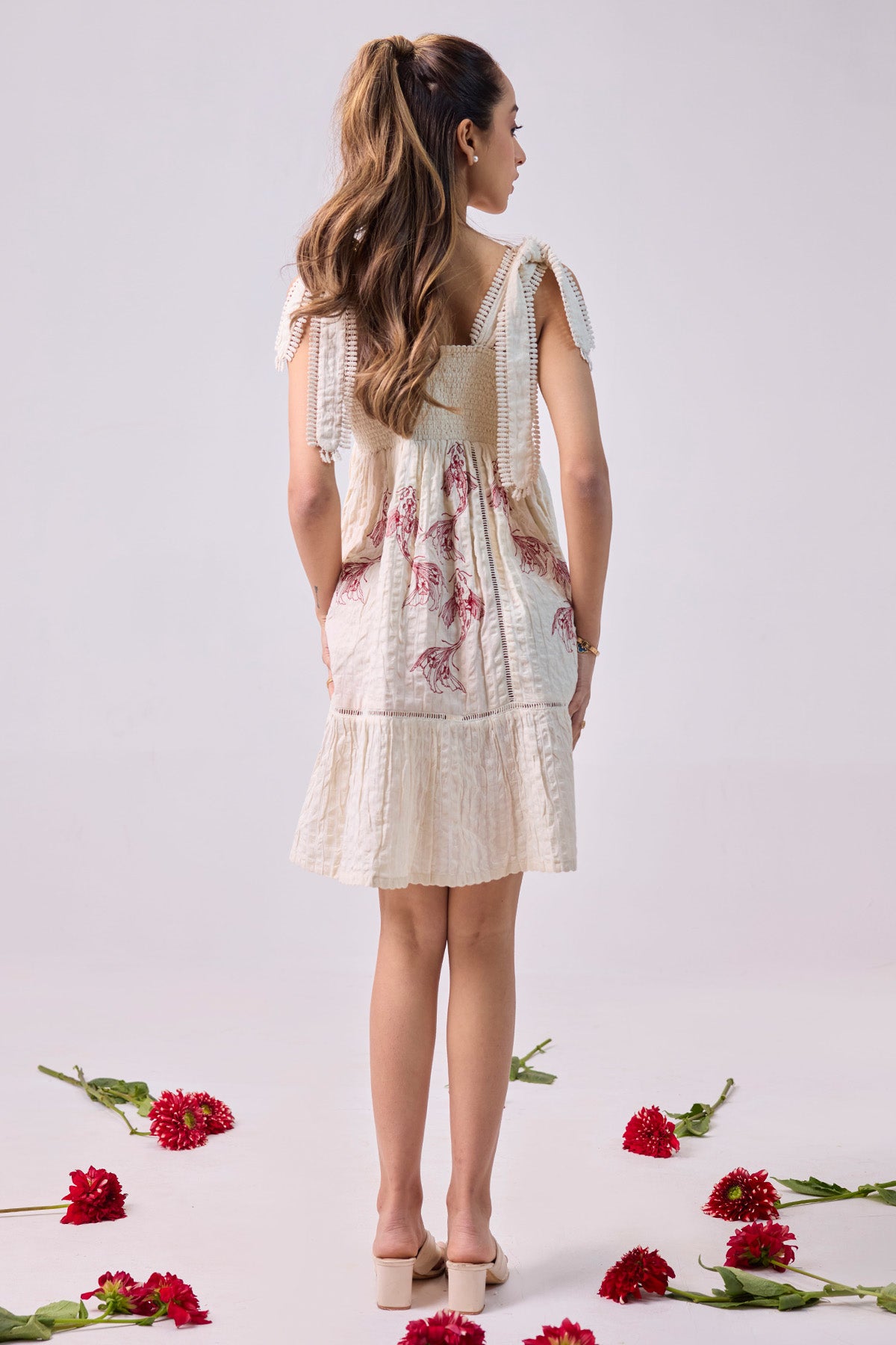 Off white and maroon cotton dobby mini dress featuring V neck, sleeveless, embroidery work and tie details on the shoulder with comfortable fit