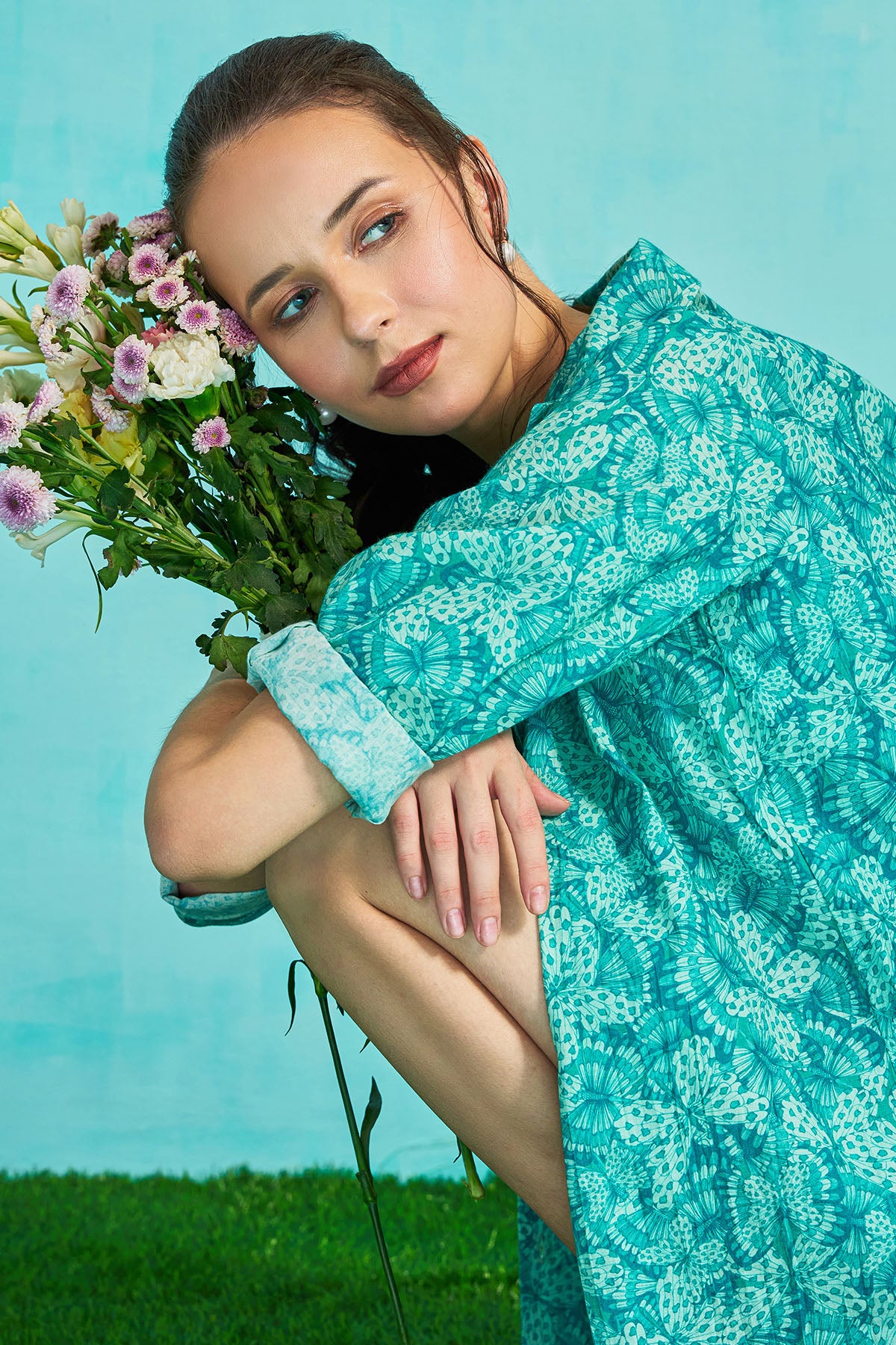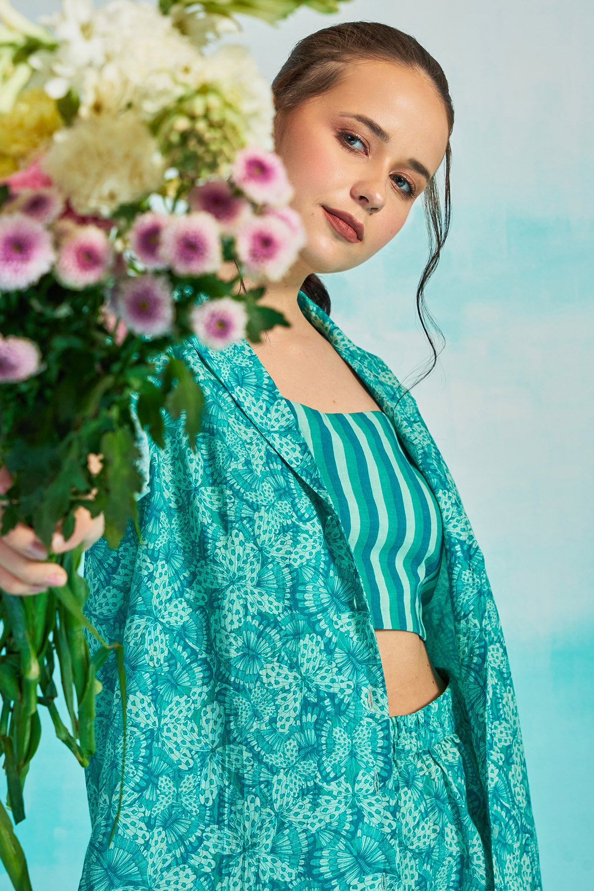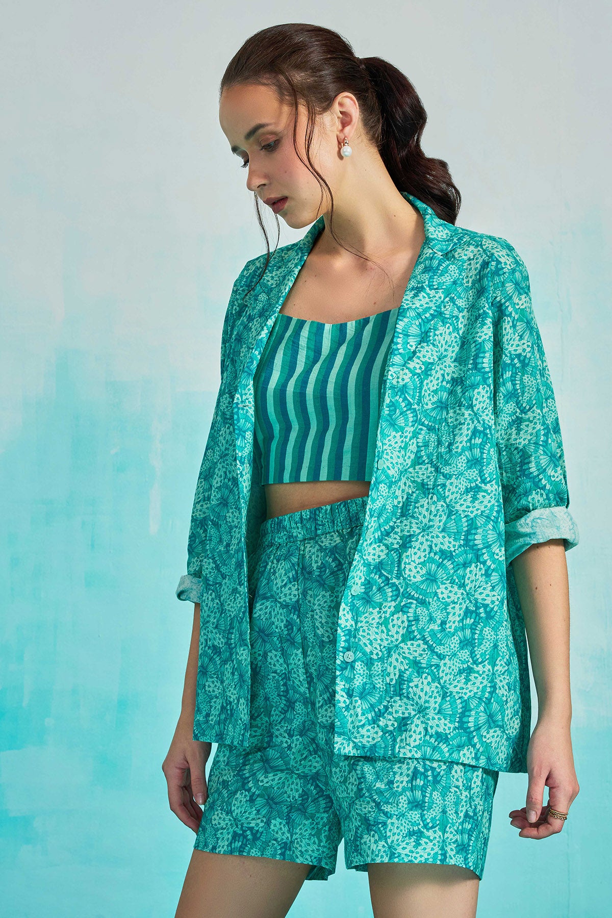 Teal organic cotton digital printed co-ord set with oversized shirt paired with comfortable fit crop top and shorts