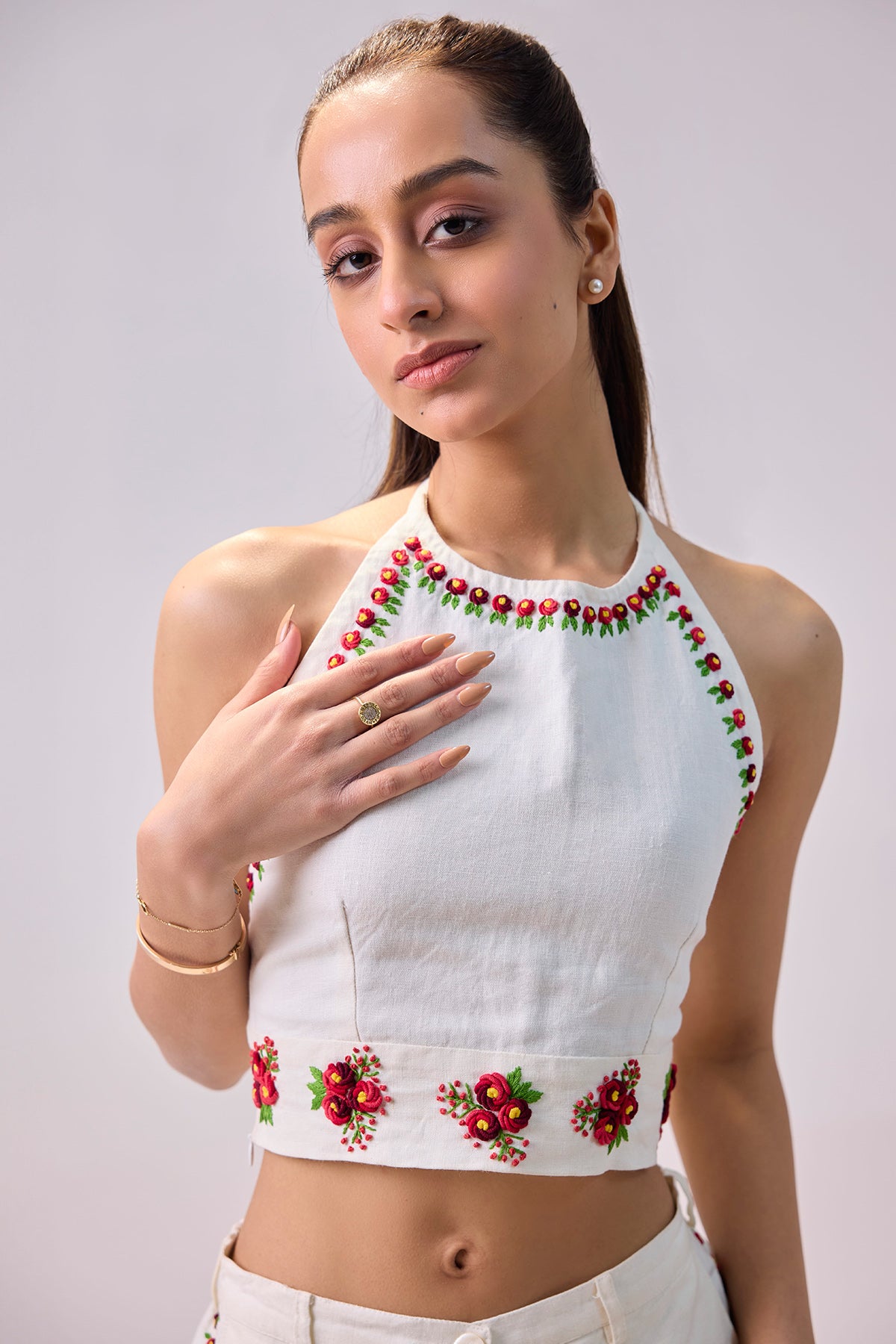 White, deep red and green 100% linen co-ord set featuring floral hand embroidery halter neck sleeveless top paired with wide leg pants