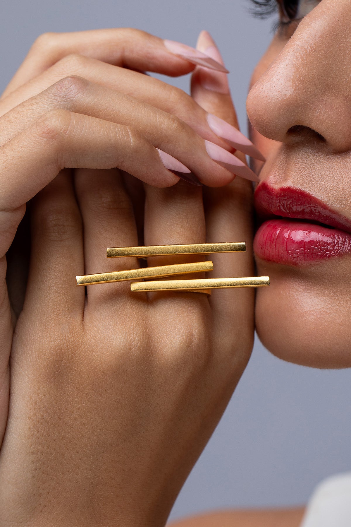 Golden brass stacked ring with layered line shape and bold shade. The dimension is 2.5H, 6.5L, 0.1W
