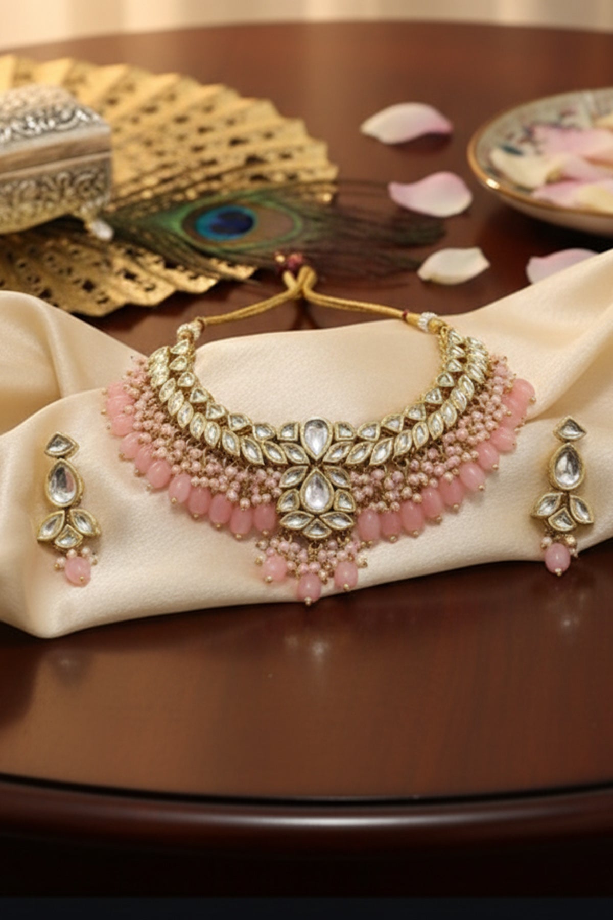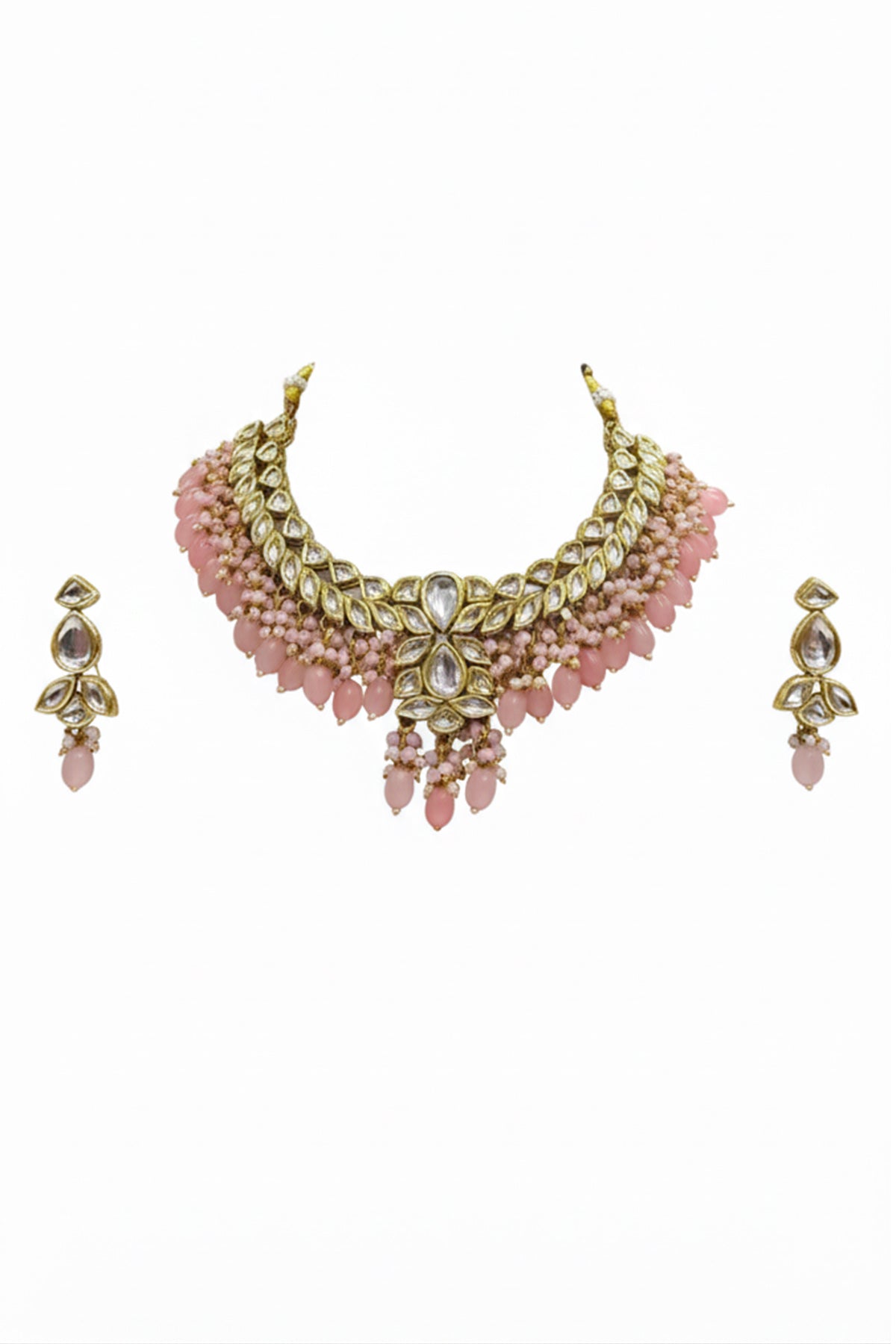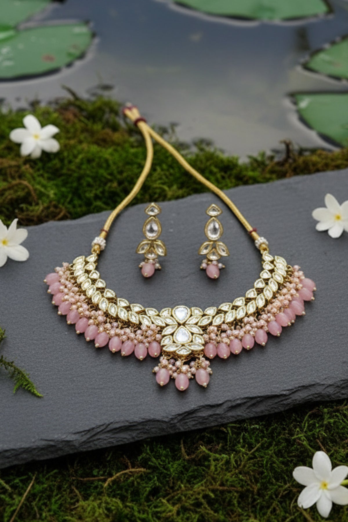 Pink mixed metal jewellery set featuring floral leaf pearl necklace with beads and gold plated finish paired with dangler earrings