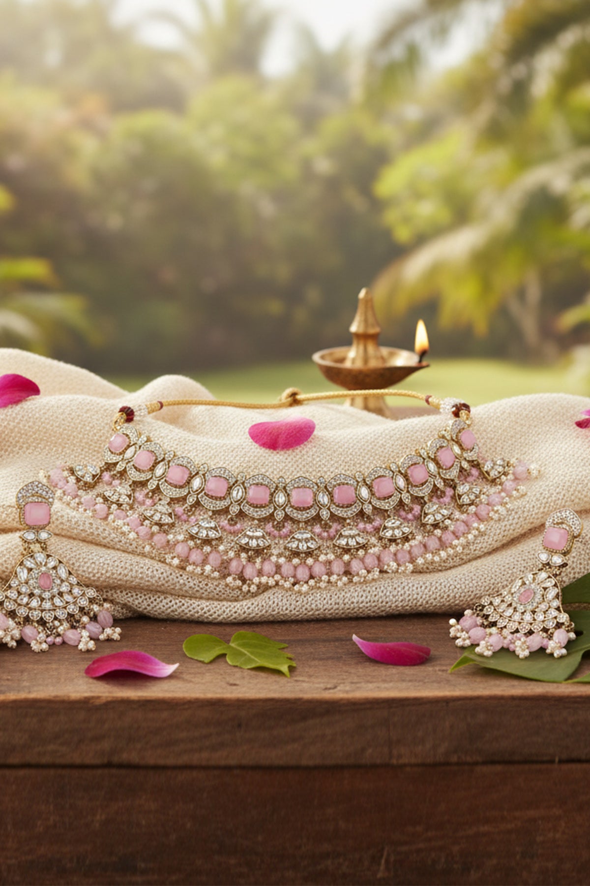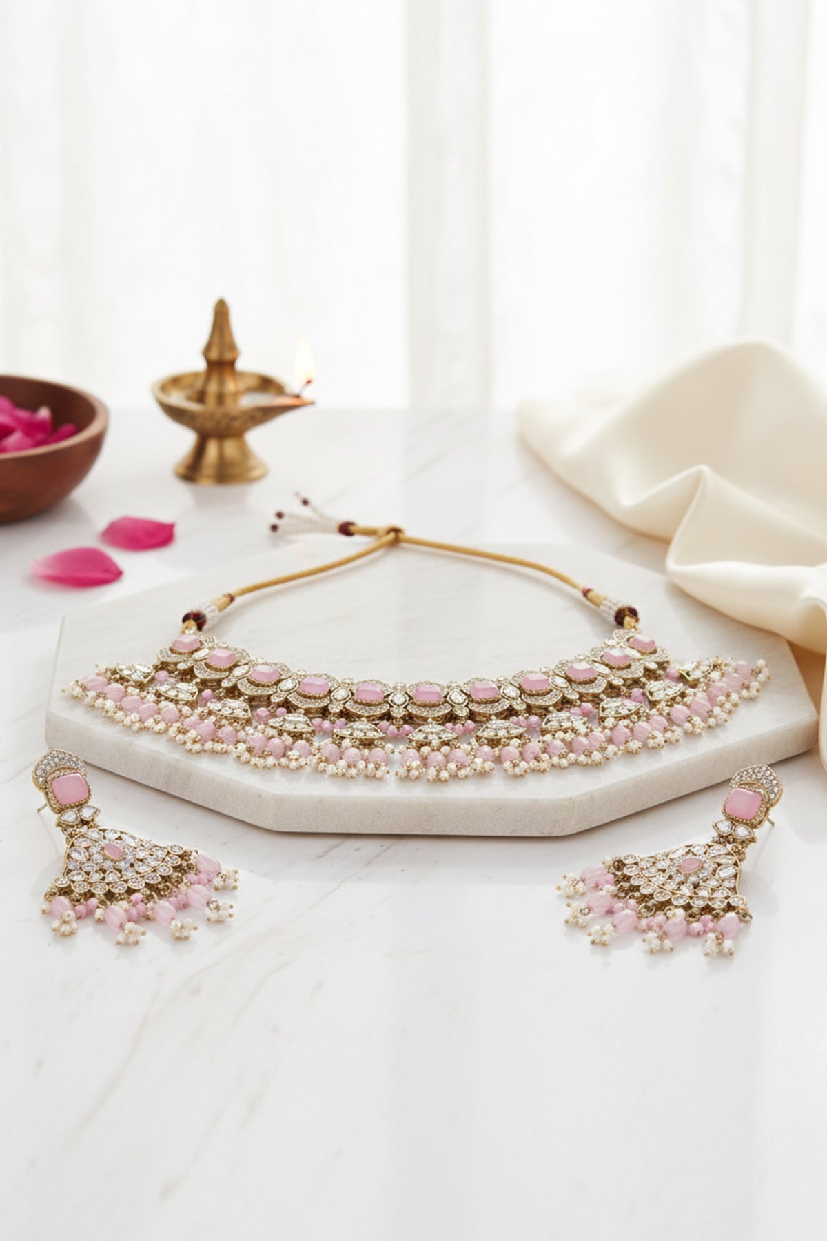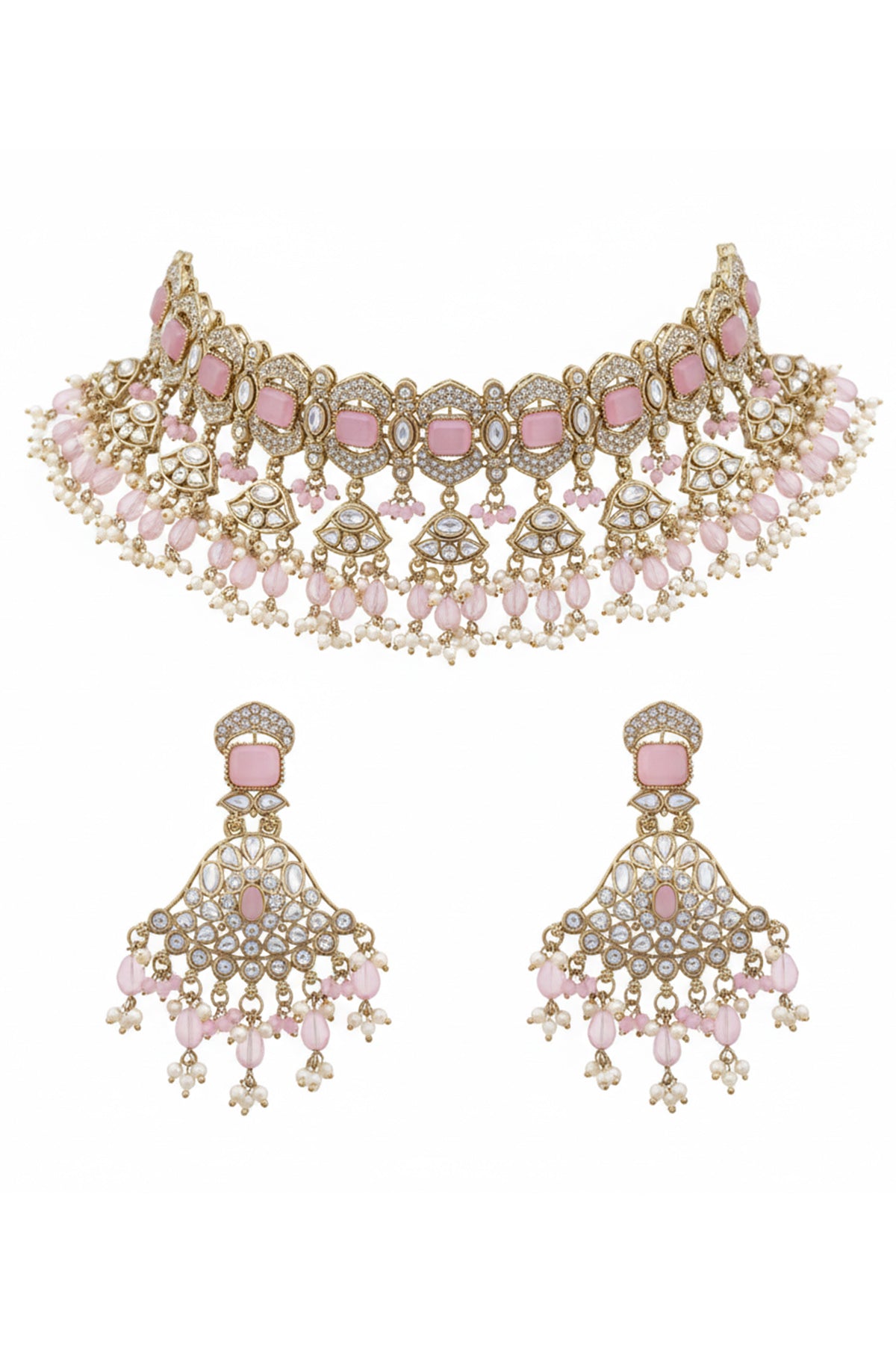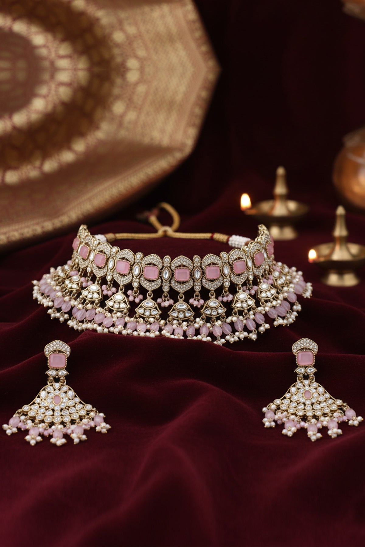 Pink mixed metal kundan jewellery set featuring white stone work choker necklace with teardrop beads and creamy pearl paired with pearl danglers earrings