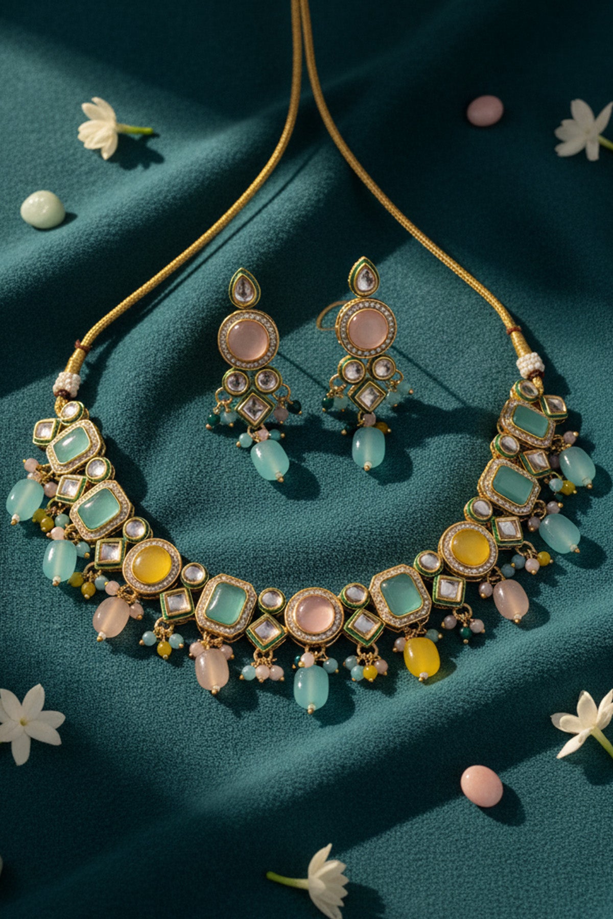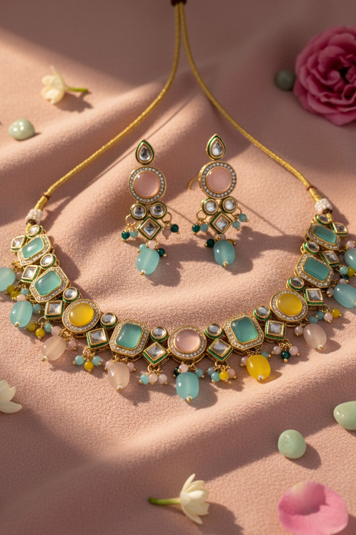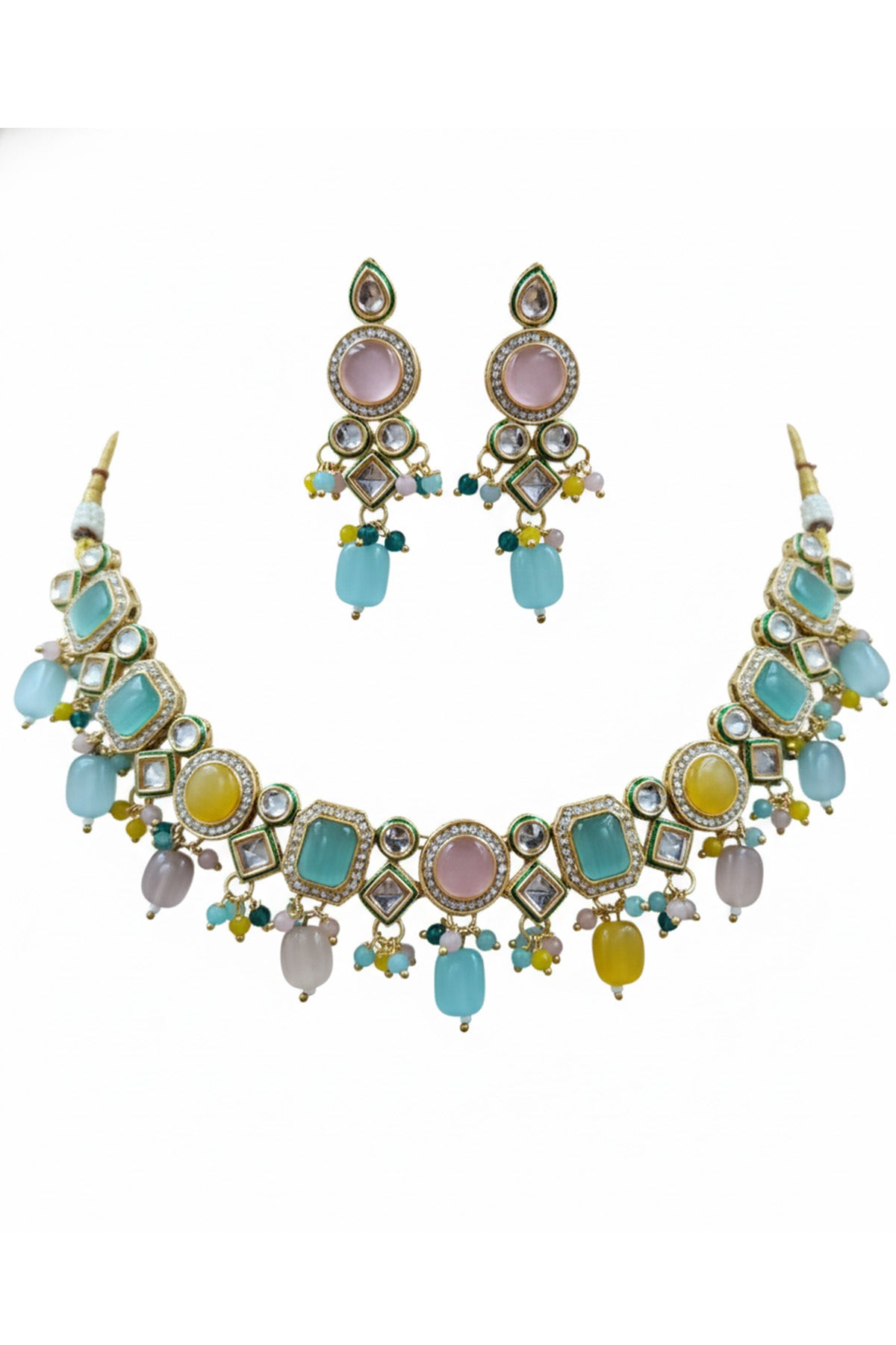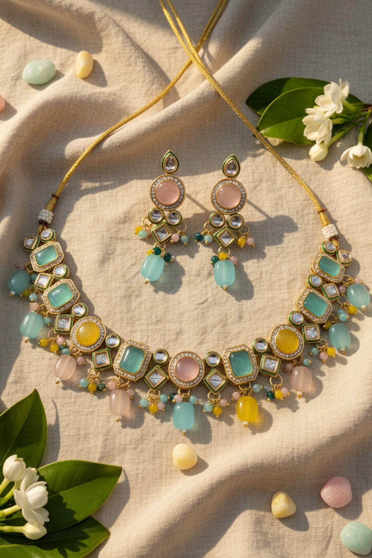 Pink and yellow mixed metal jewellery set featuring kundan style stone necklace with pastel drops and gold toned paired with dangler earrings