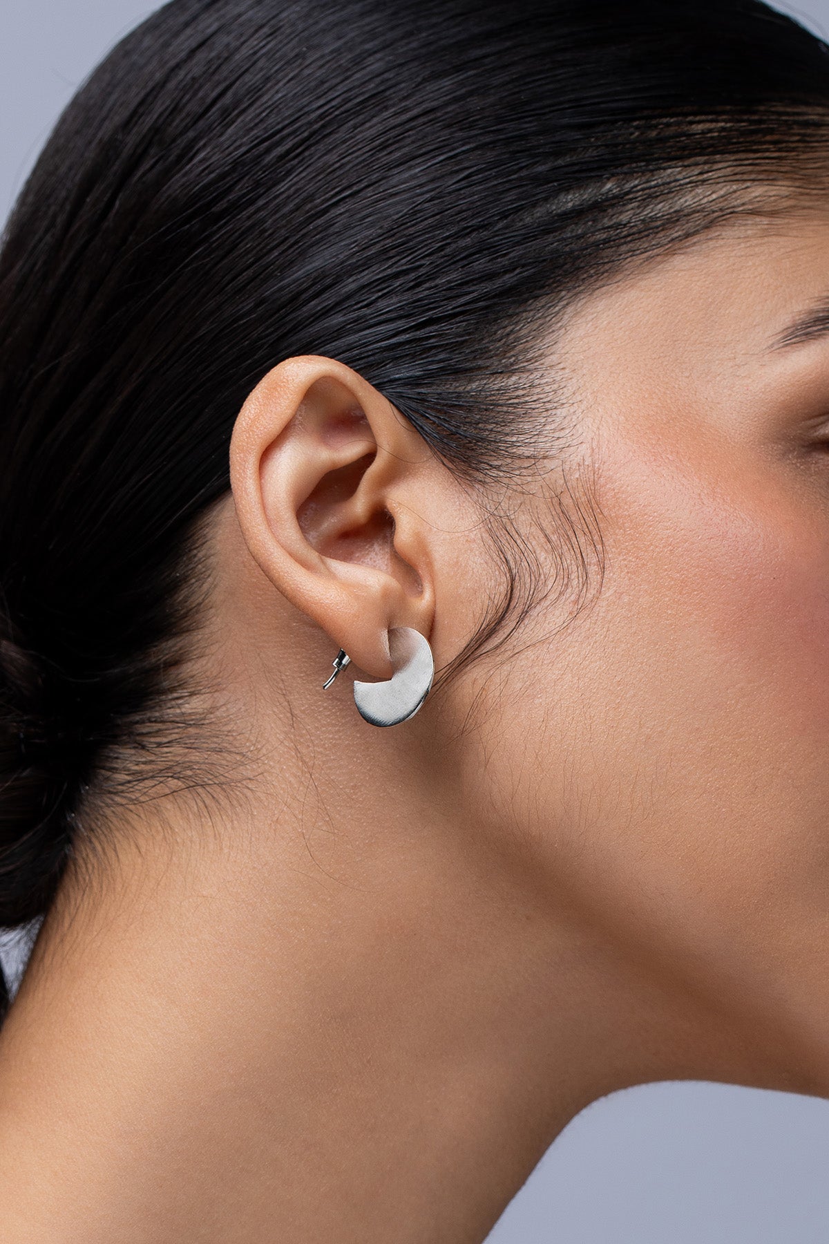 Silver brass earrings with unique crescent shape. The dimension is 2H, 2.5L, 0.1W