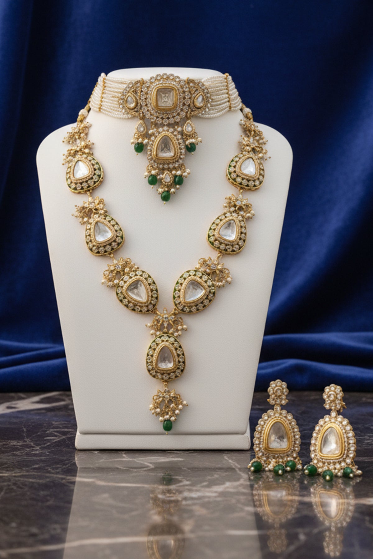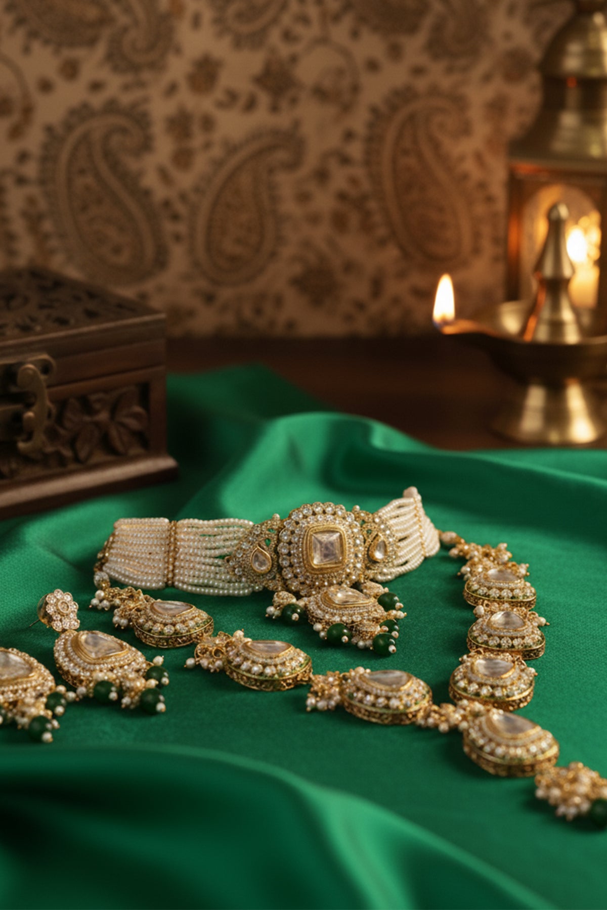 White gold mixed metal jewellery set featuring antique gold toned choker with kundan style, pearl accents and beaded drop paired with danglers earrings