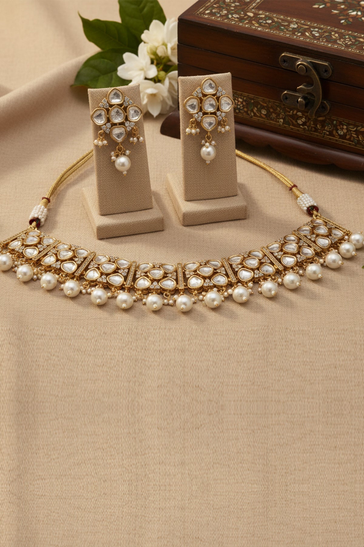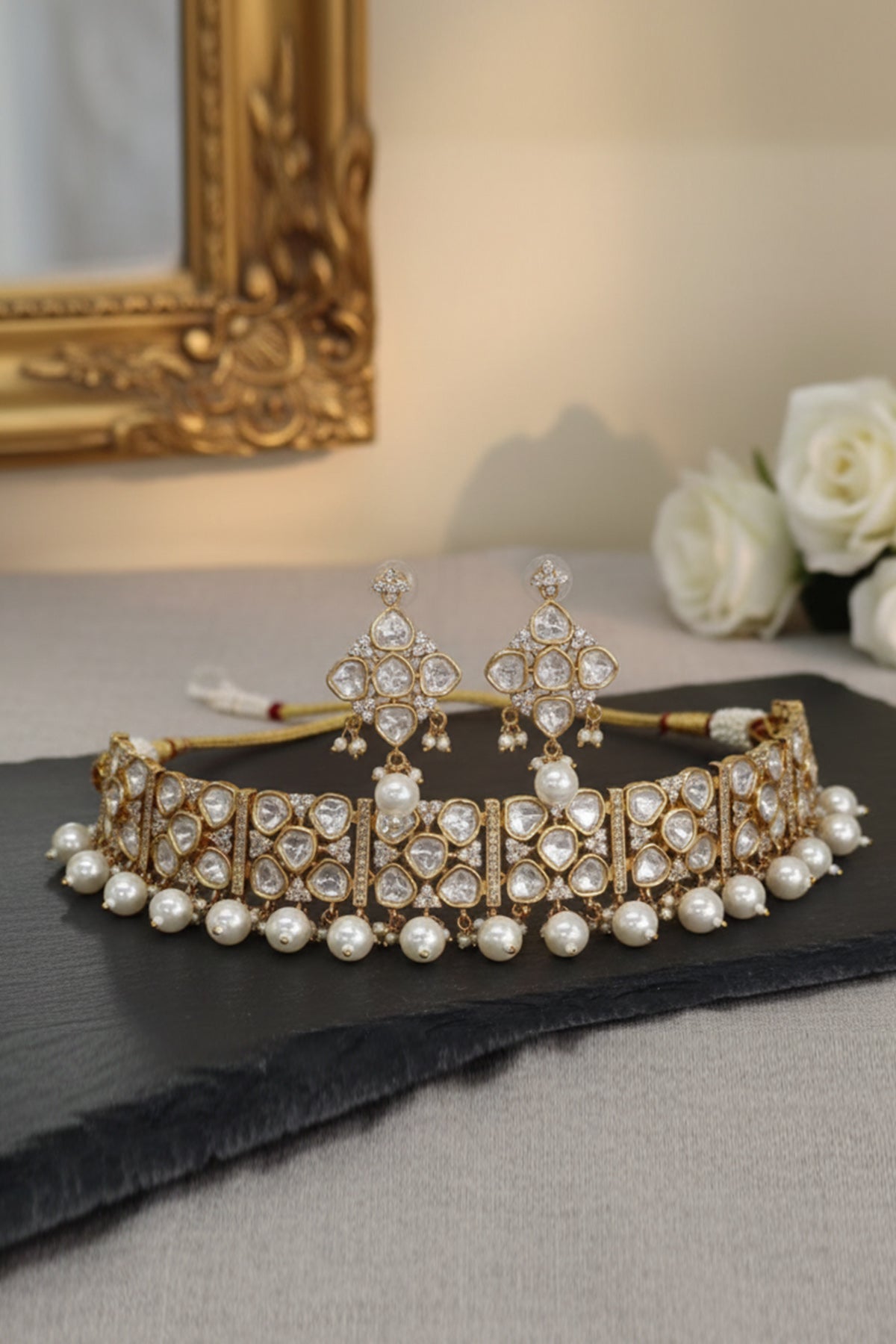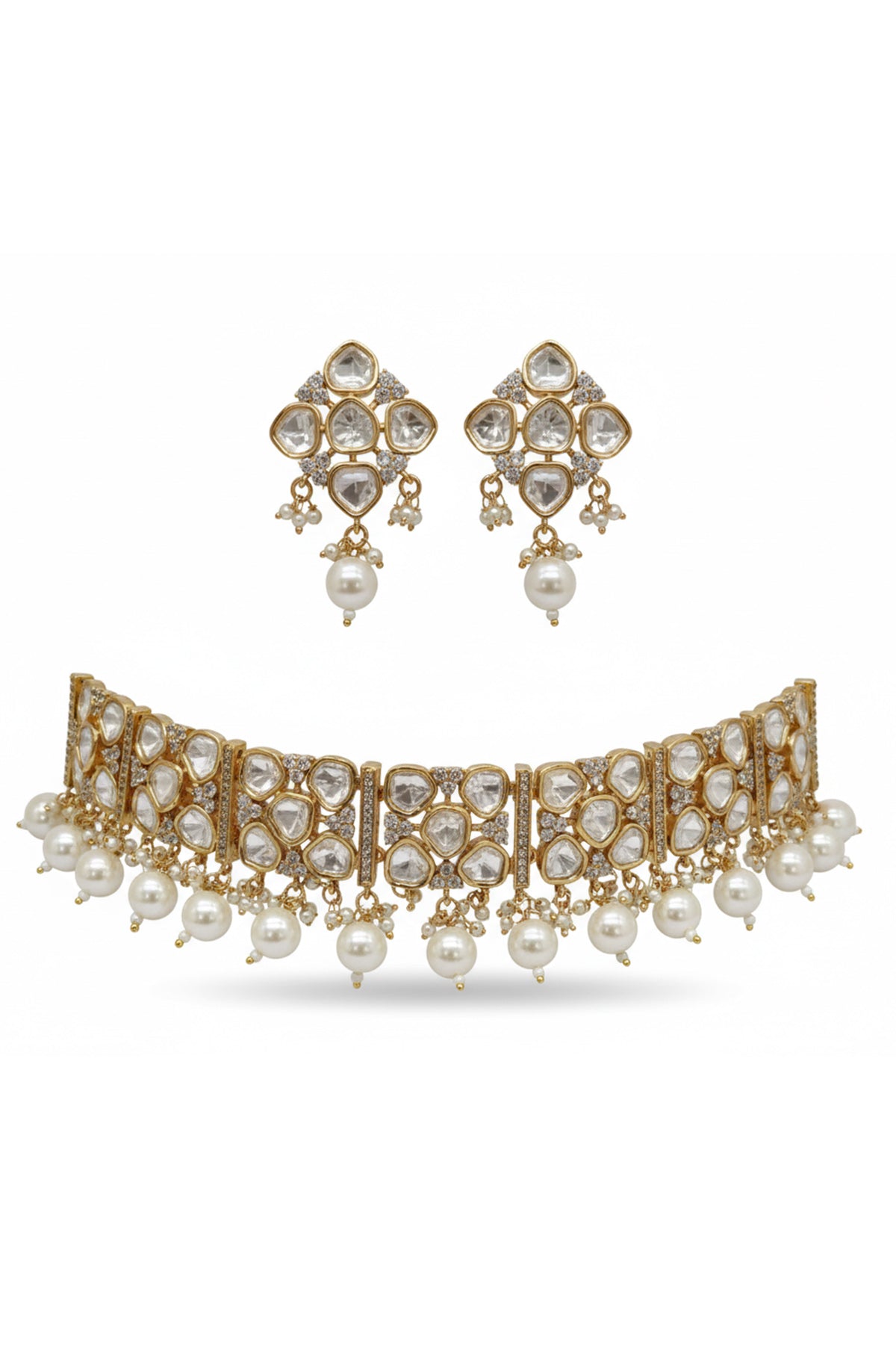 White gold mixed metal jewellery set featuring kundan style stone choker with gold tone base and pearl drops paired with studs earrings