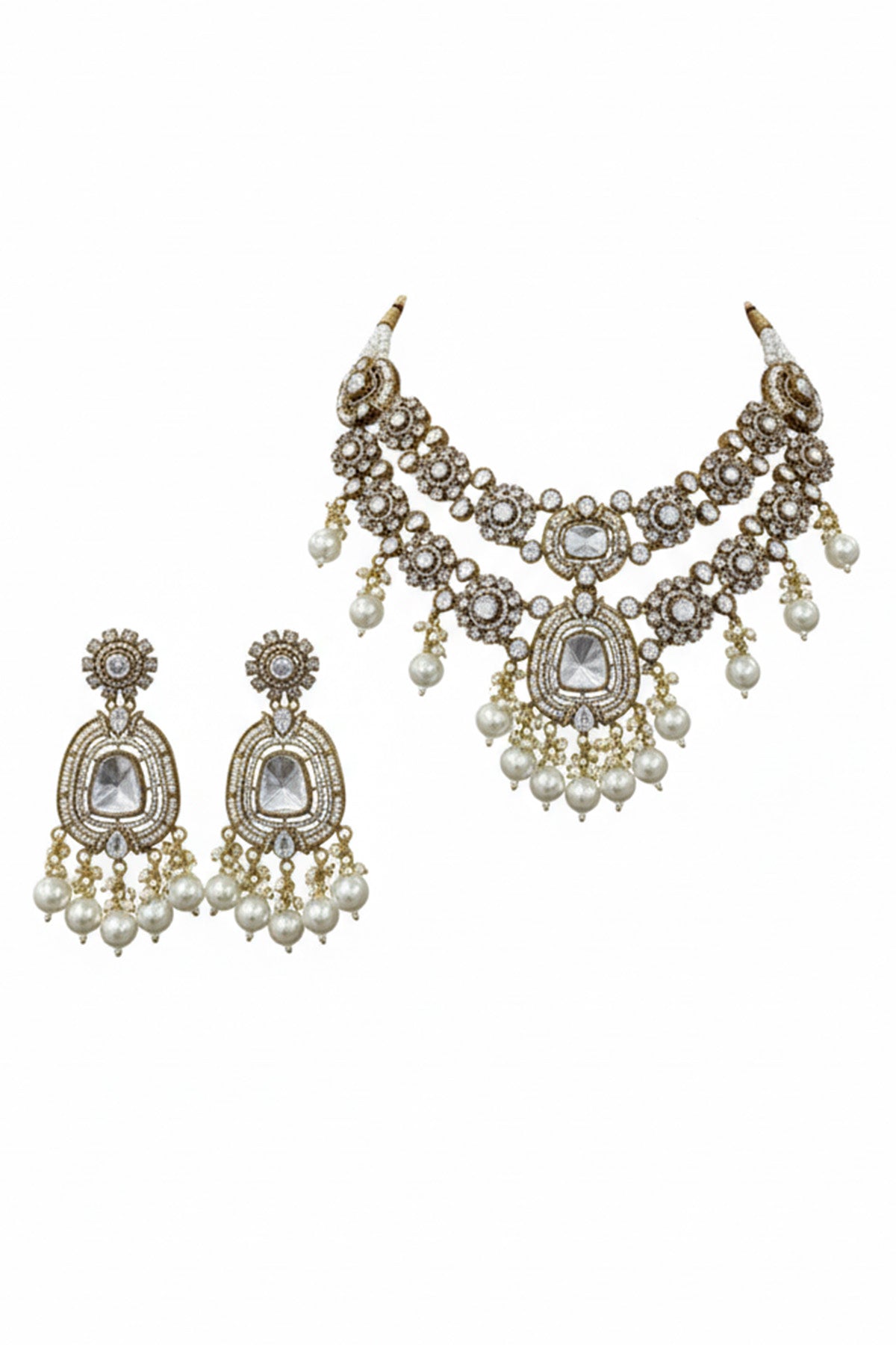 White gold mixed metal jewellery set featuring kundan stone work choker with pearl drops and polki detailing paired with pearl dangler earrings