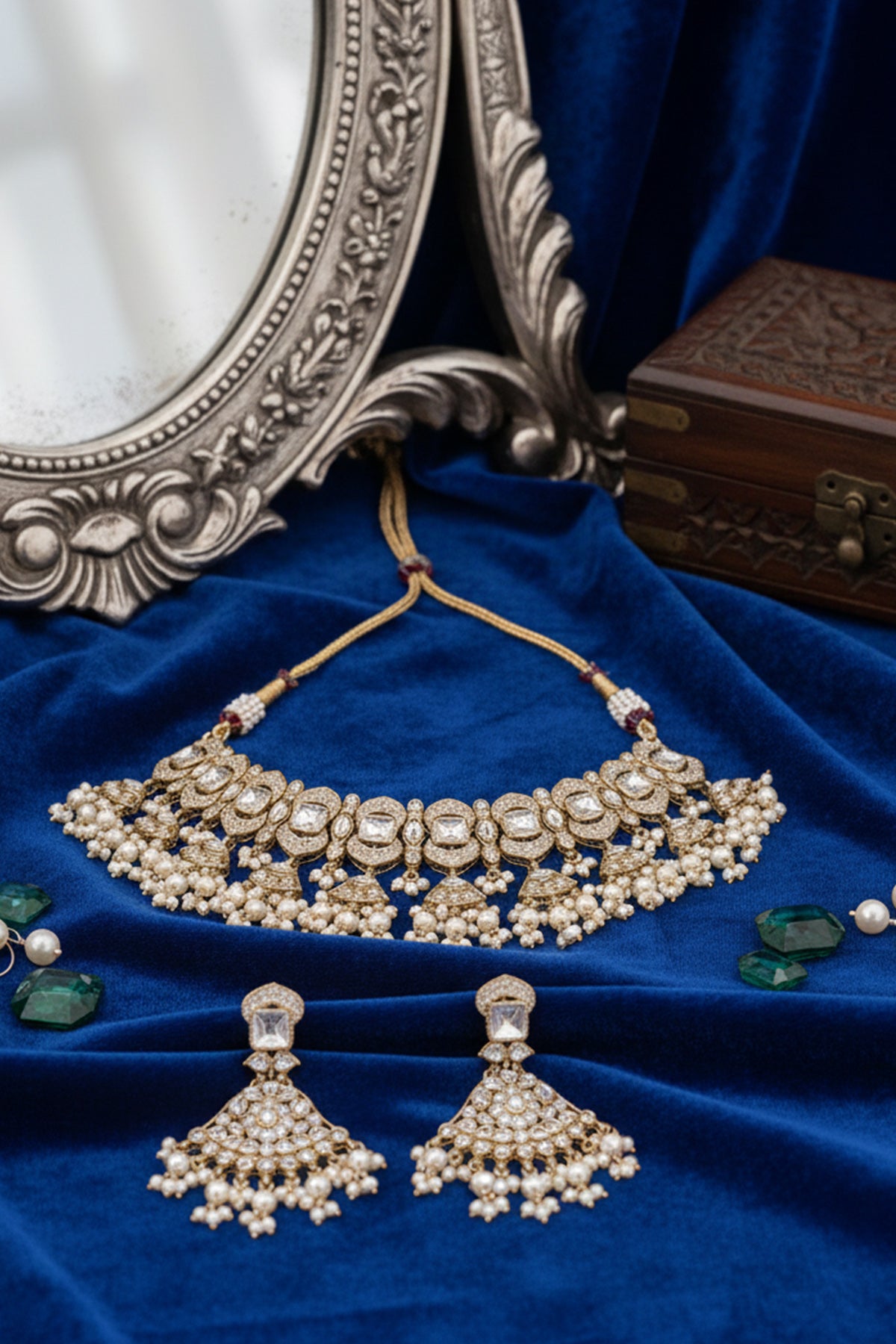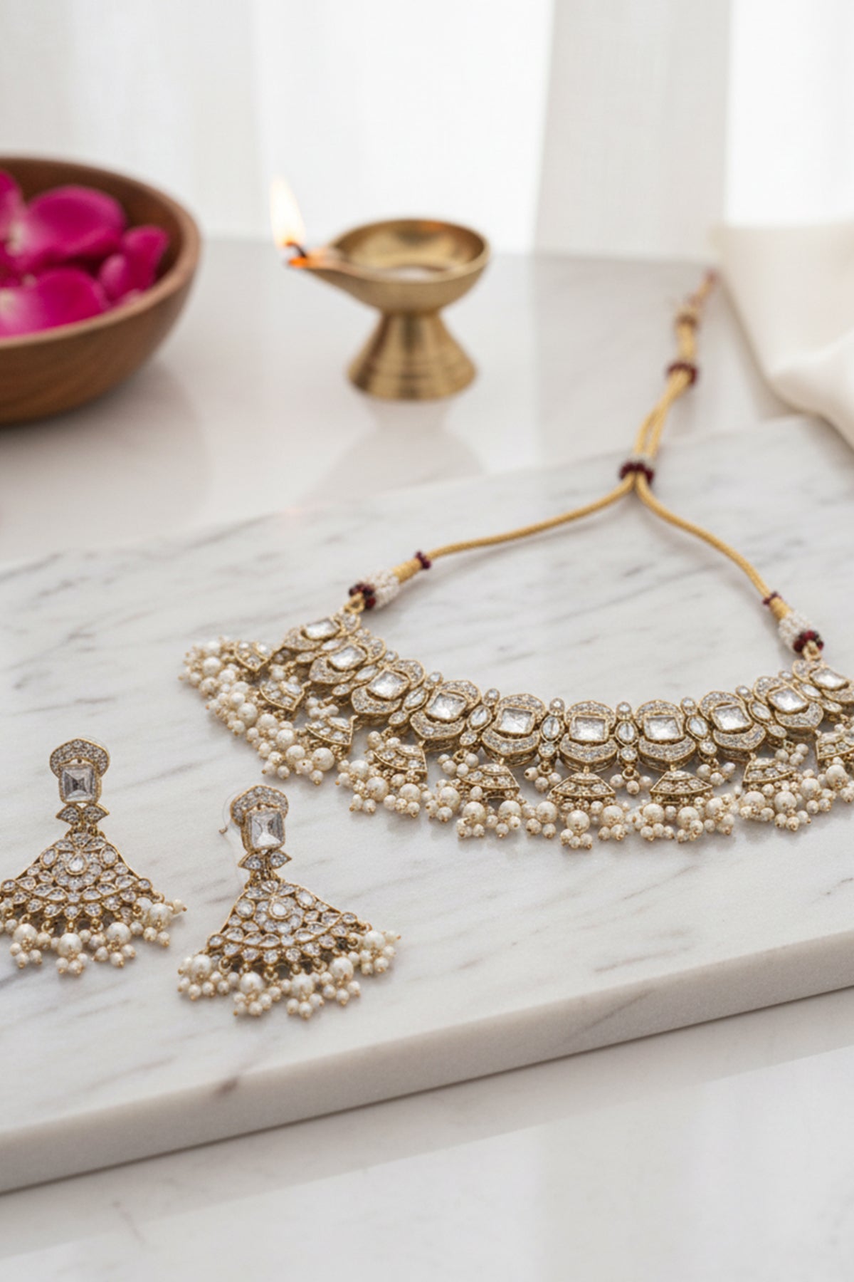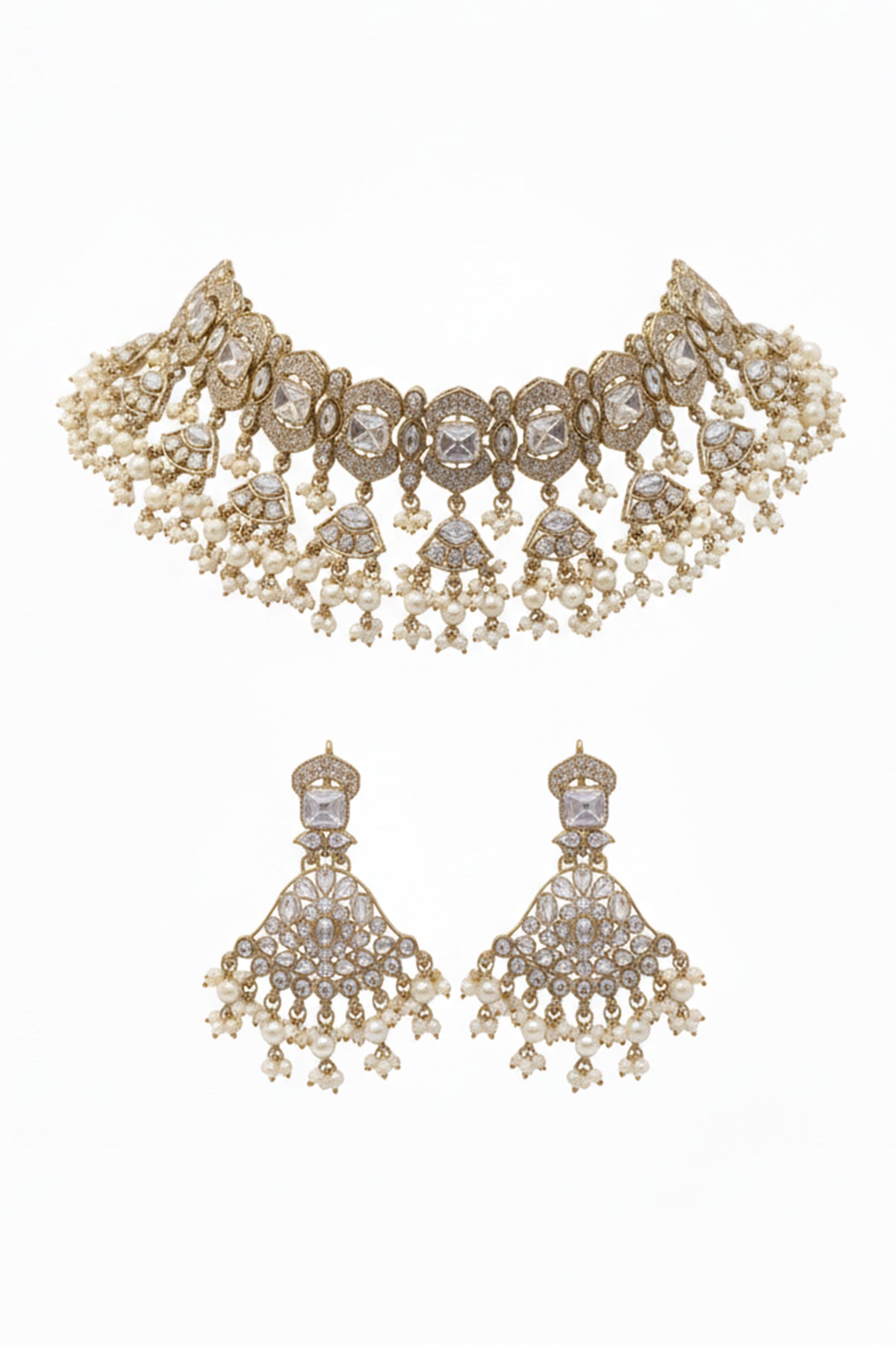 White gold mixed metal kundan jewellery set featuring white stone work choker necklace with teardrop beads and creamy pearl paired with pearl danglers earrings
