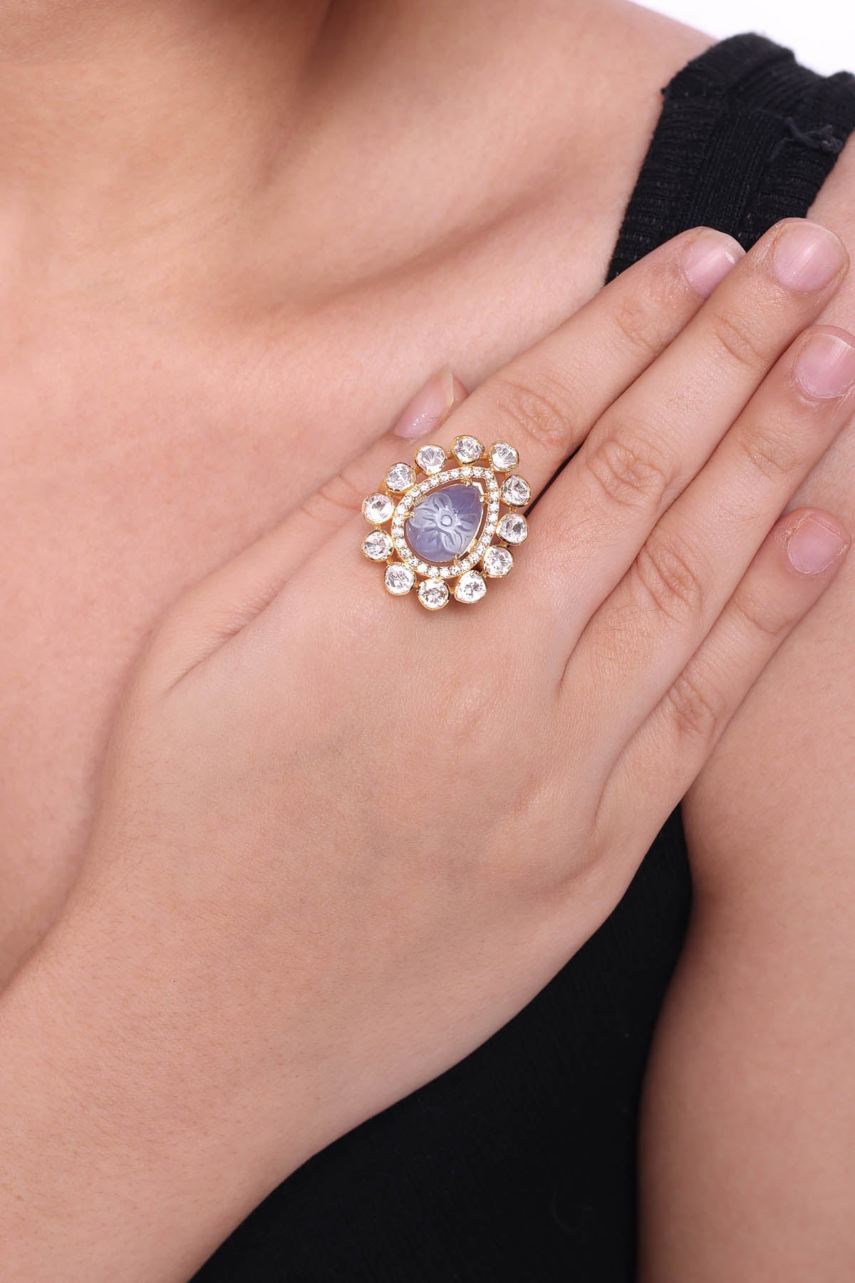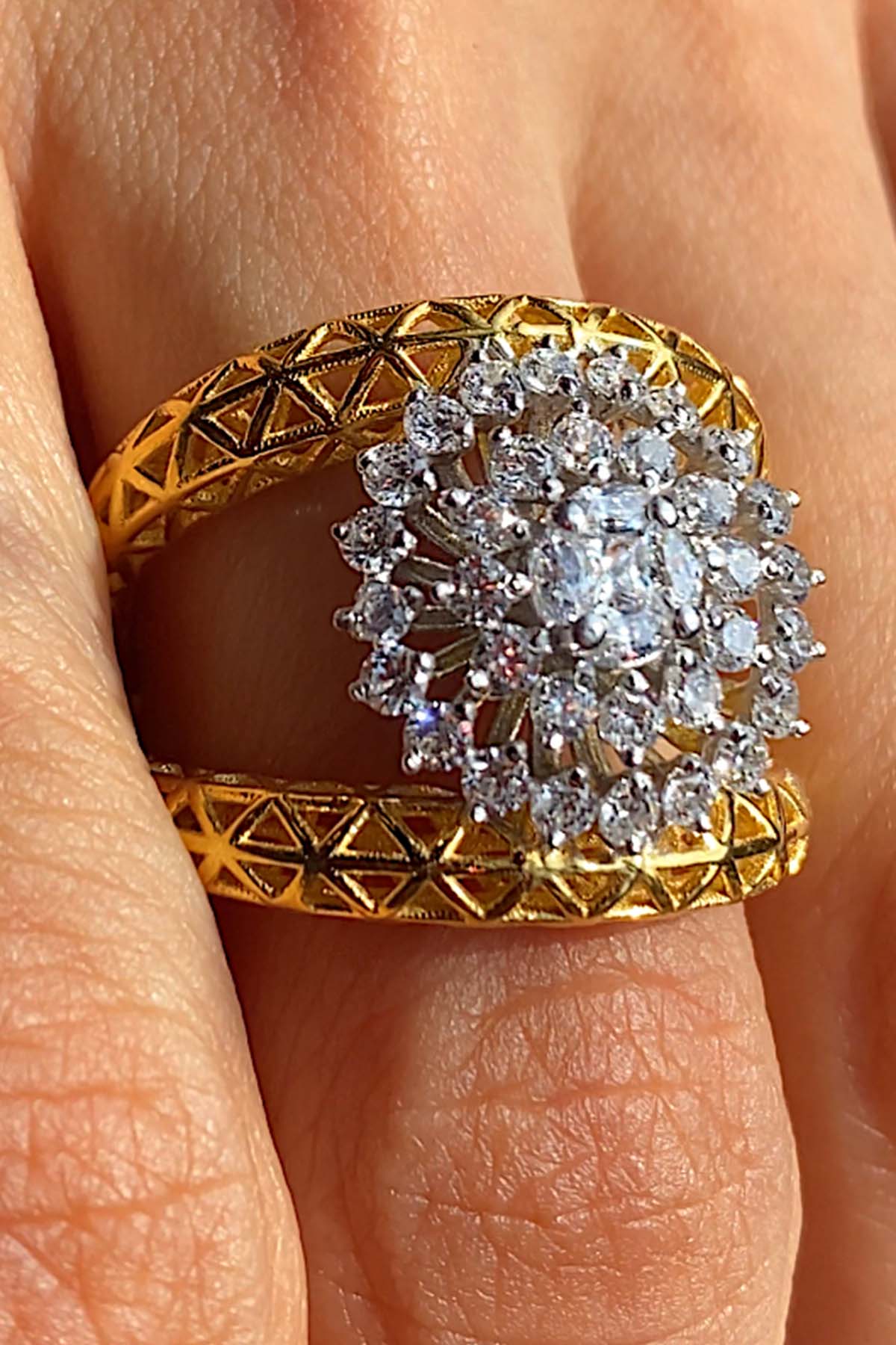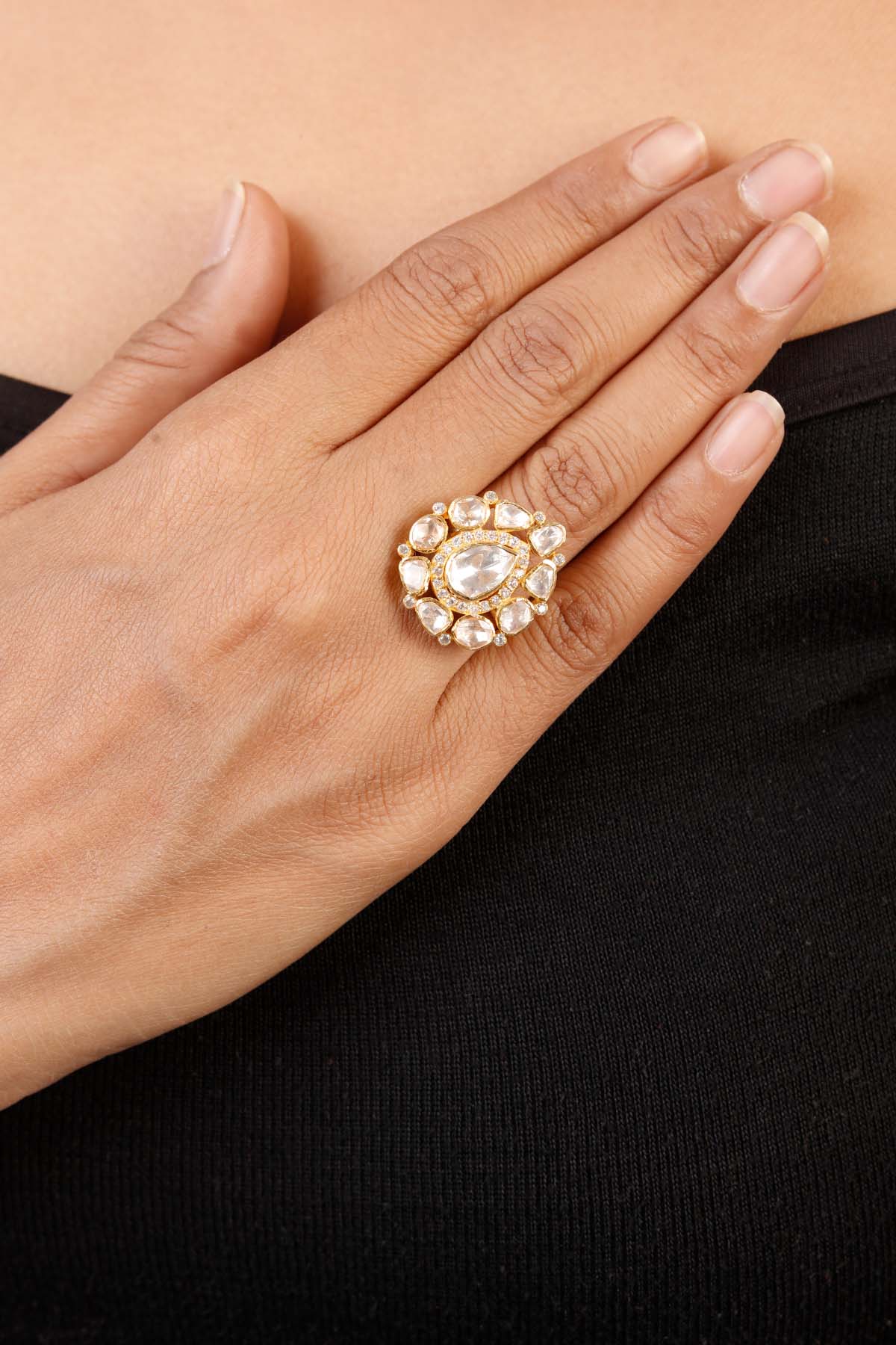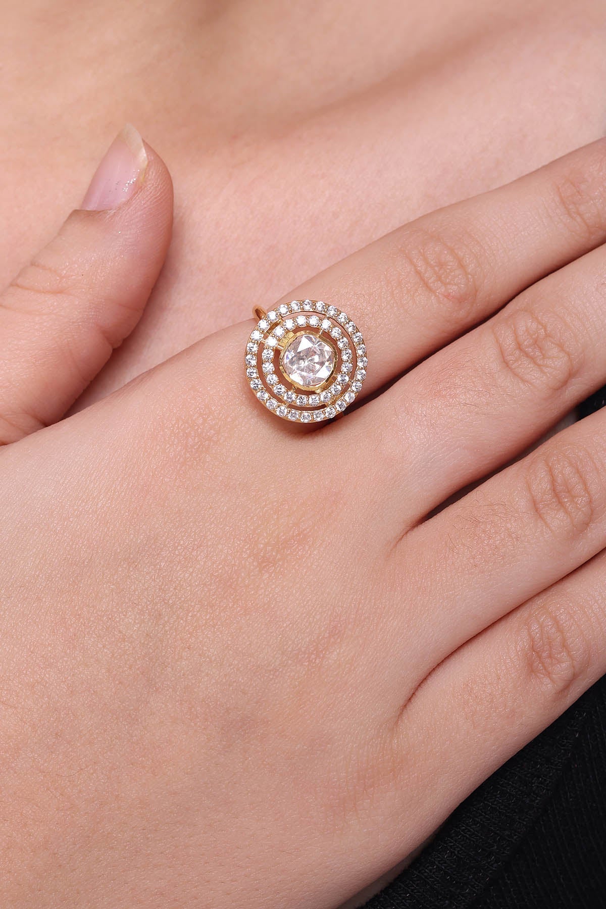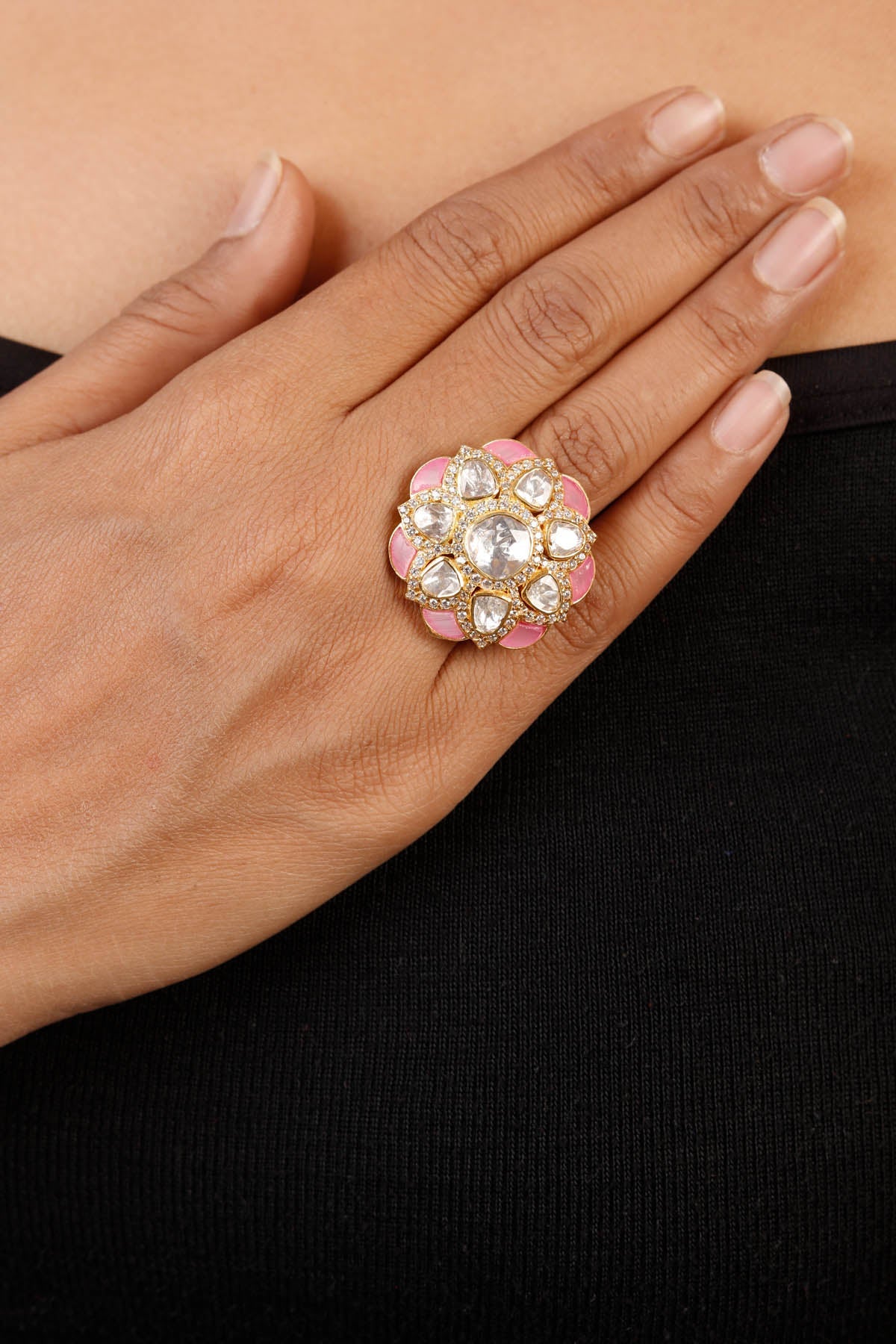 A cocktail ring is a big, ornate ring. The most popular styles feature an elaborate design with a great deal of metalwork, gemstones, and vibrant centre diamonds. Cocktail rings became a major fashion statement in the 1920s and have been fashionable ever since. As the name suggests, designer cocktail rings are offered as the first choice when styling for an eye-catching or show-stopper look for a cocktail party, New Year party, Sangeet, and more.