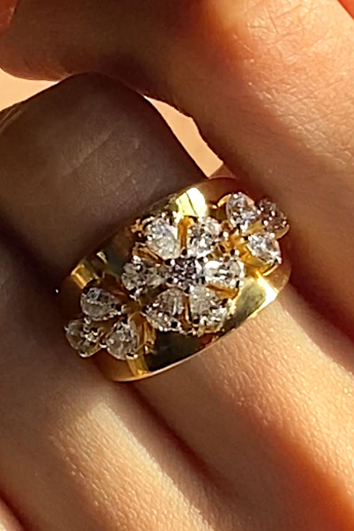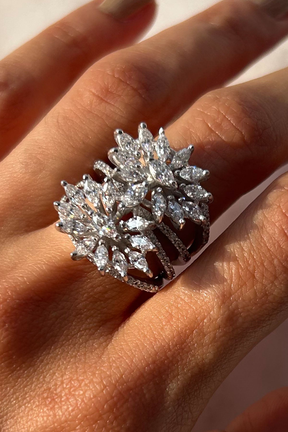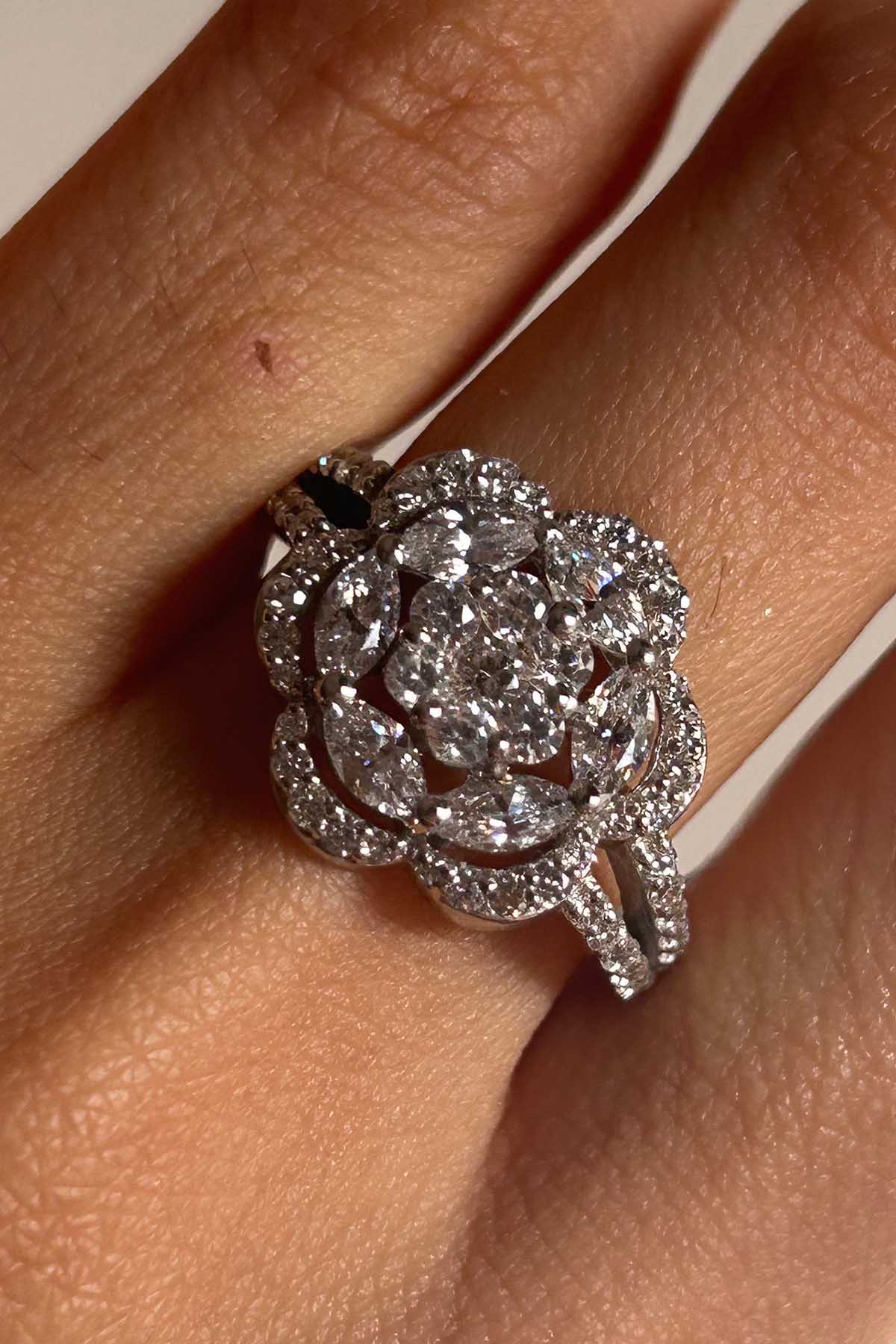 A designer cluster ring is a group of diamonds and stones that are set together to create a cluster. Cluster rings have been in trend for more than a century now; they typically feature a main stone surrounded by smaller stones or a collection of smaller stones. On the other hand, cluster rings can take on many shapes, including squares and flowers.