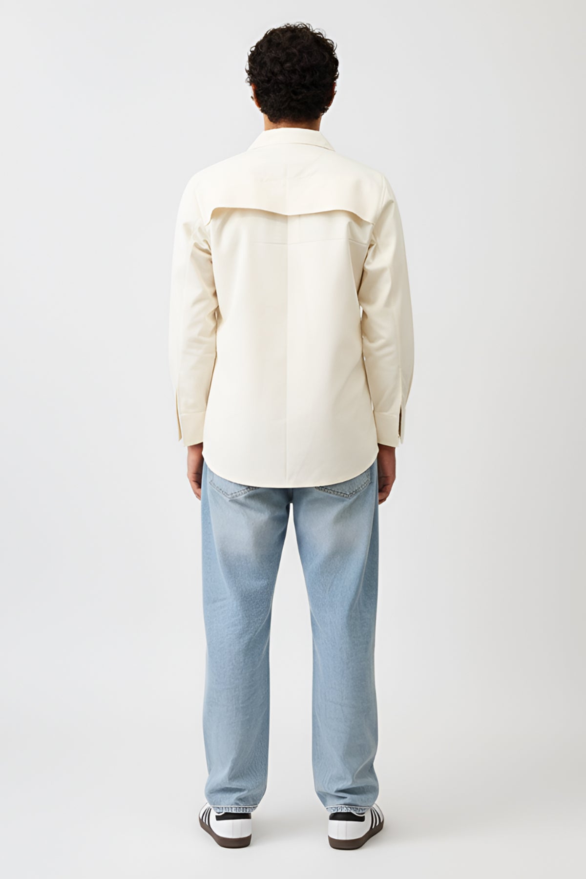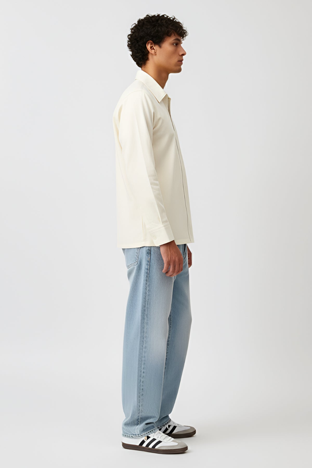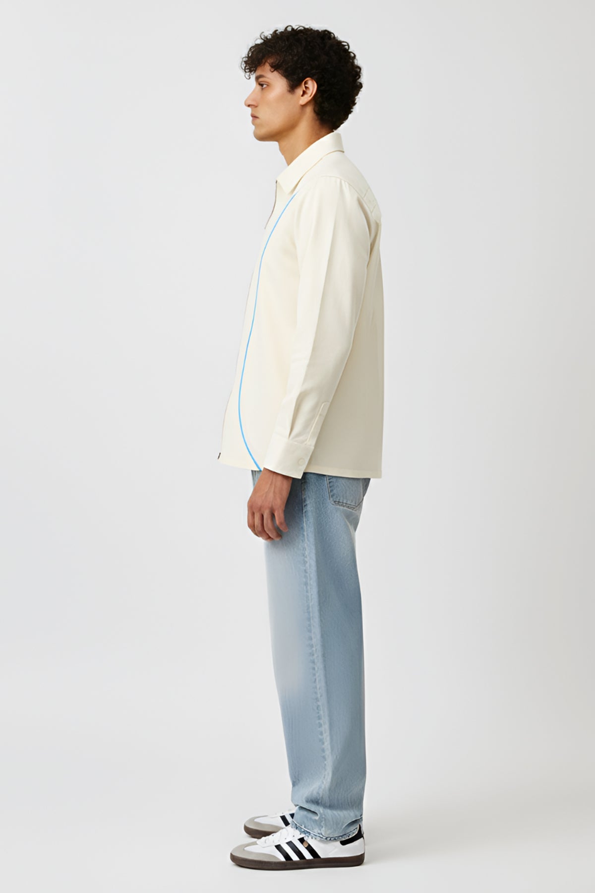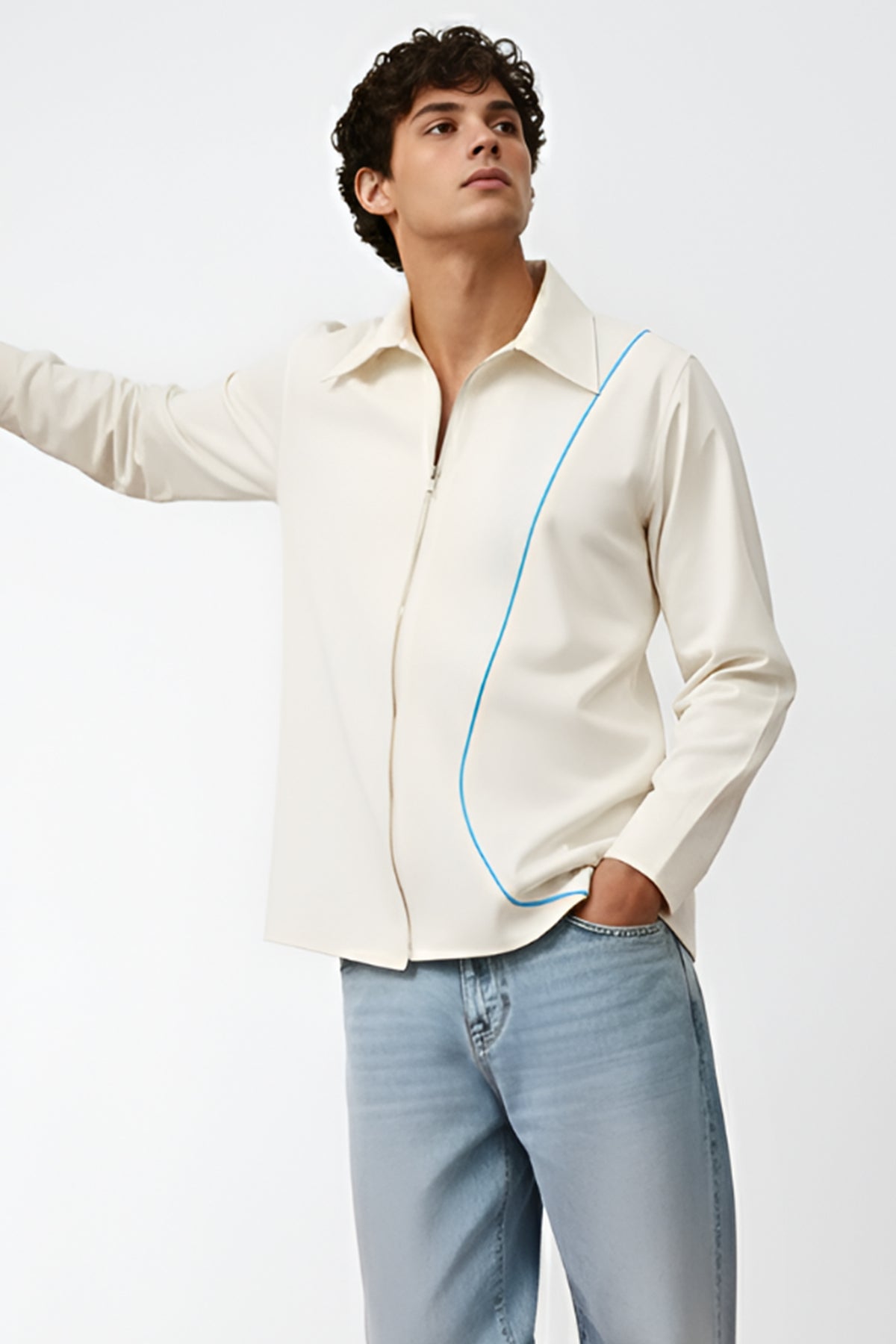 Ivory and tiffany blue twill shirt with classic collar, front curved zip, full sleeves and curved stripe detail in the front