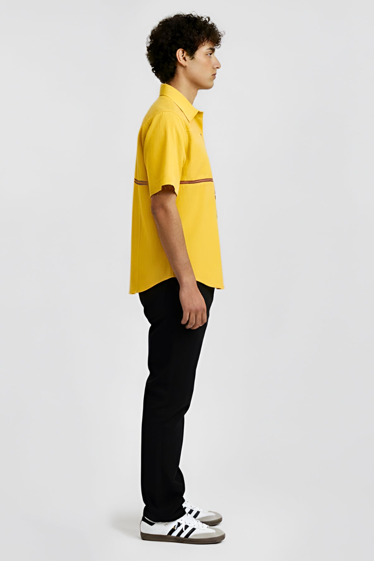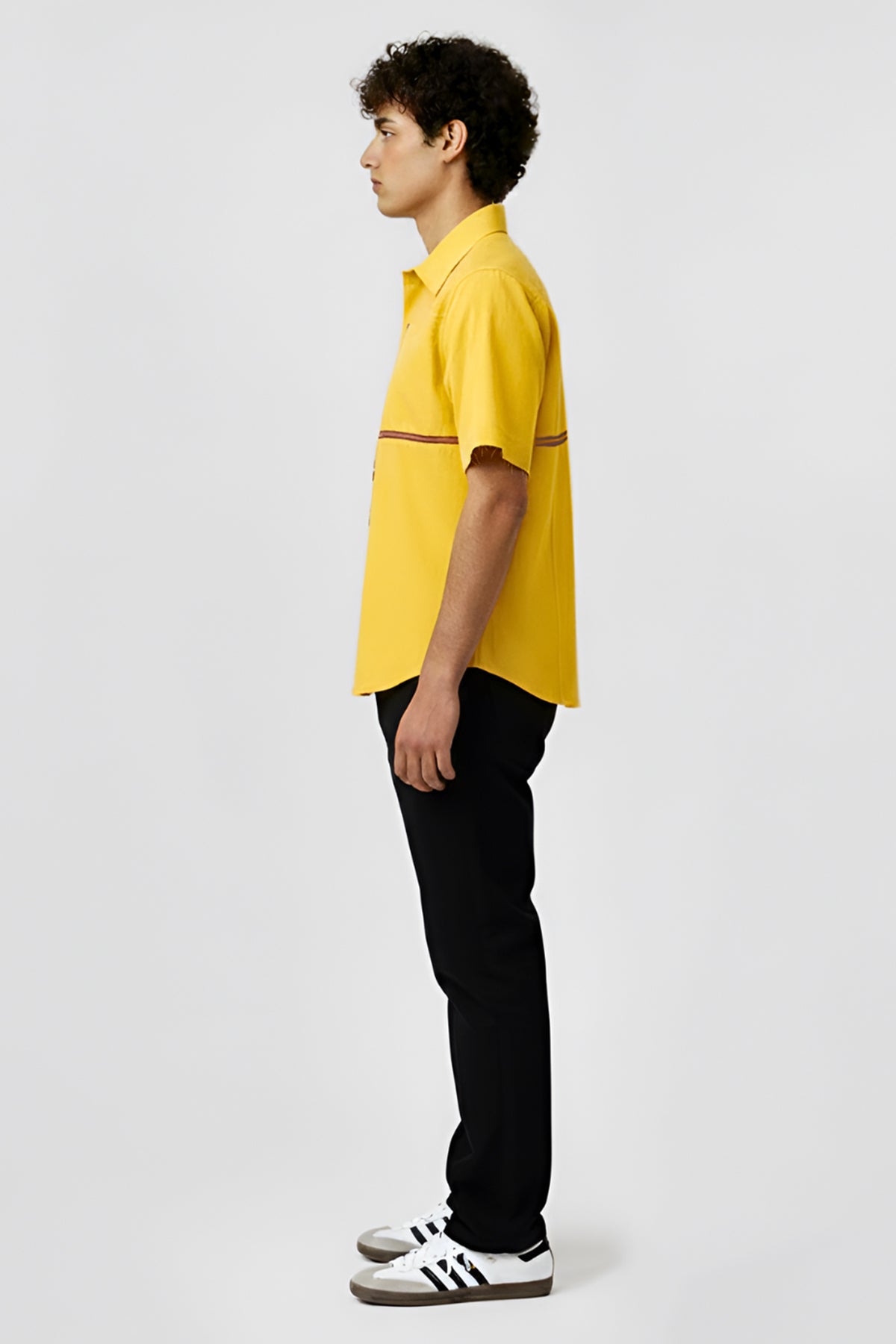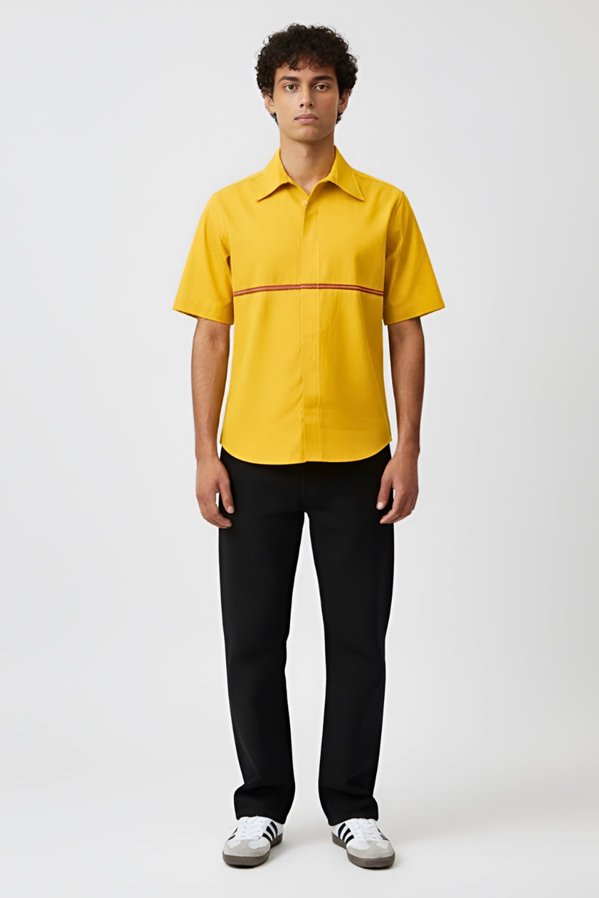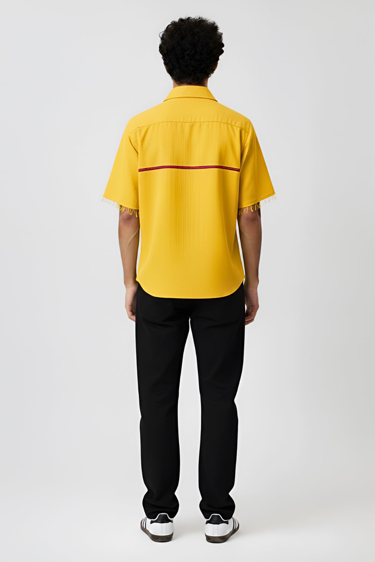 Yellow and tusacn red twill shirt with classic collar, button, half sleeves and horizontal stripe in the back