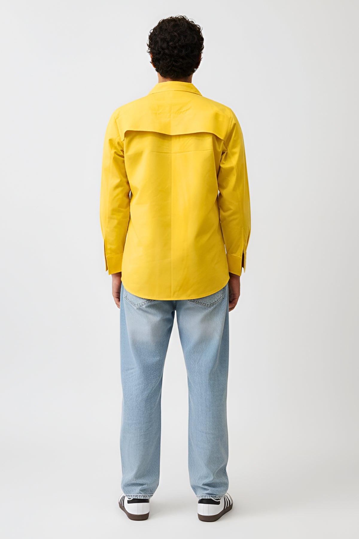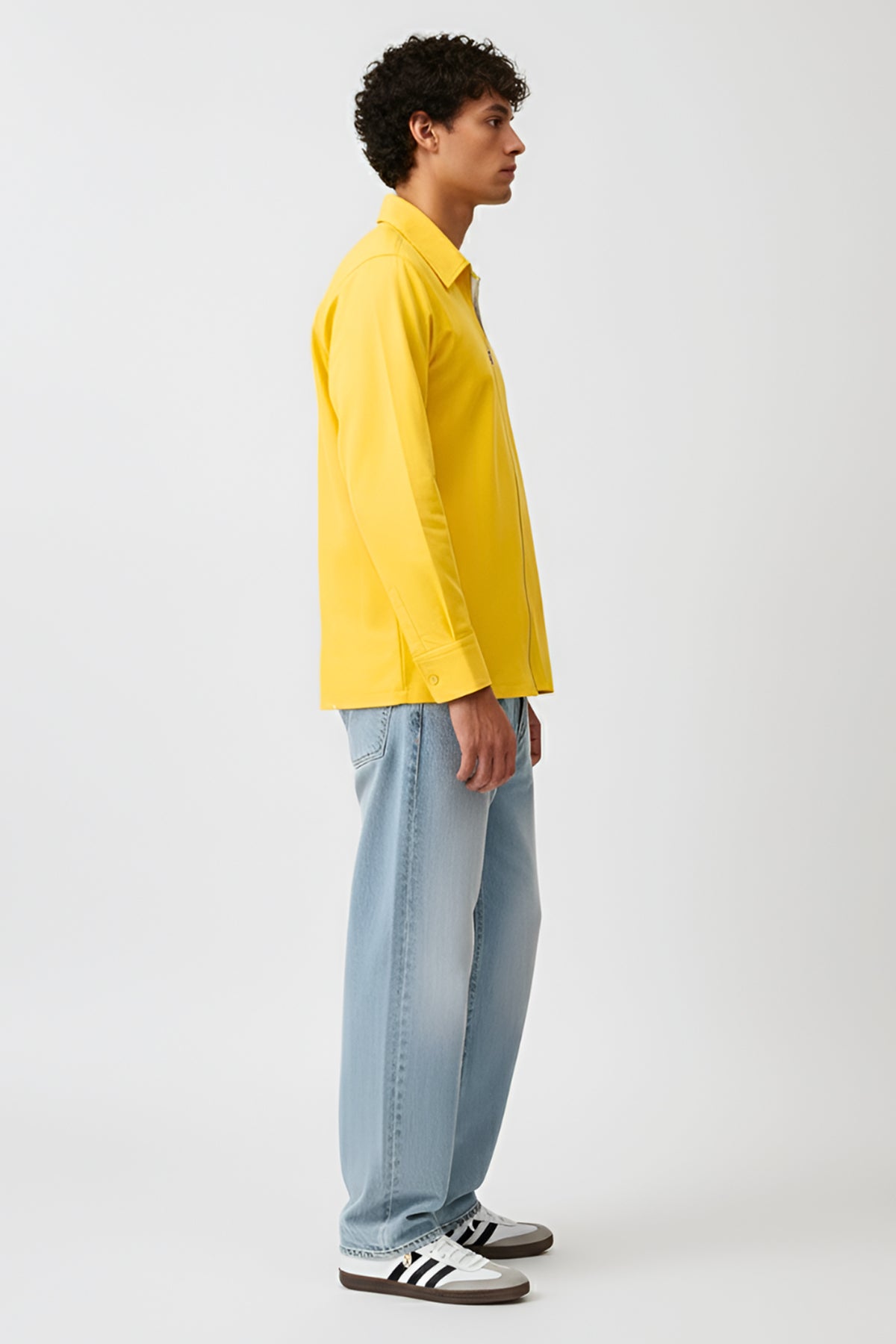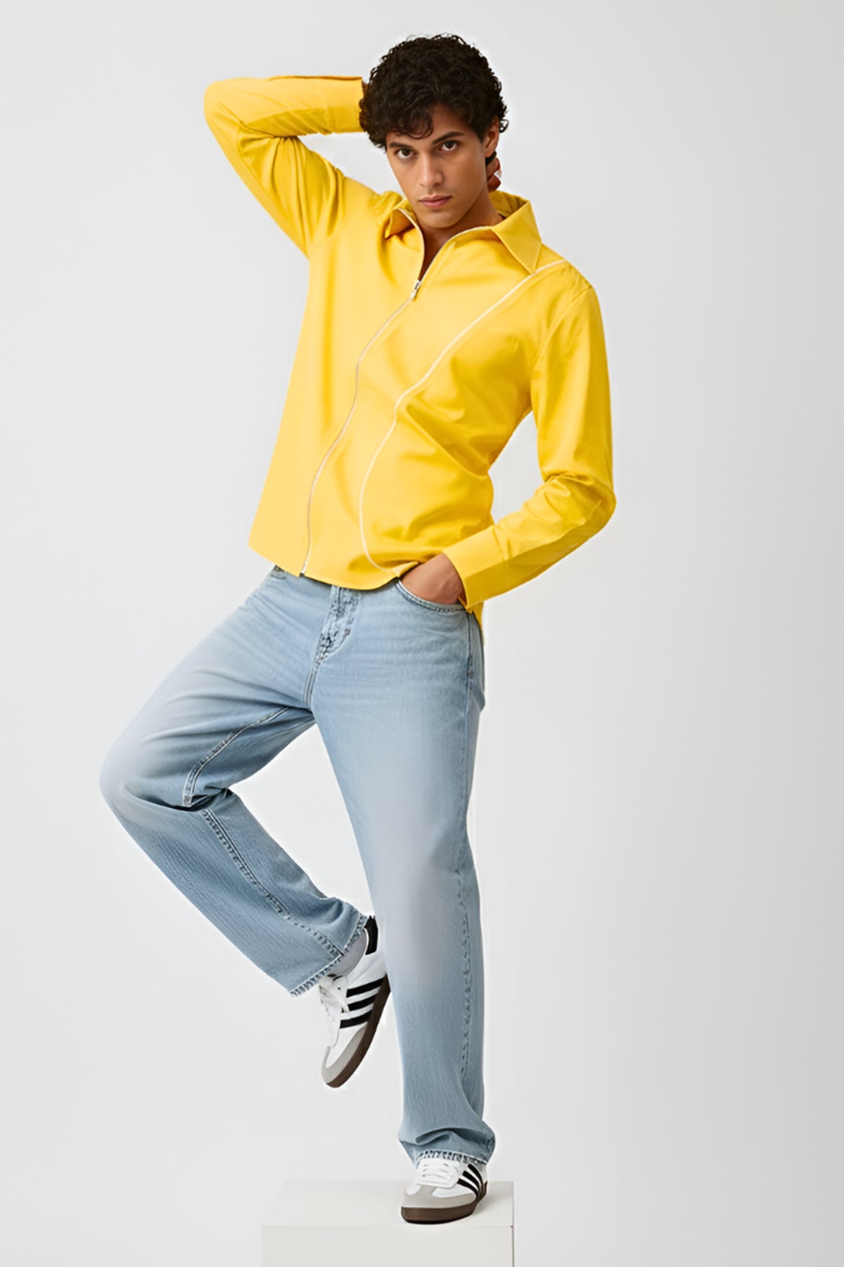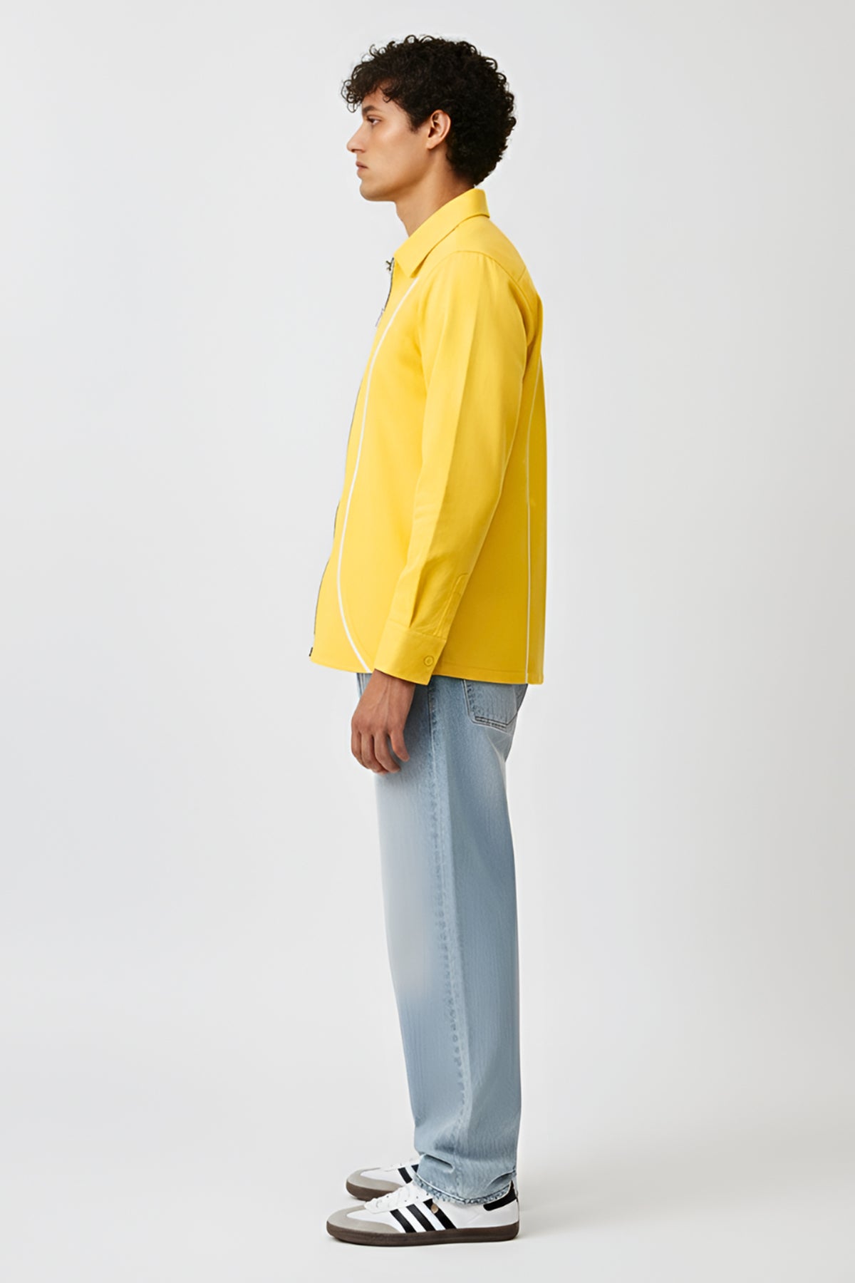 Yellow and Ivory twill shirt with classic collar, front curved zip, full sleeves and curved stripe detail in the front