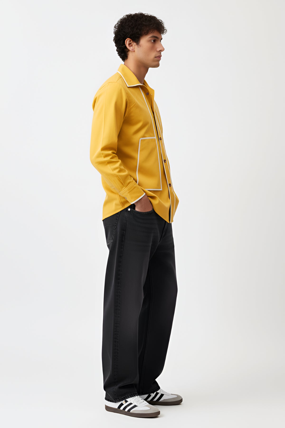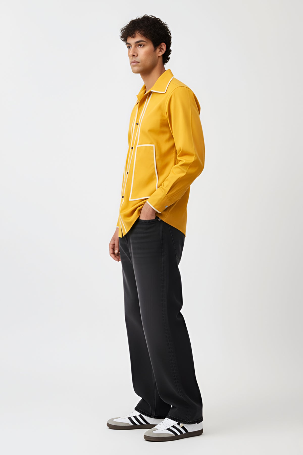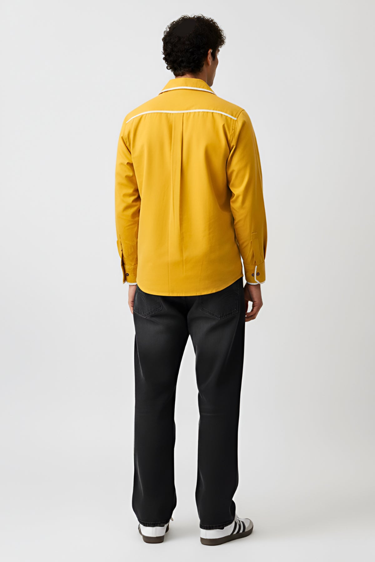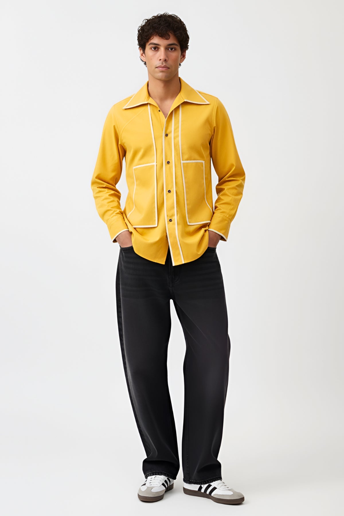 Yellow and ivory twill shirt featuring classic collar, button, full sleeves, two shoulder flaps with pockets and stripe details on the front