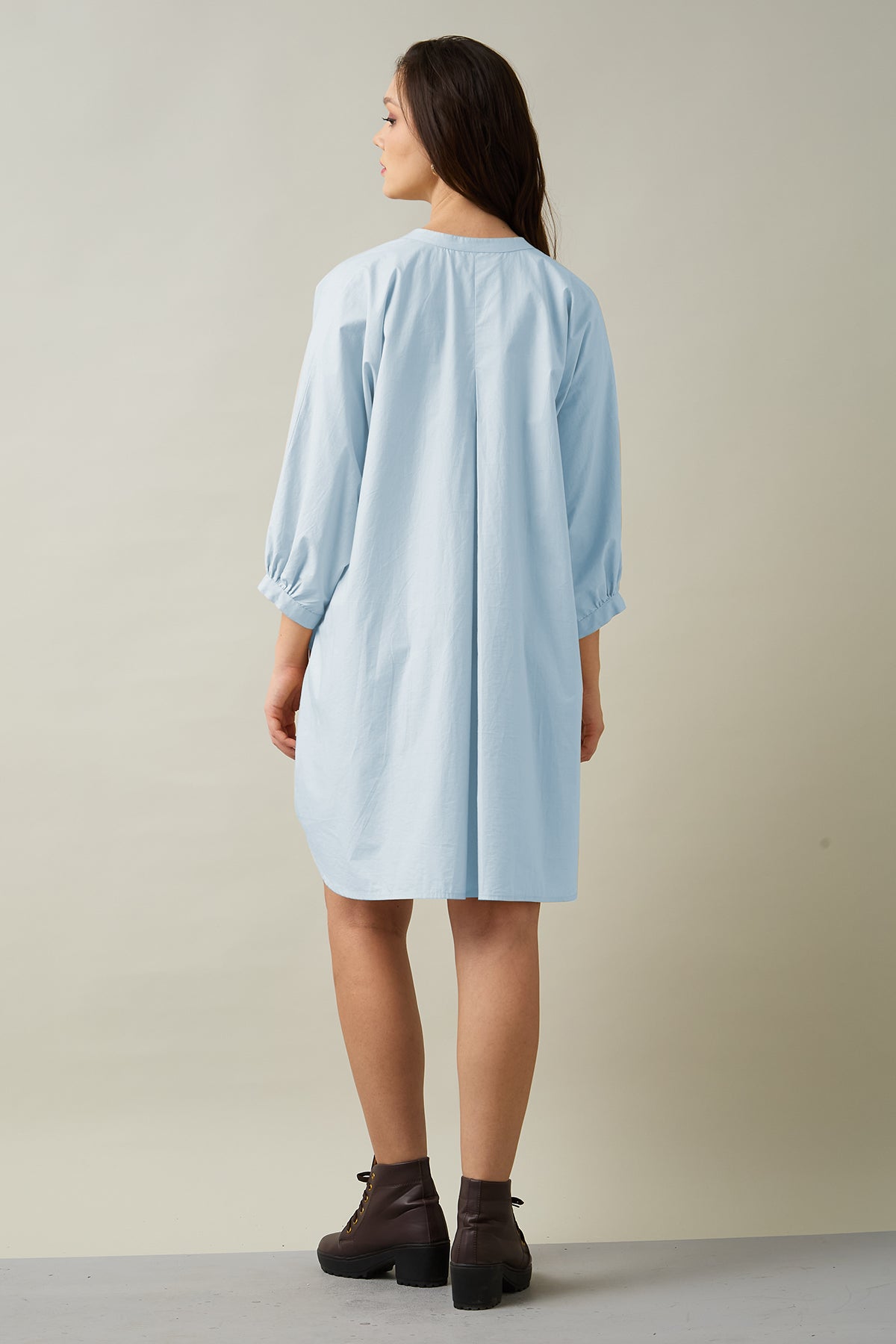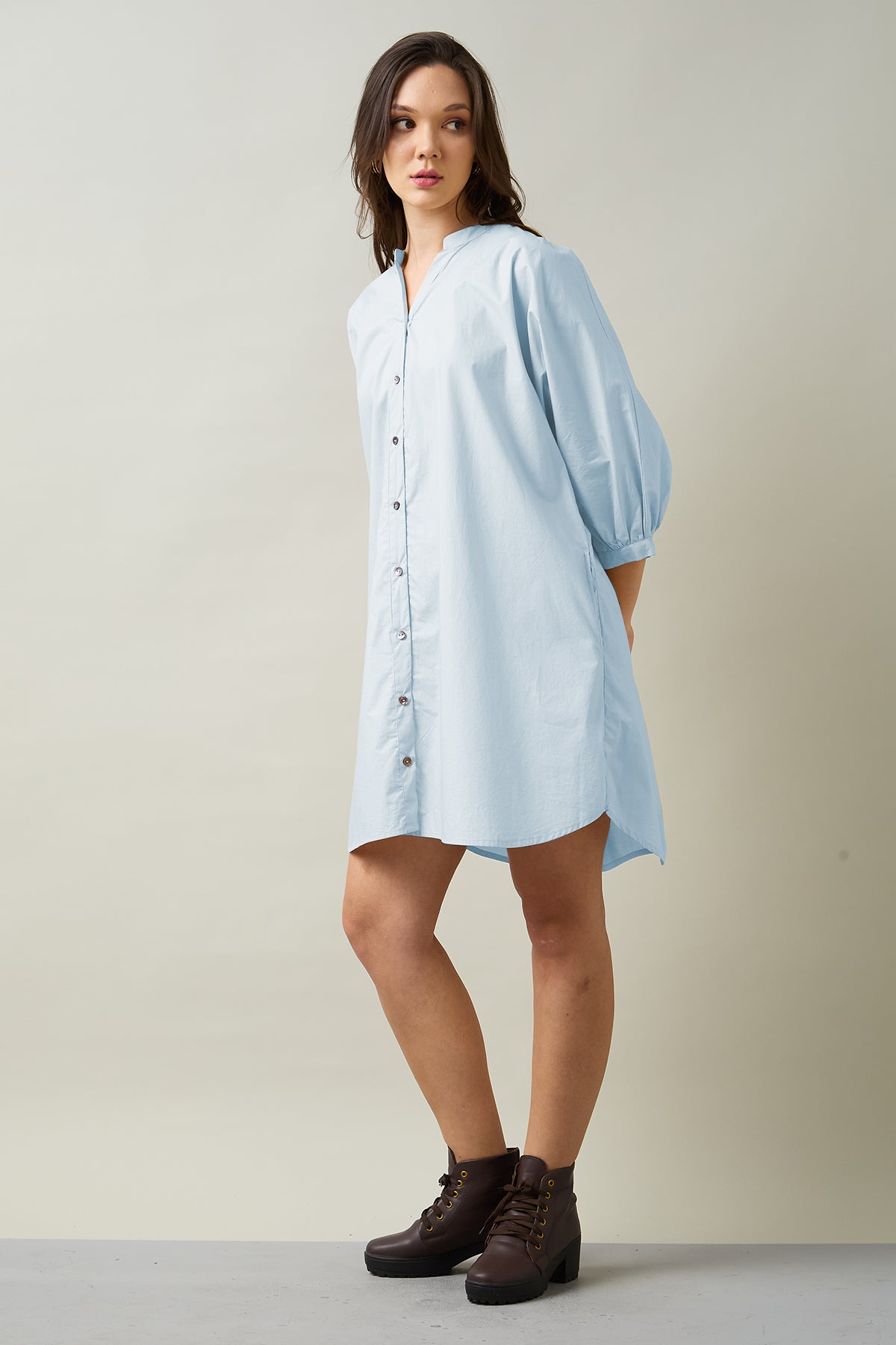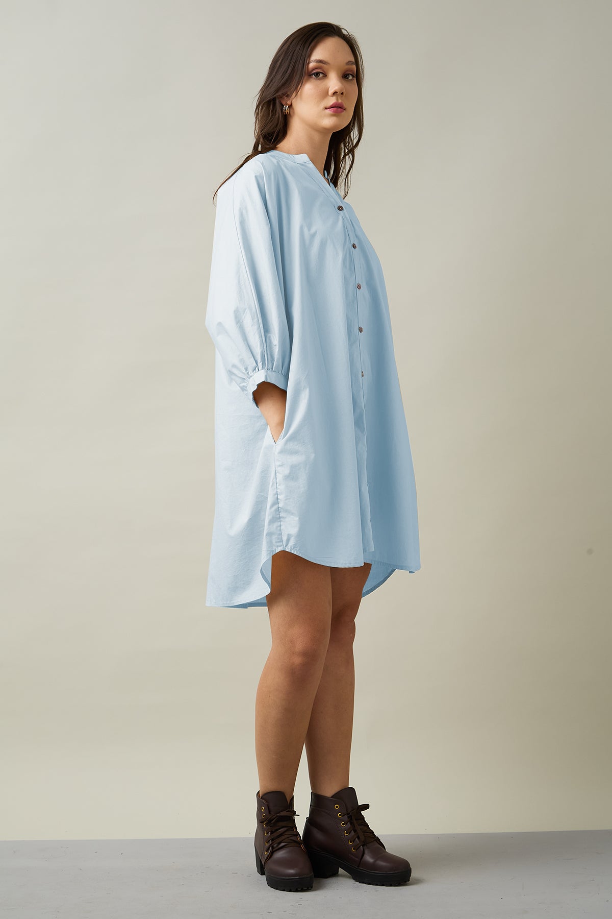 Powder blue 100% cotton poplin relaxed fit oversized shirt style dress with mandarin v-neck collar, side pockets, box pleat at back and buttons. The length of the dress is 37 inches