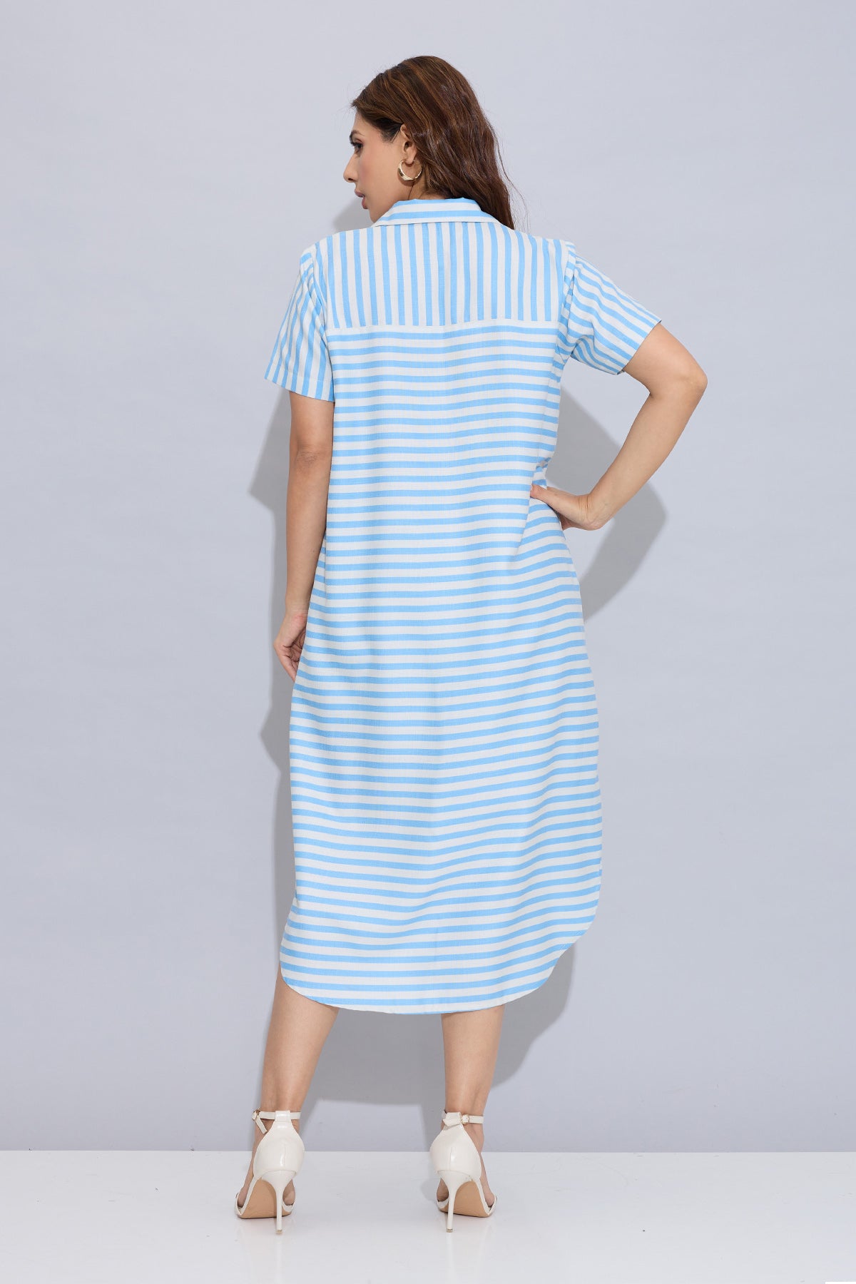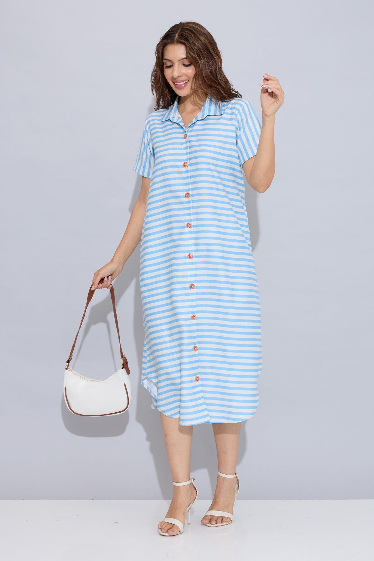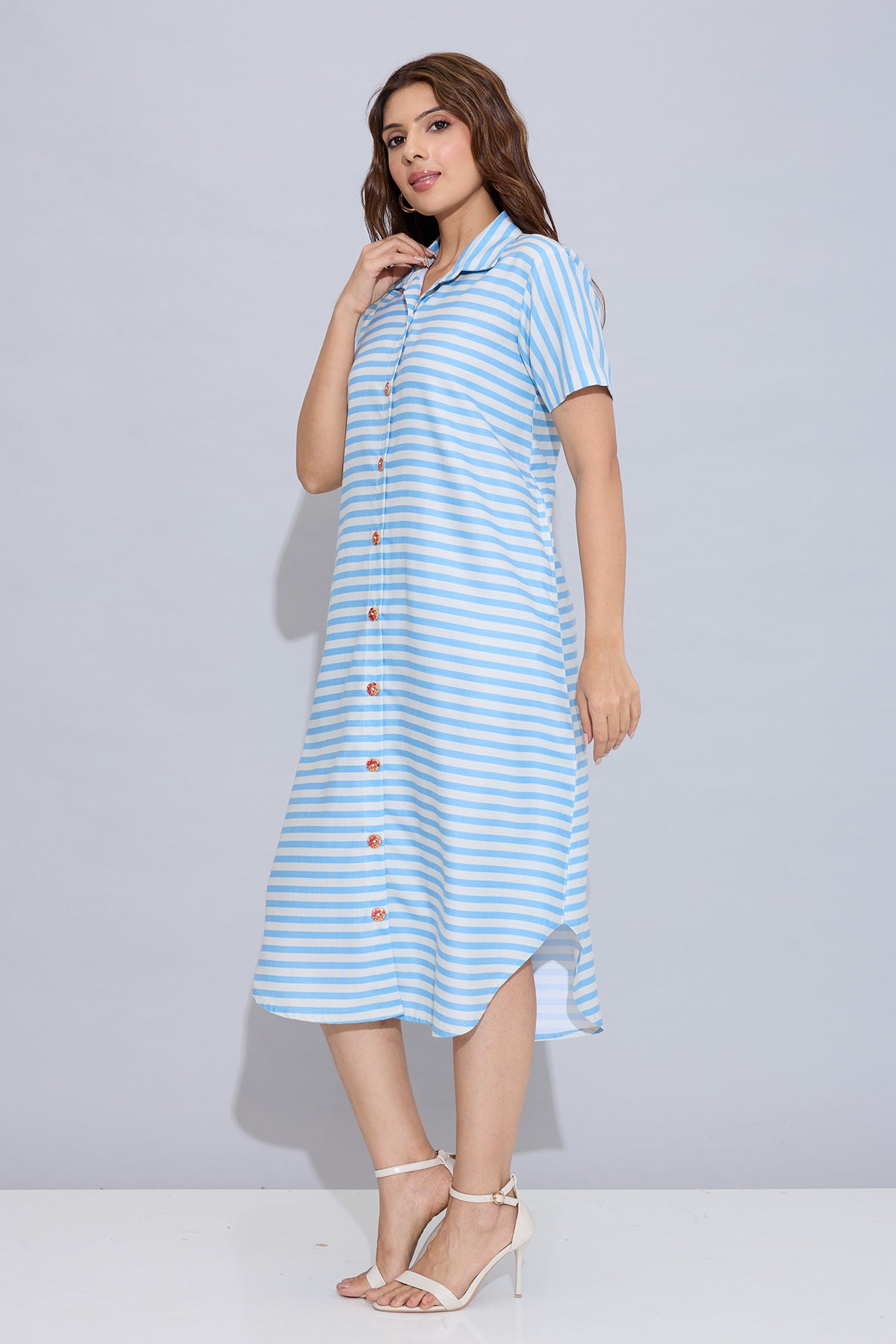 Blue cotton shirt dress with stripe pattern, wooden buttons, half sleeves and collar. The length of the dress is 45 inches