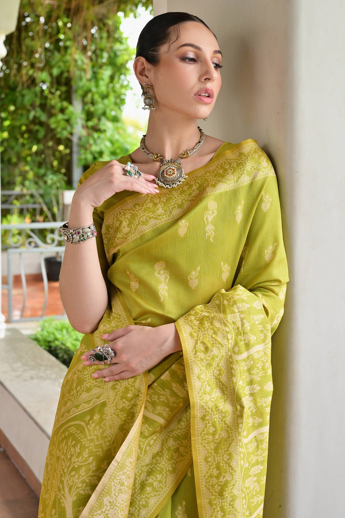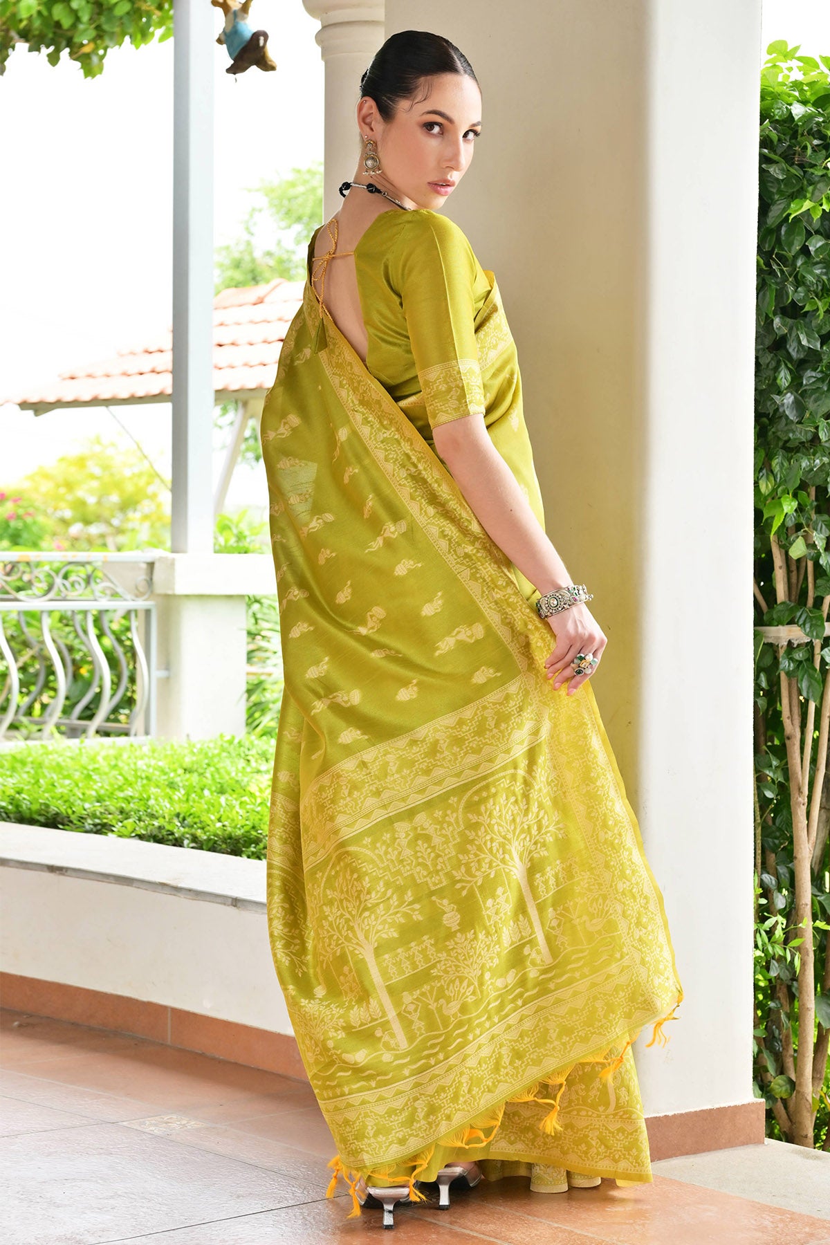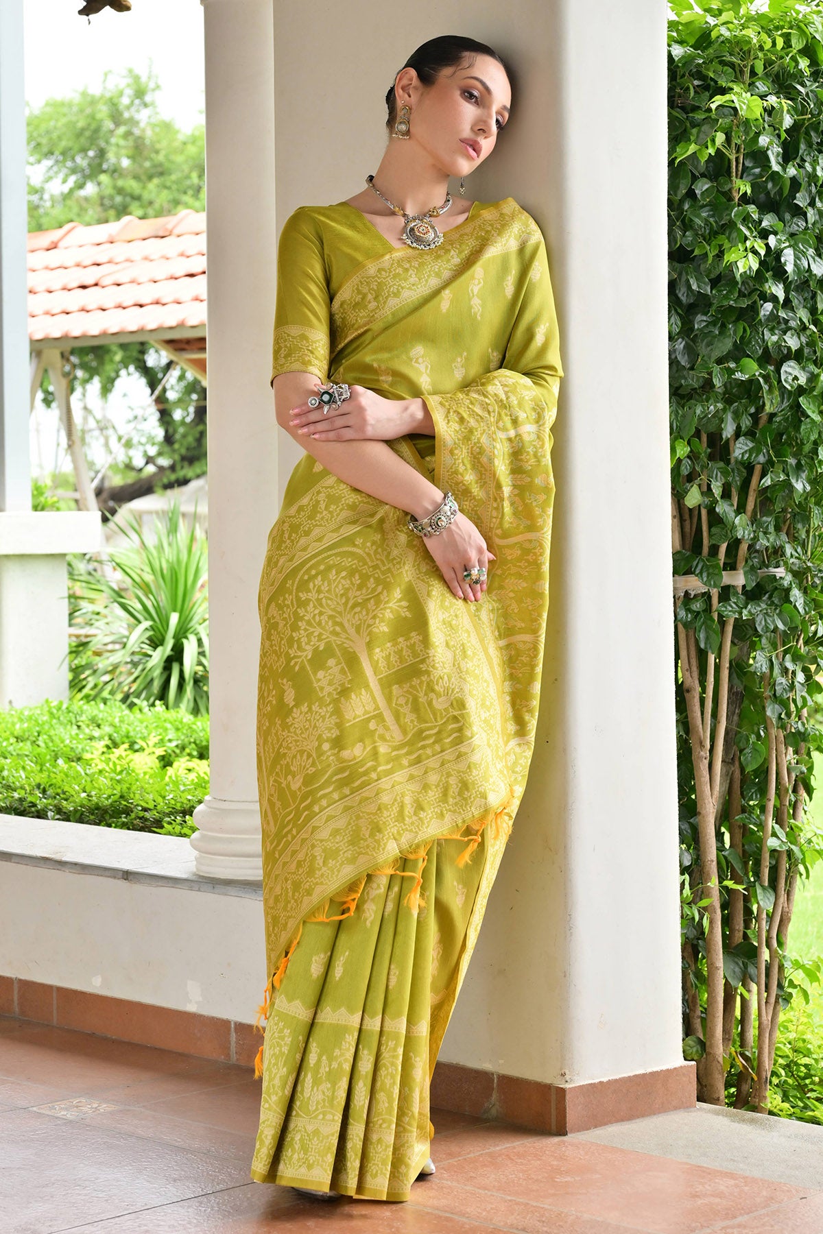 Buy Mehendi Raw Silk Woven Saree for women by Lili Lala Designer online available at scrollnshops