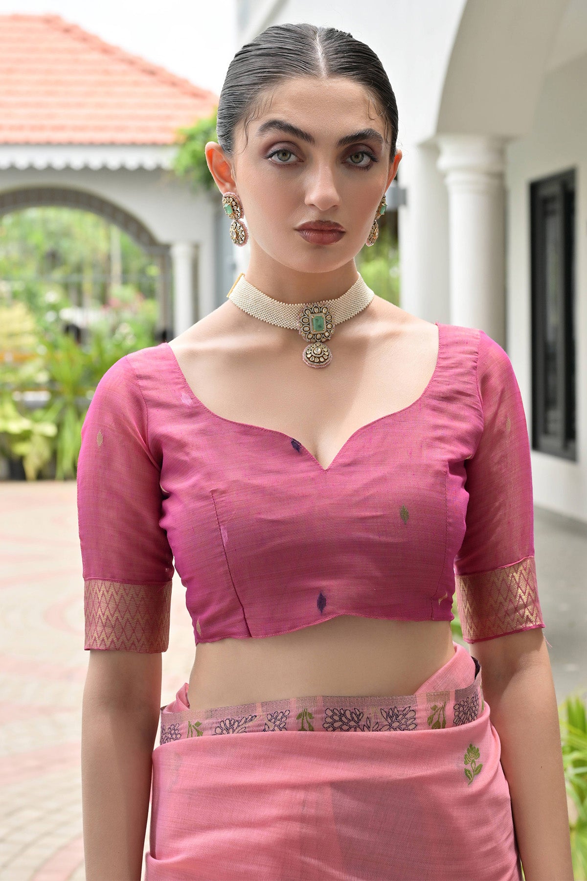 Pink and wine thread woven unique flower weaves pallu and border muga cotton saree with contrast unstitched blouse piece