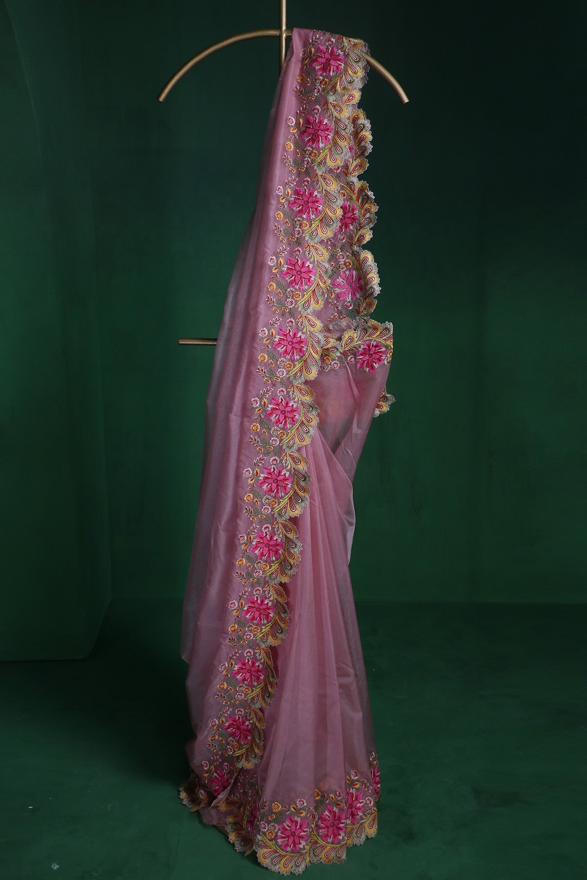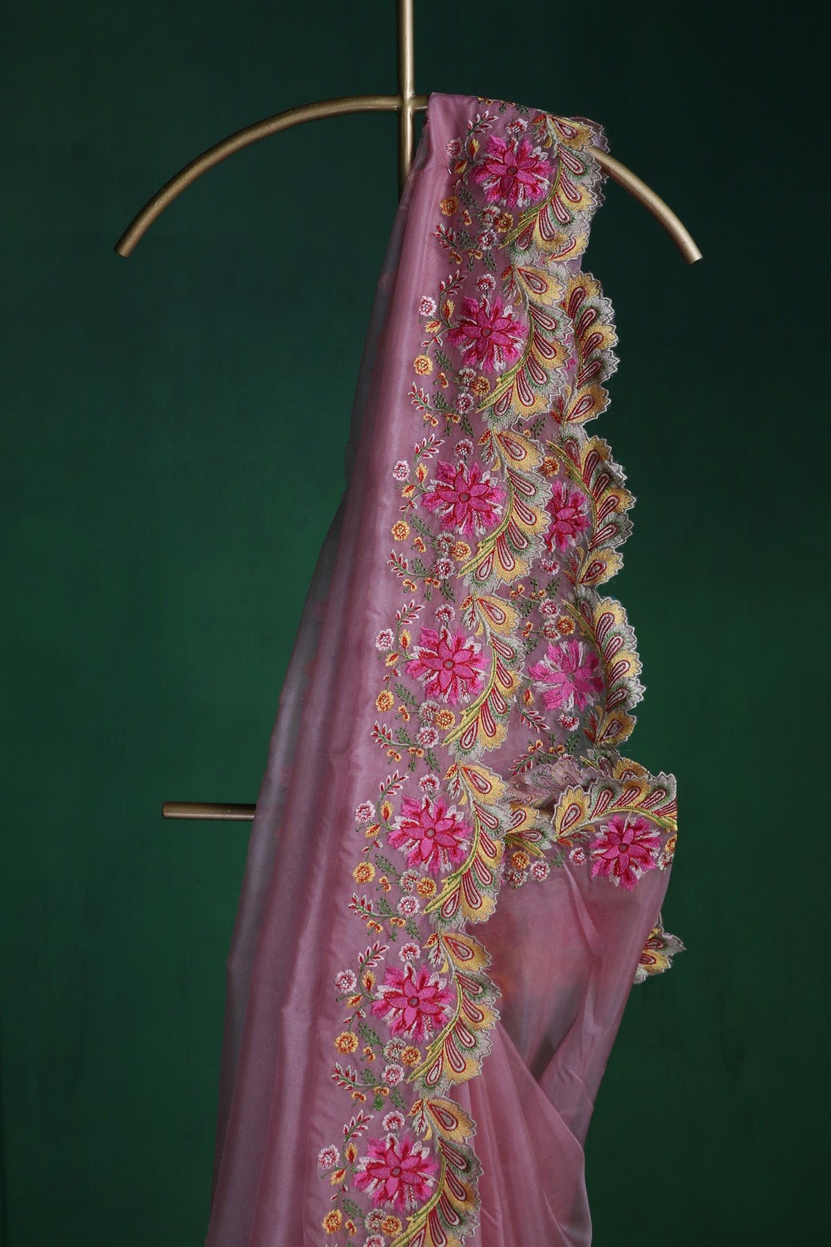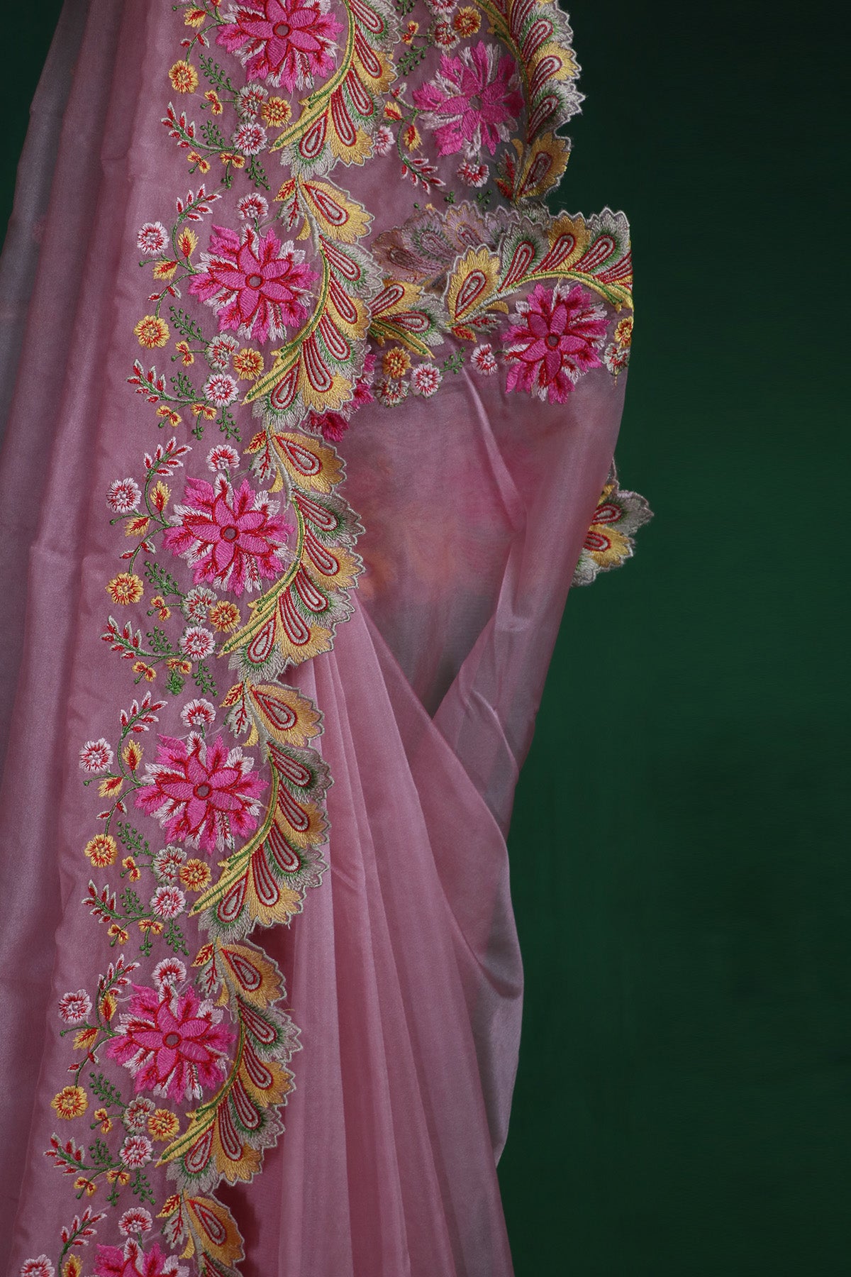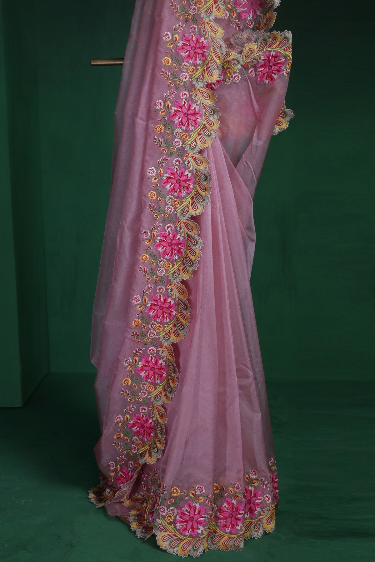 Pink tissue blend saree featuring machine embroidery floral border and thread work paired with unstitched blouse piece