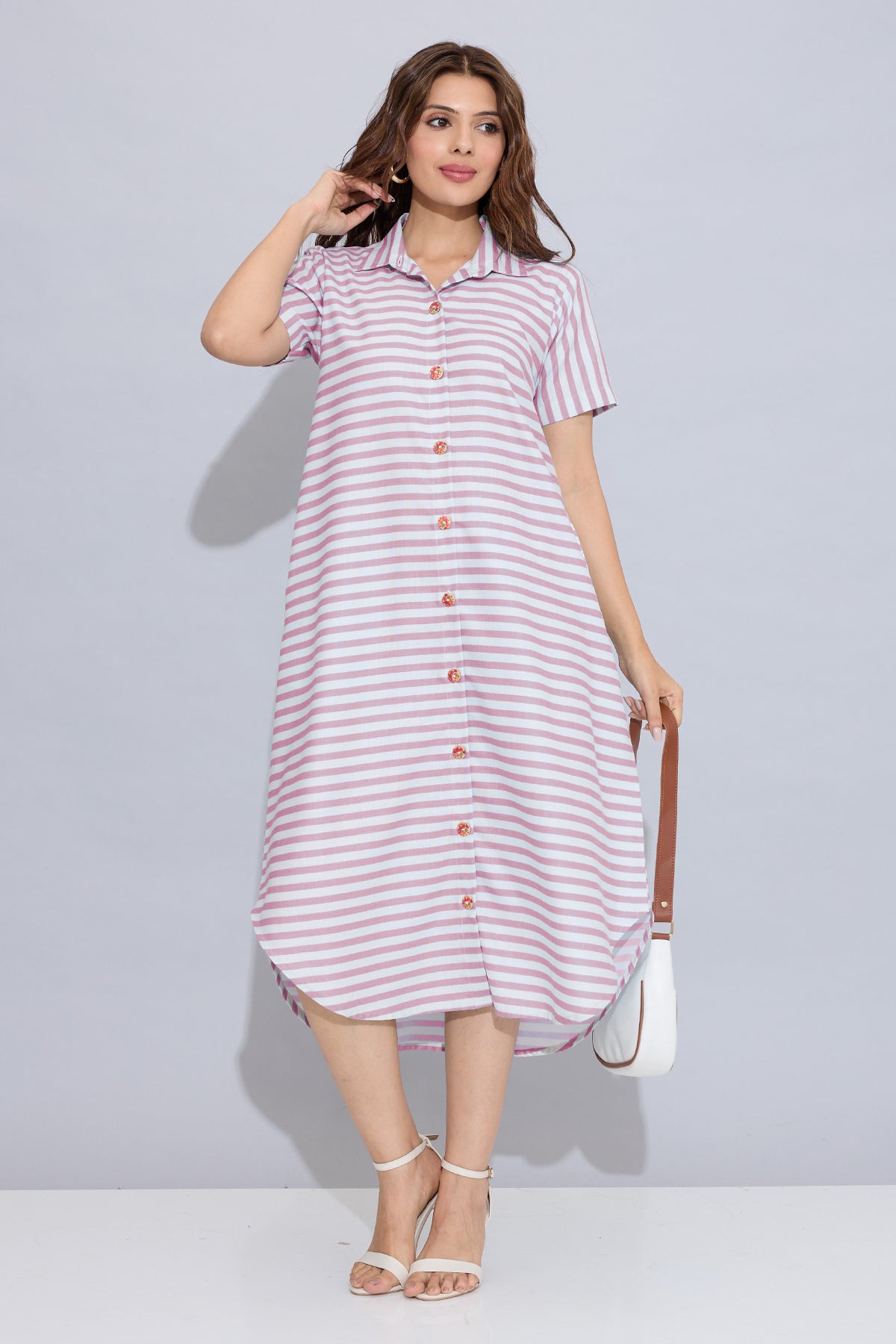 Onion pink cotton shirt dress with stripe pattern, wooden buttons, half sleeves and collar. The length of the dress is 45 inches